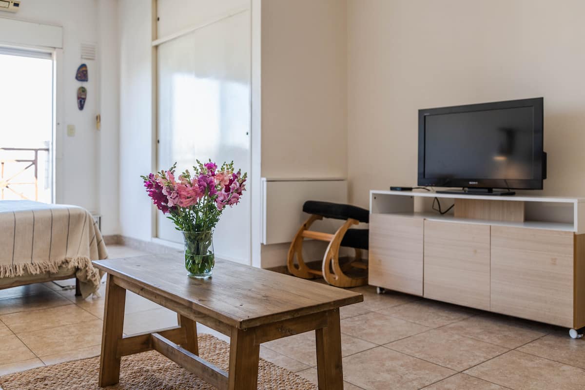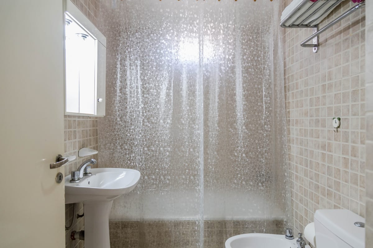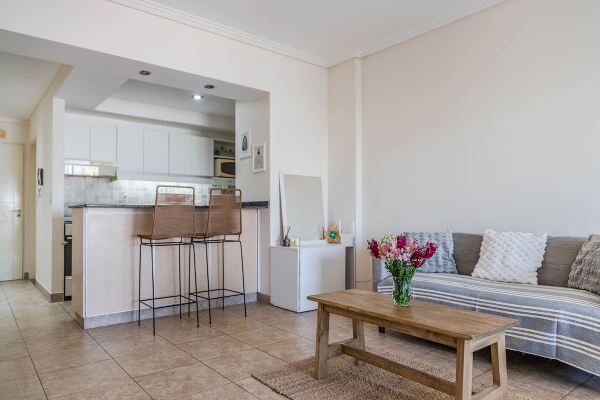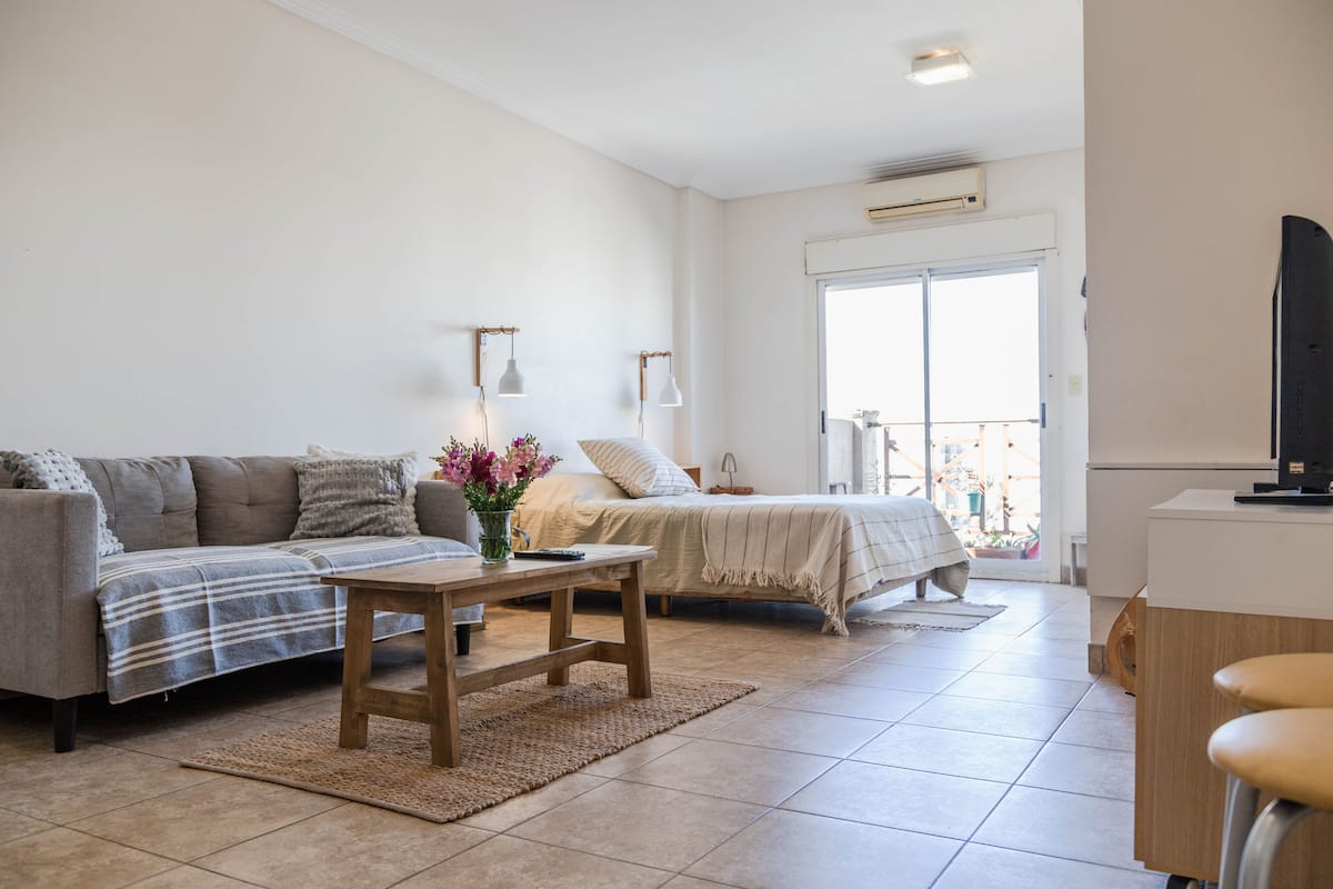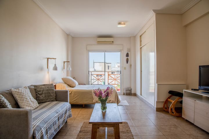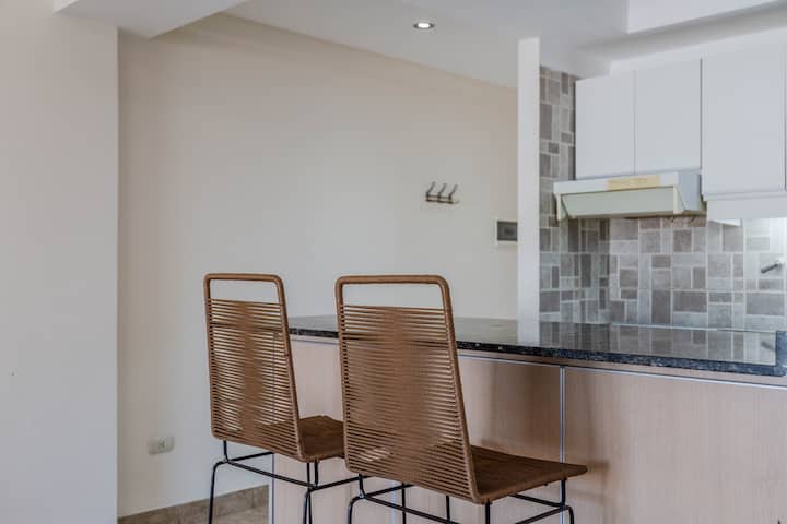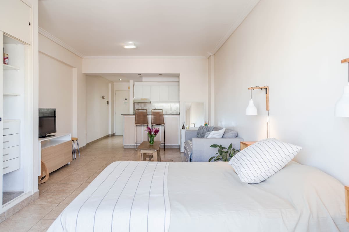 Kitnet mobiliada em Villa Santa Rita, com 1 cama de casal fixa, sala integrada com área de jantar, cozinha e dormitório no mesmo ambiente. Possui ar-condicionado (frio e quente), aquecimento eficiente e Wi‑Fi de alta velocidade. A cozinha tem geladeira, forno e fogão, além de micro-ondas, chaleira elétrica, cafeteira e torradeira; banheiro moderno com chuveiro e banheira e secador de cabelo. Há terraço com churrasqueira privativa e varanda com churrasqueira, além de vaga de garagem sem cobertura
