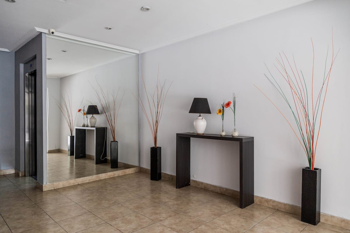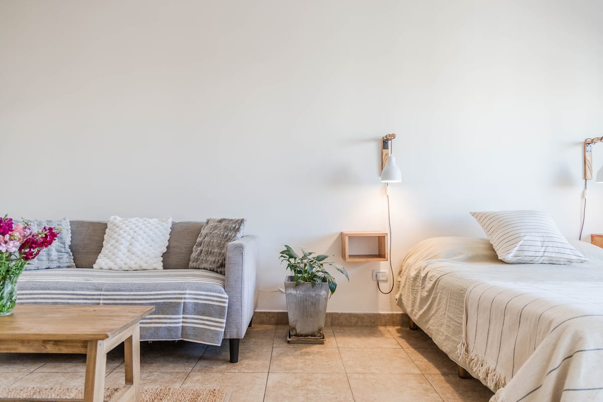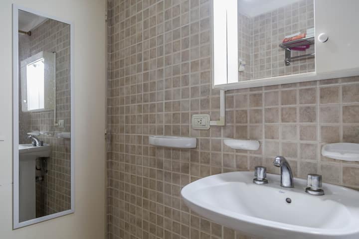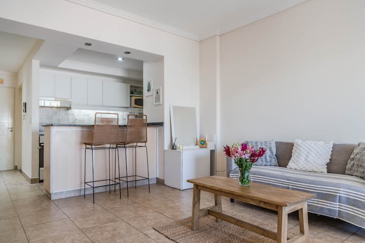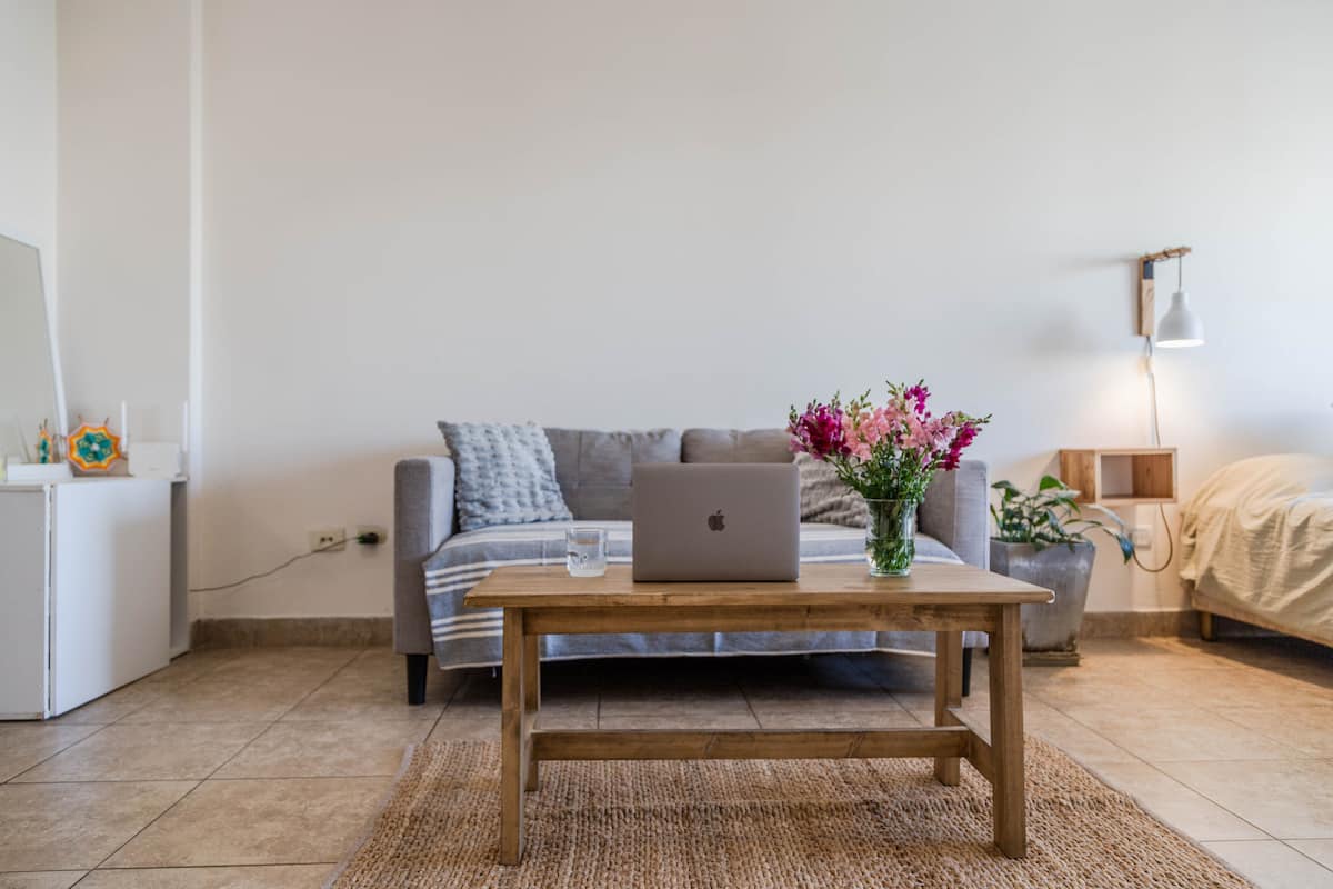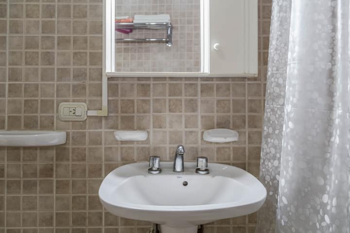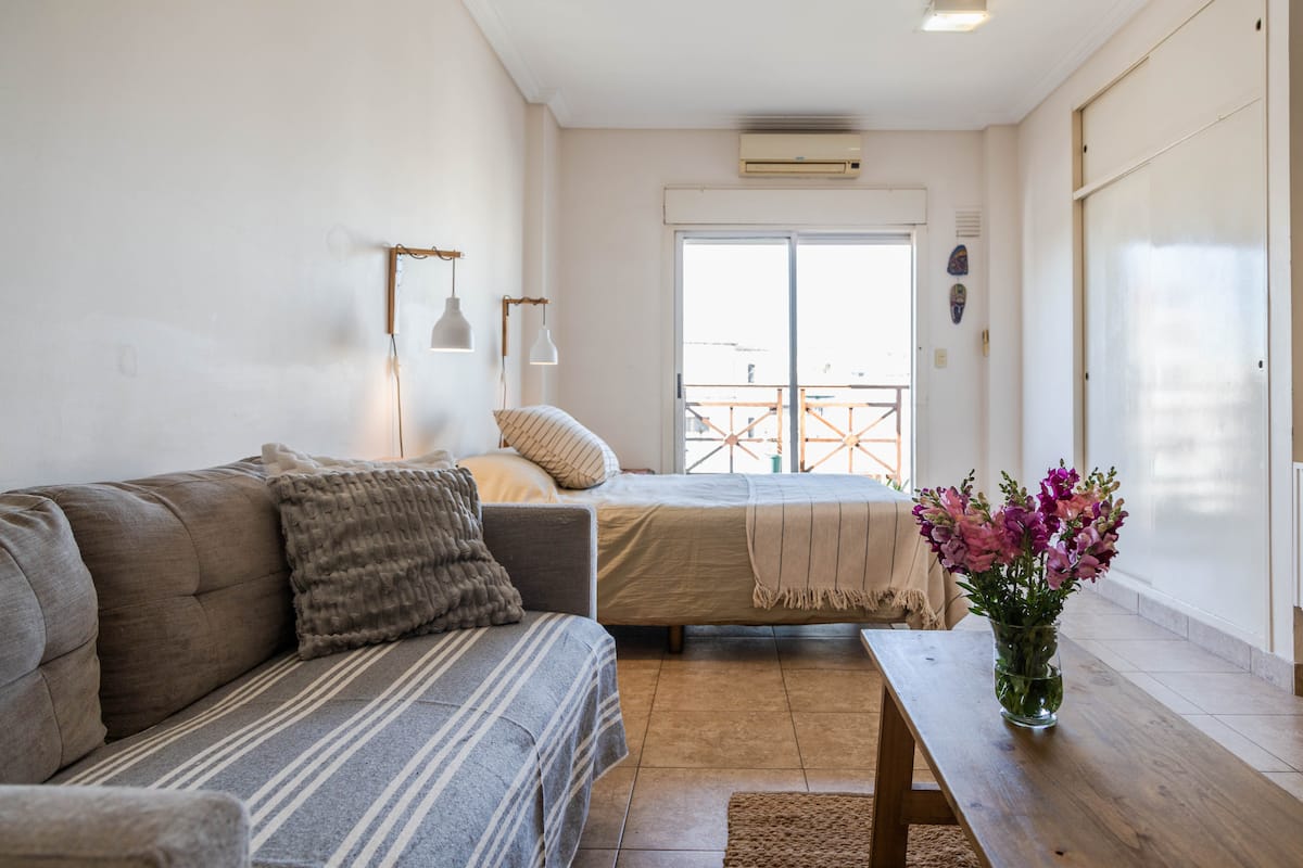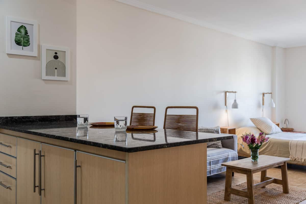 Kitnet mobiliada em Villa Santa Rita, com 1 cama de casal fixa, sala integrada com área de jantar, cozinha e dormitório no mesmo ambiente. Possui ar-condicionado (frio e quente), aquecimento eficiente e Wi‑Fi de alta velocidade. A cozinha tem geladeira, forno e fogão, além de micro-ondas, chaleira elétrica, cafeteira e torradeira; banheiro moderno com chuveiro e banheira e secador de cabelo. Há terraço com churrasqueira privativa e varanda com churrasqueira, além de vaga de garagem sem cobertura