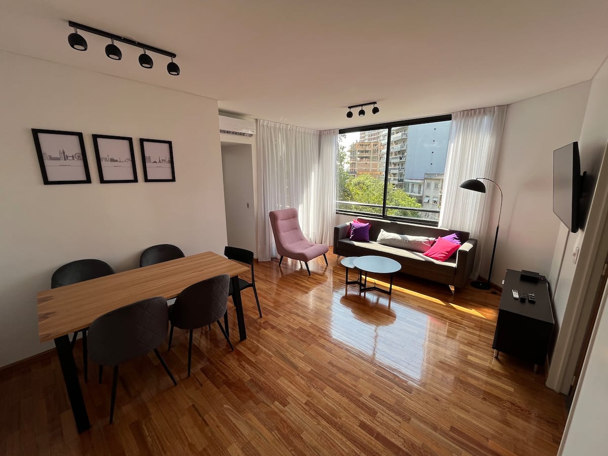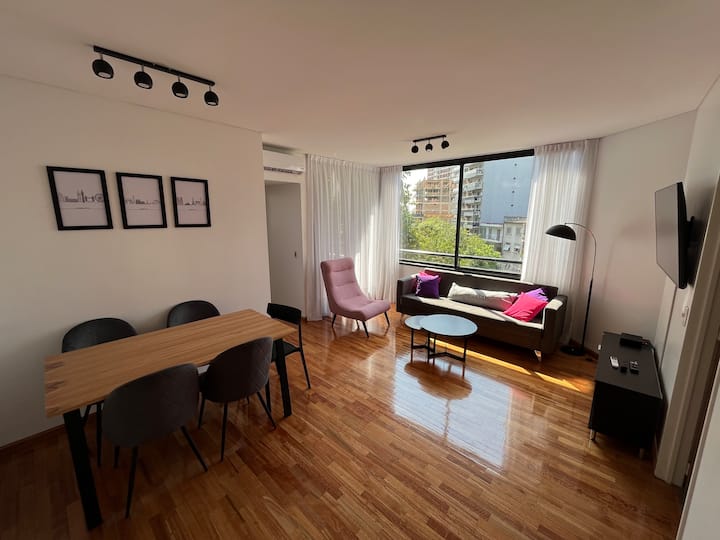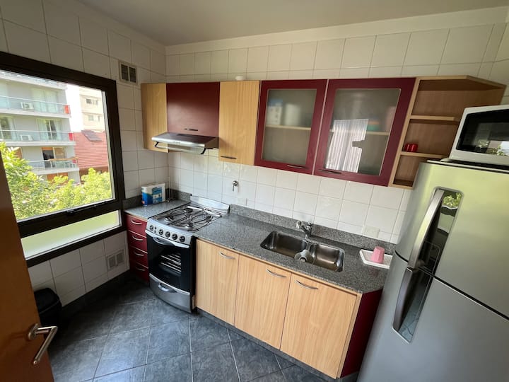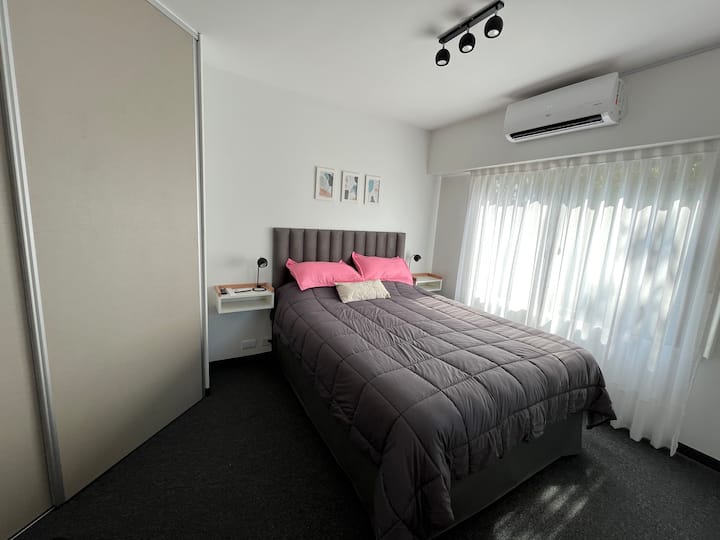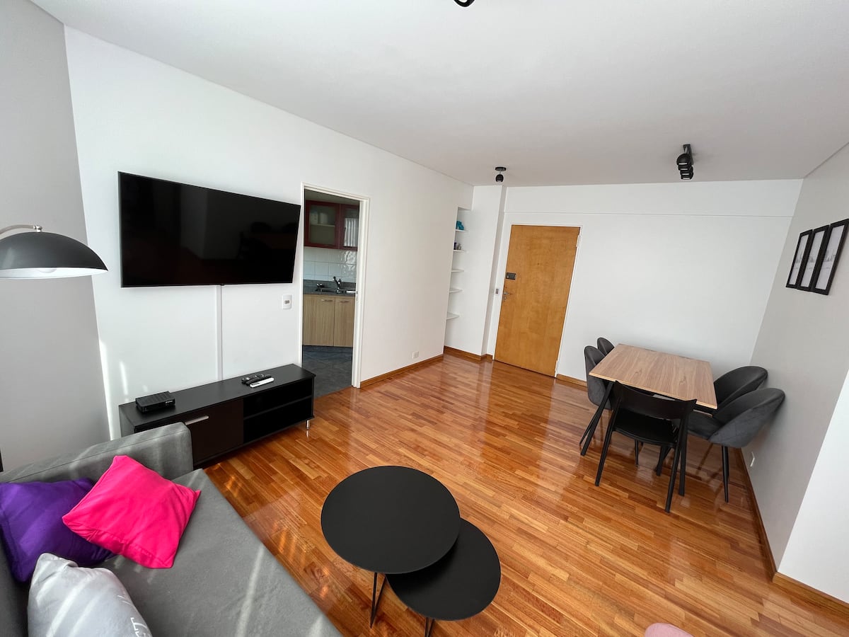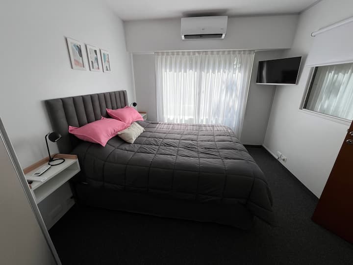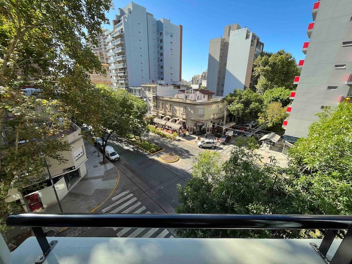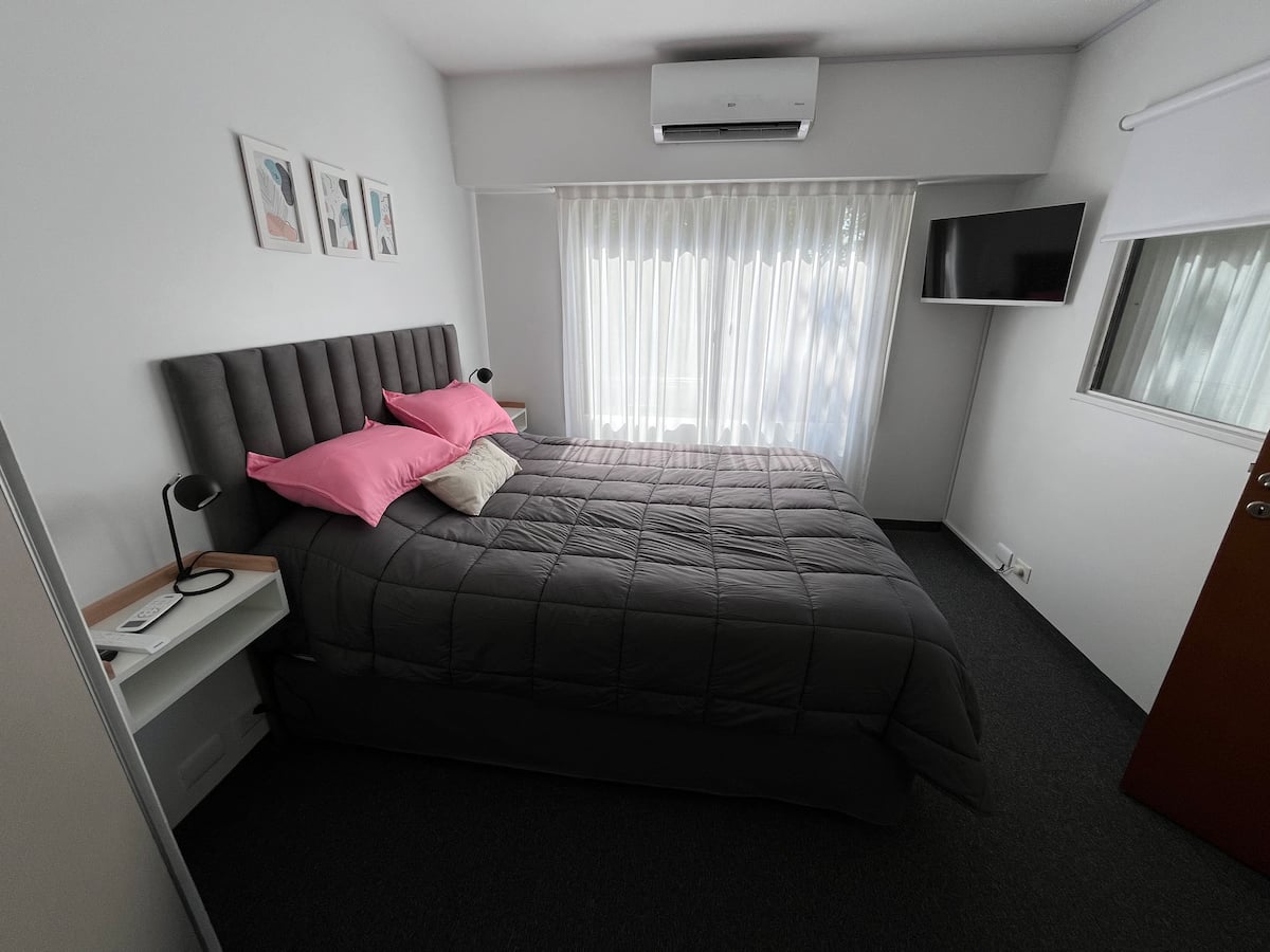 Apartamento com vista de esquina para o Boulevard Mendoza e acesso a varanda. Está em um prédio moderno, com elevadores e acessos adaptados para pessoas com mobilidade reduzida. O imóvel é equipado com 2 TVs de 50" e 32", lava-louças e 2 ar-condicionados split quente/frio. Os hóspedes têm acesso ao apartamento inteiro, incluindo a varanda.