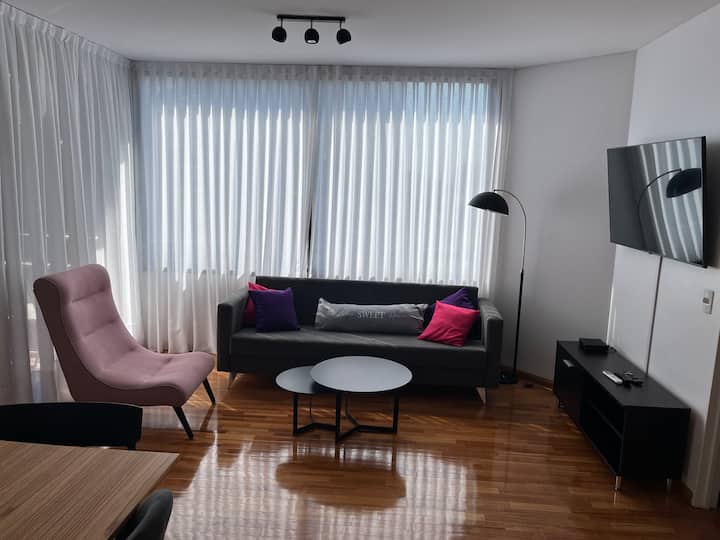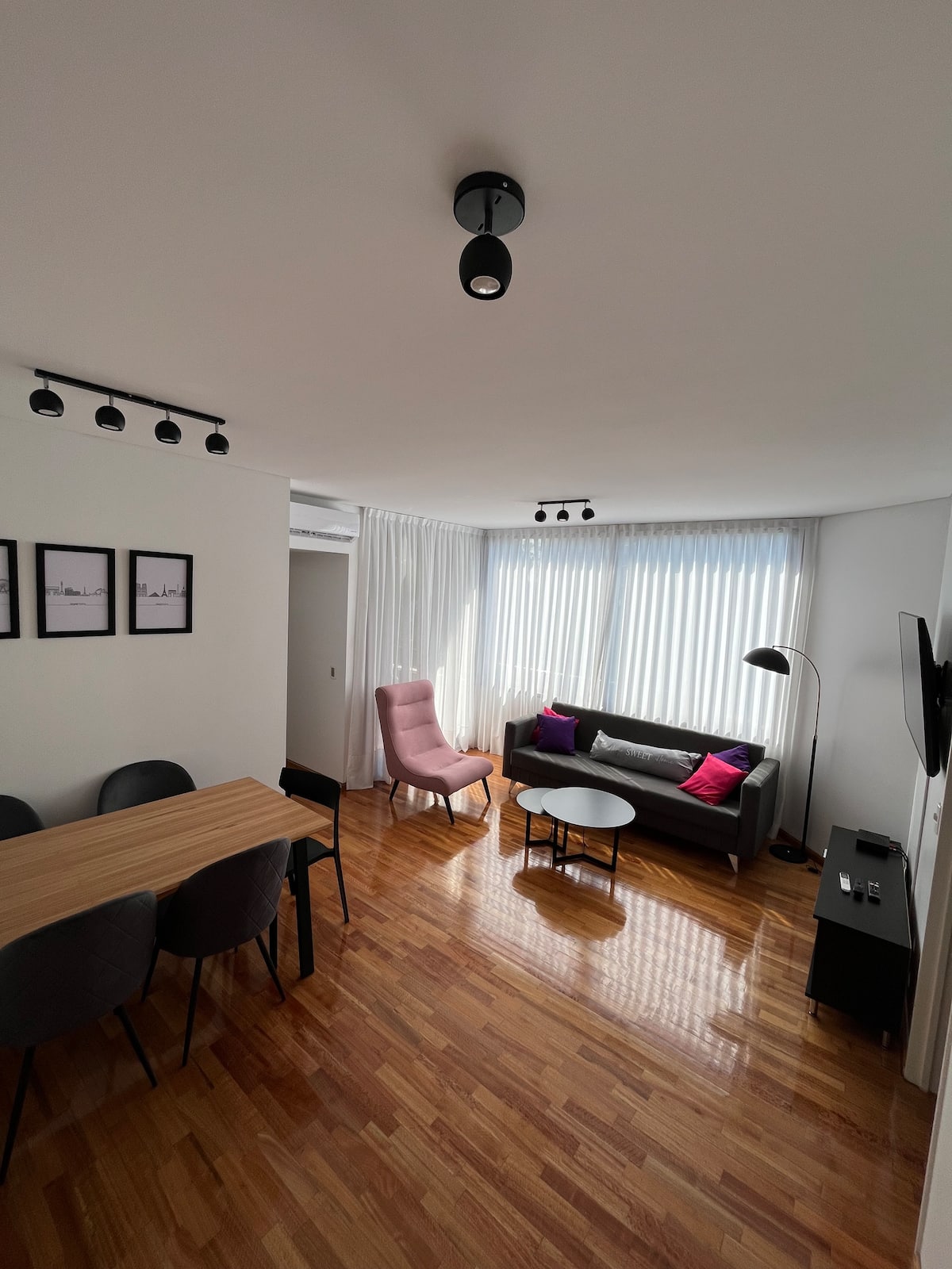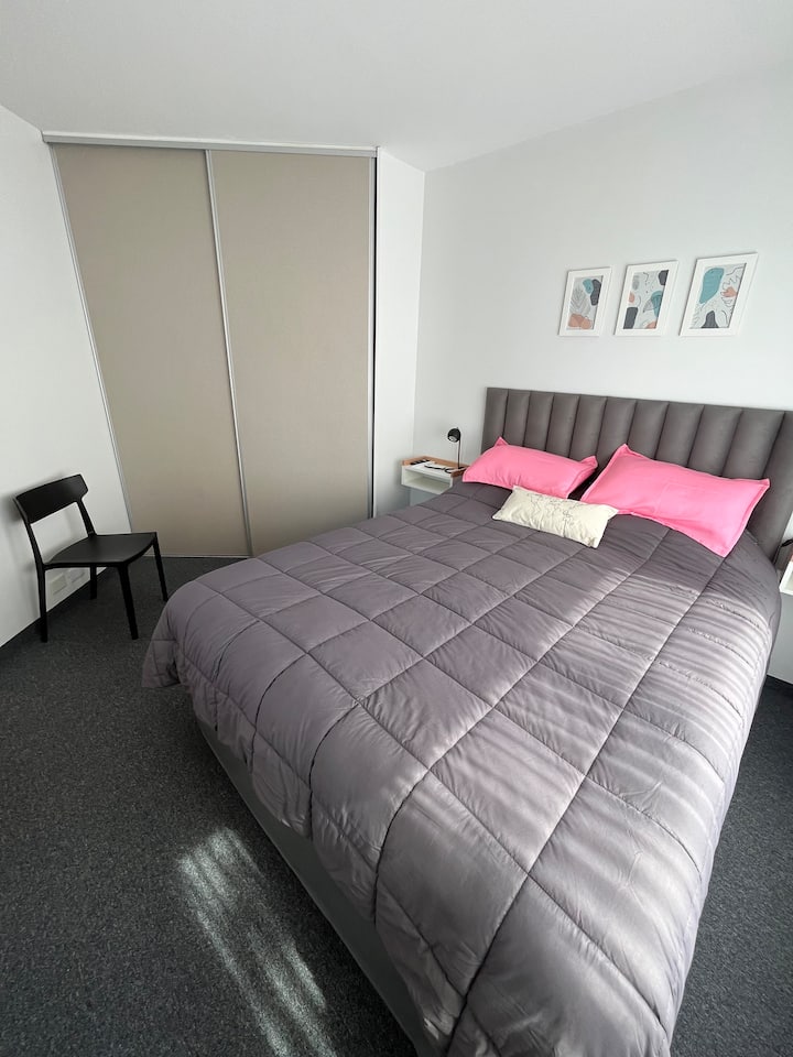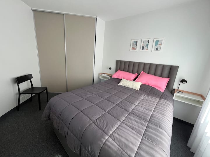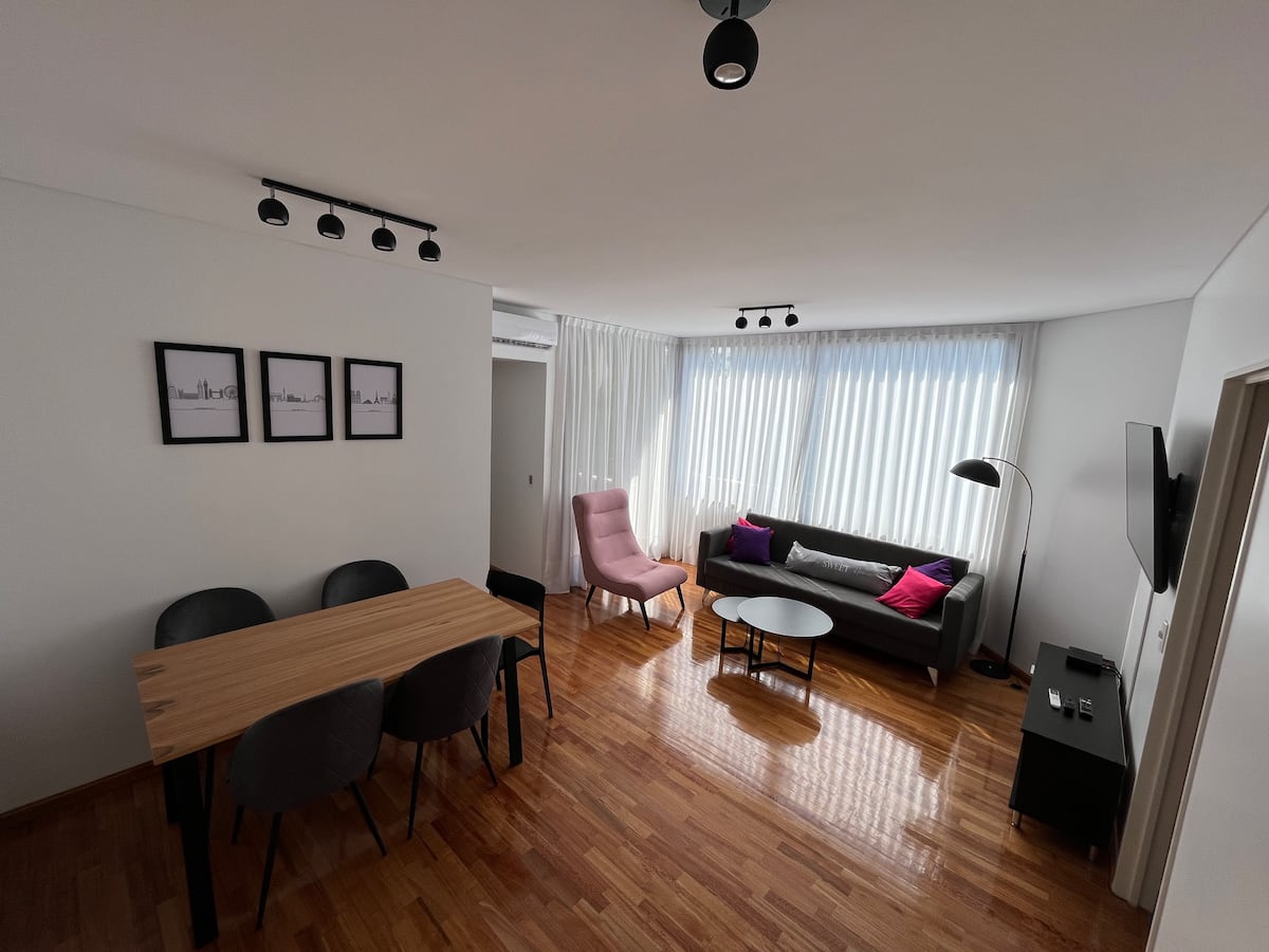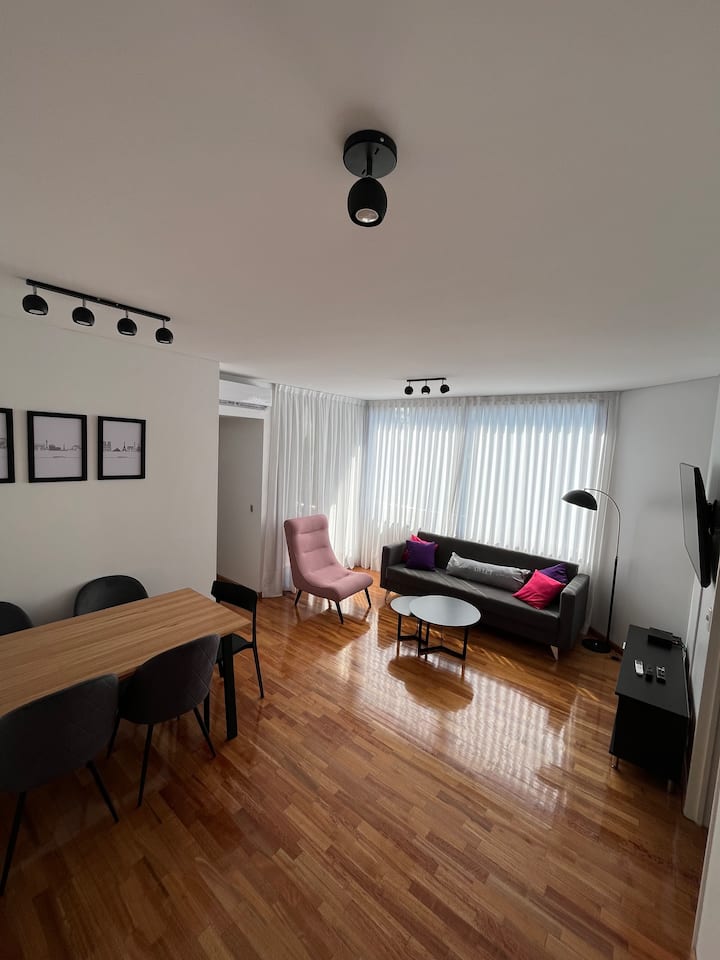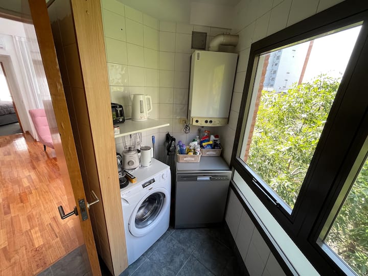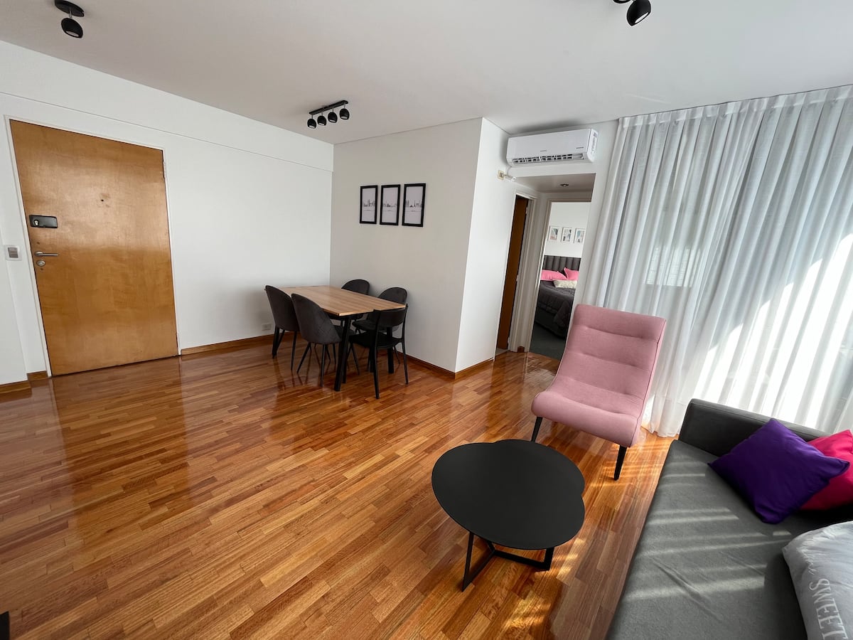Apartamento com vista de esquina para o Boulevard Mendoza e acesso a varanda. Está em um prédio moderno, com elevadores e acessos adaptados para pessoas com mobilidade reduzida. O imóvel é equipado com 2 TVs de 50" e 32", lava-louças e 2 ar-condicionados split quente/frio. Os hóspedes têm acesso ao apartamento inteiro, incluindo a varanda.