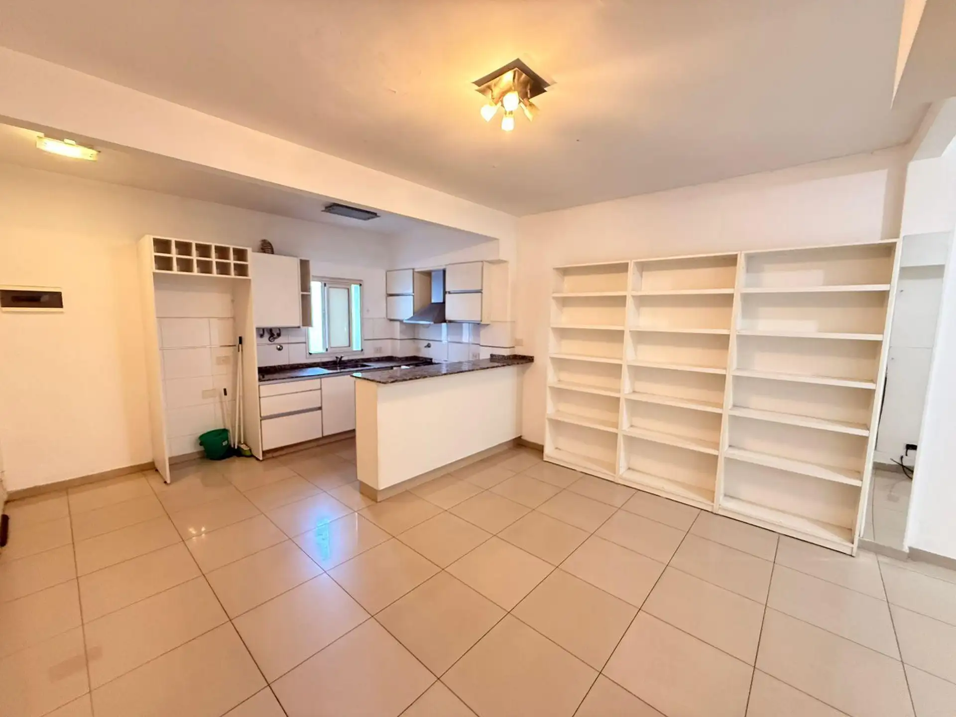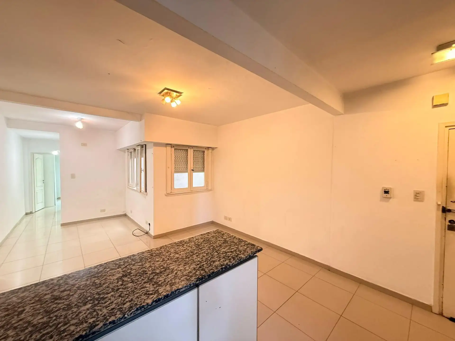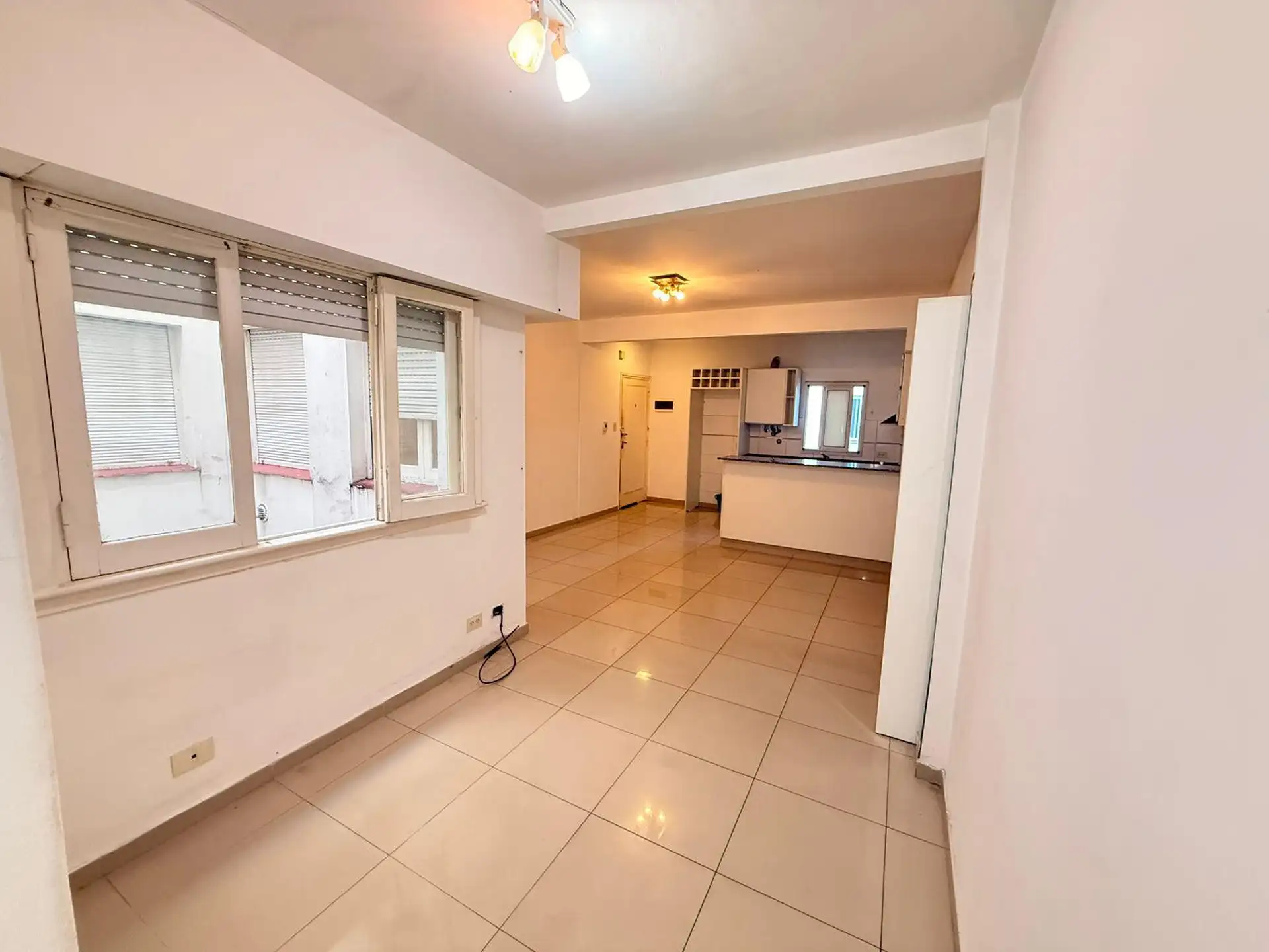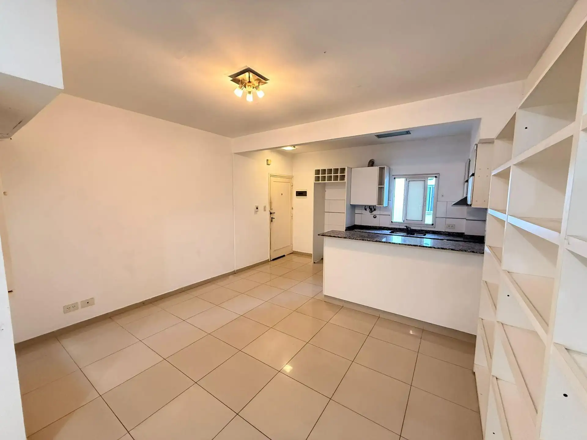 Apartamento de 2 ambientes de frente para a rua, com varanda e 1 quarto. Imóvel reformado, com living e cozinha integrada equipada com móveis, bancada de granito, fogão a gás e aquecedor a gás (calefón). O dormitório tem armários duplos com divisórias, e o banheiro tem ducha e ventilação natural. Condomínio baixo.