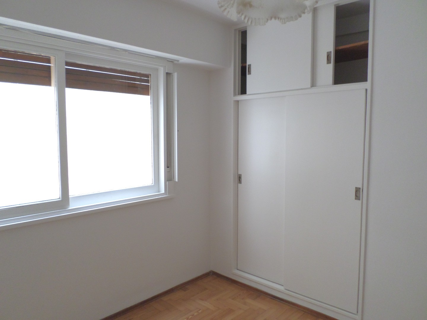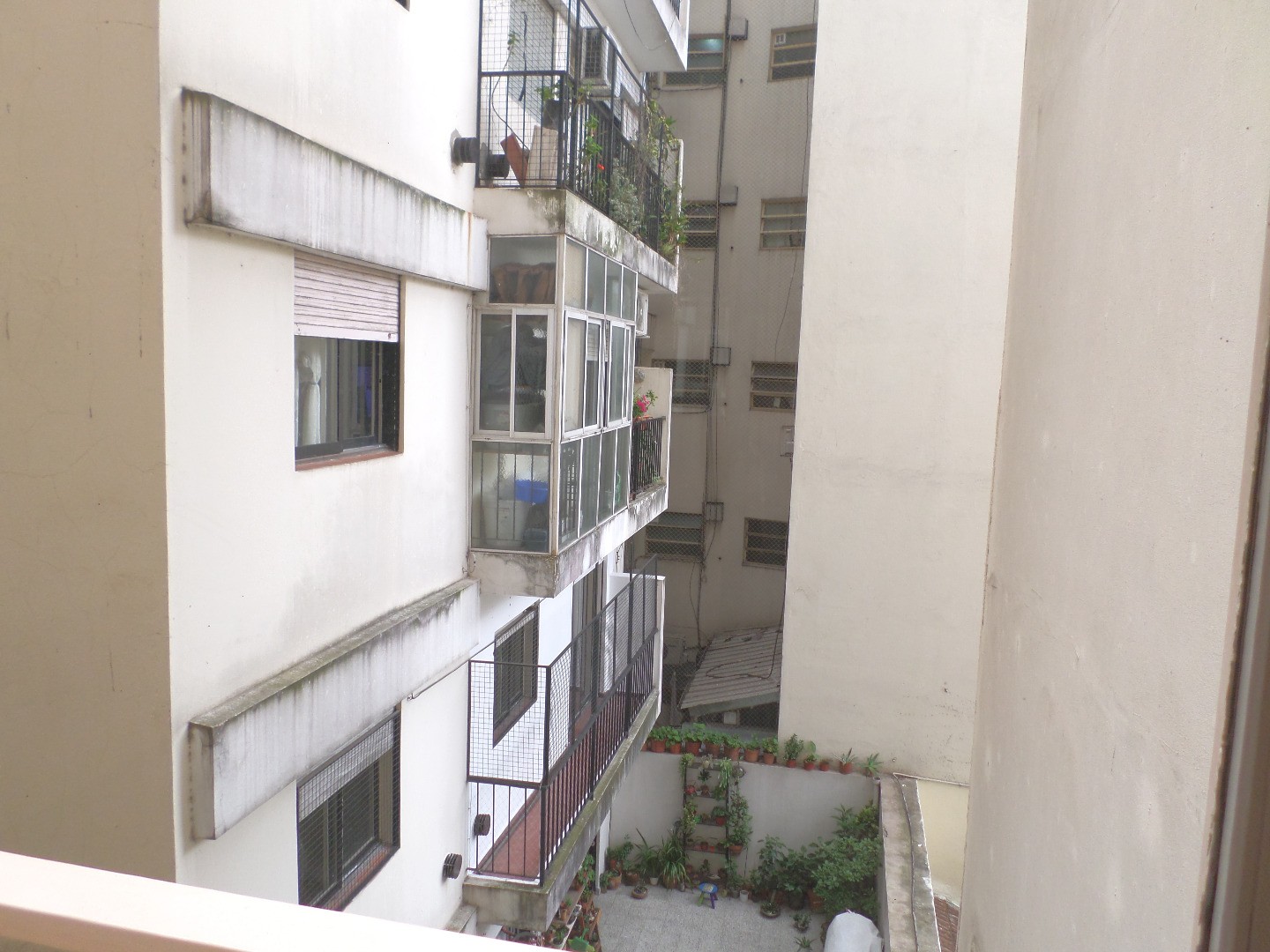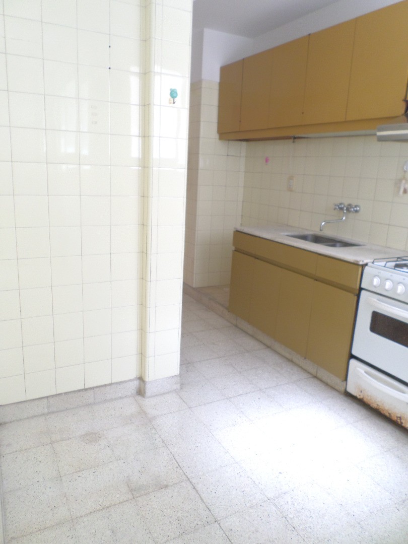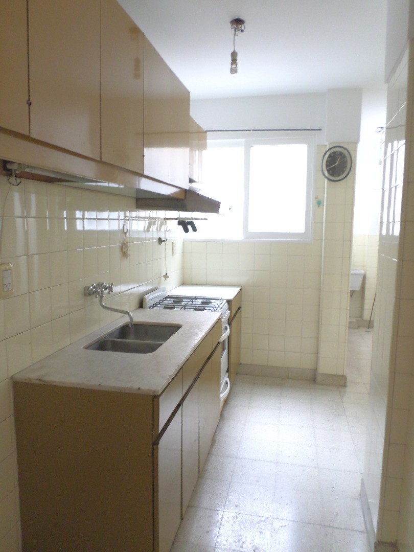 Apartamento de 3 ambientes de fundos, com cozinha completa com móveis sob e sobre a bancada e área de serviço. Há calefón e serviços individuais. O condomínio é de $177229, com AYSA incluído, e a taxa AGIP é de $21028. Contrato de 2 anos, com reajuste trimestral pelo IPC; não são aceitos animais de estimação.