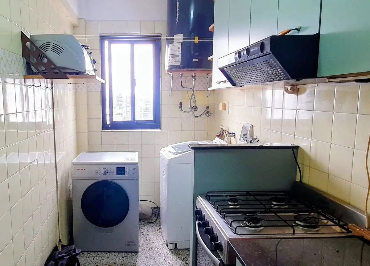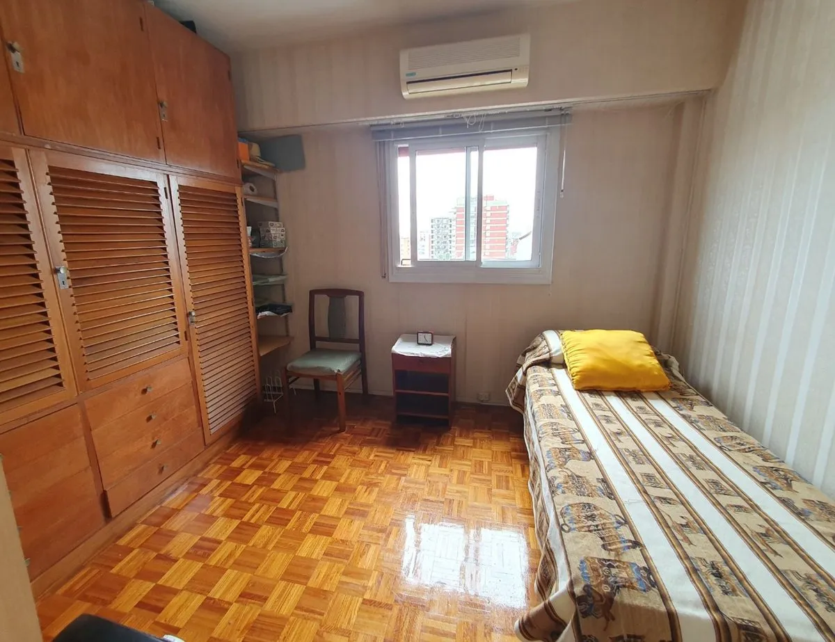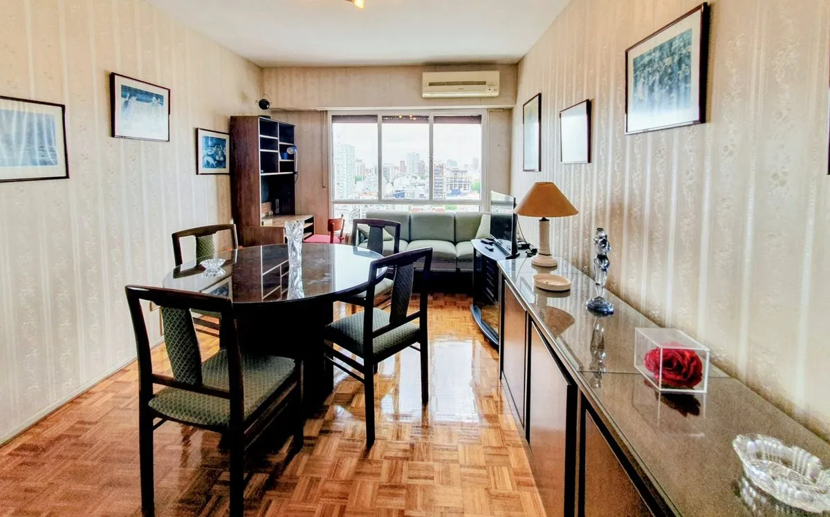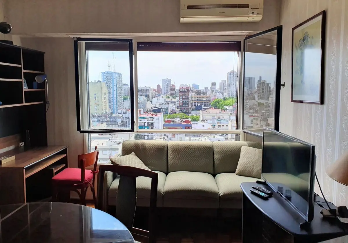Apartamento mobiliado em Belgrano, 15º andar, com vista aberta para o nordeste e lateral para o norte. Possui sala de estar e jantar com ar-condicionado (frio e quente) e TV HD, 2 dormitórios com ar-condicionado (frio e quente), sendo o principal com cama de casal e o segundo com duas camas; ambos têm armários. Cozinha separada com área de serviço embutida, equipada com eletrodomésticos, máquina de lavar e secar, além de louça; banheiro completo. O prédio tem 2 elevadores e há possibilidade de a