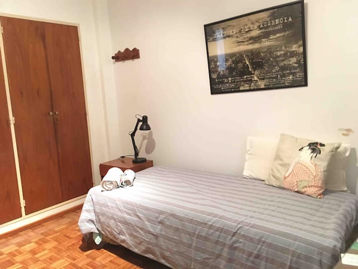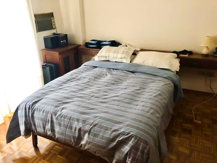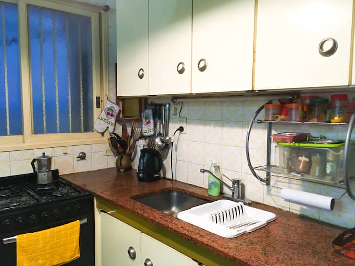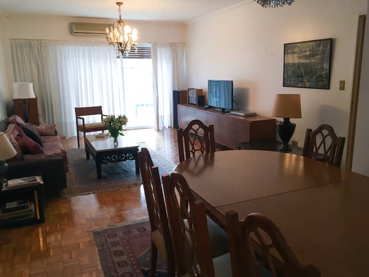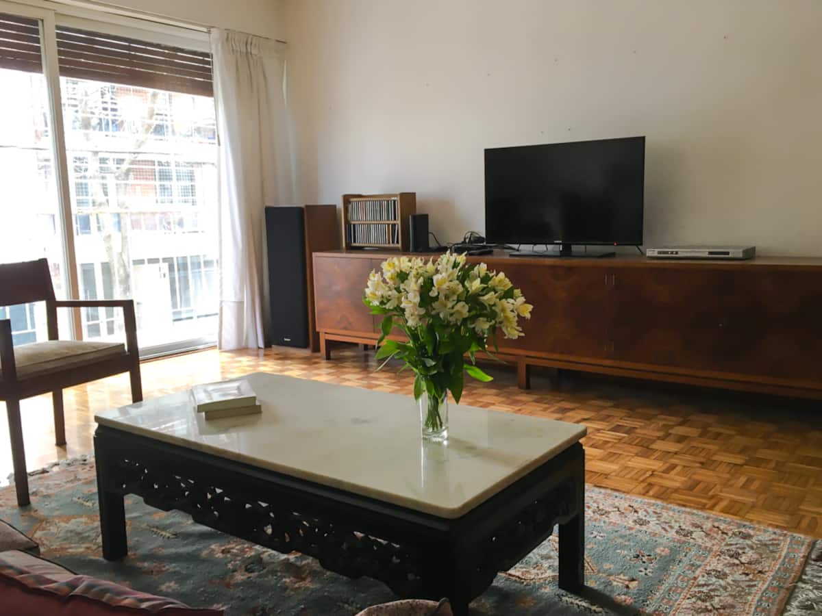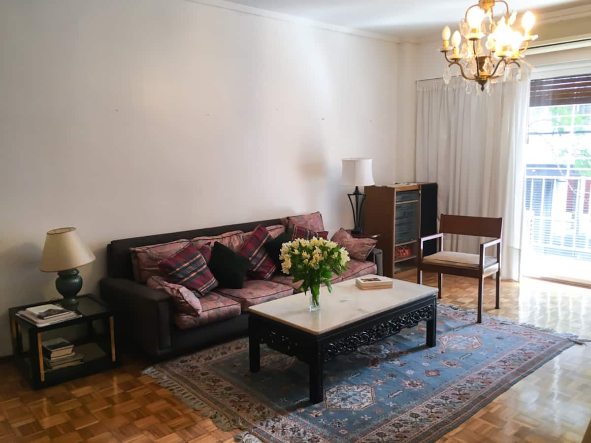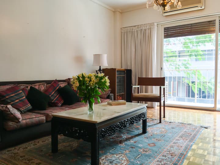 Apartamento clássico com 2 quartos em Belgrano. Fica no 1º andar, em rua tranquila. Aproximadamente a 500 metros da estação Olleros da Linha D do metrô e a 2 quadras da Av. Cabildo Metrobus. O texto também menciona conexão com a área gastronômica de Palermo Hollywood e Bosques de Palermo.