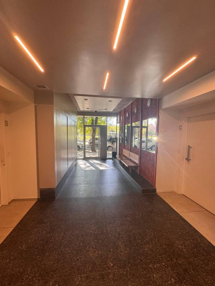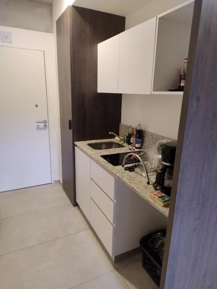 Kitnet novo (nunca habitado) em Colegiales, com 50 m² totais e 45 m² cobertos, em frente a uma praça. A unidade conta com cama de casal, mesa de trabalho e espaço de guarda. Cozinha integrada totalmente equipada e banheiro completo. Condomínio e serviços são pagos à parte.