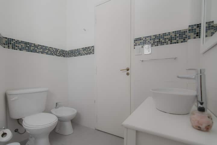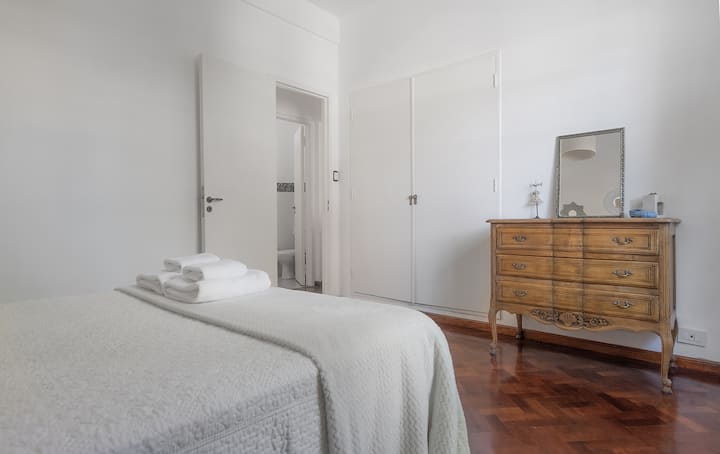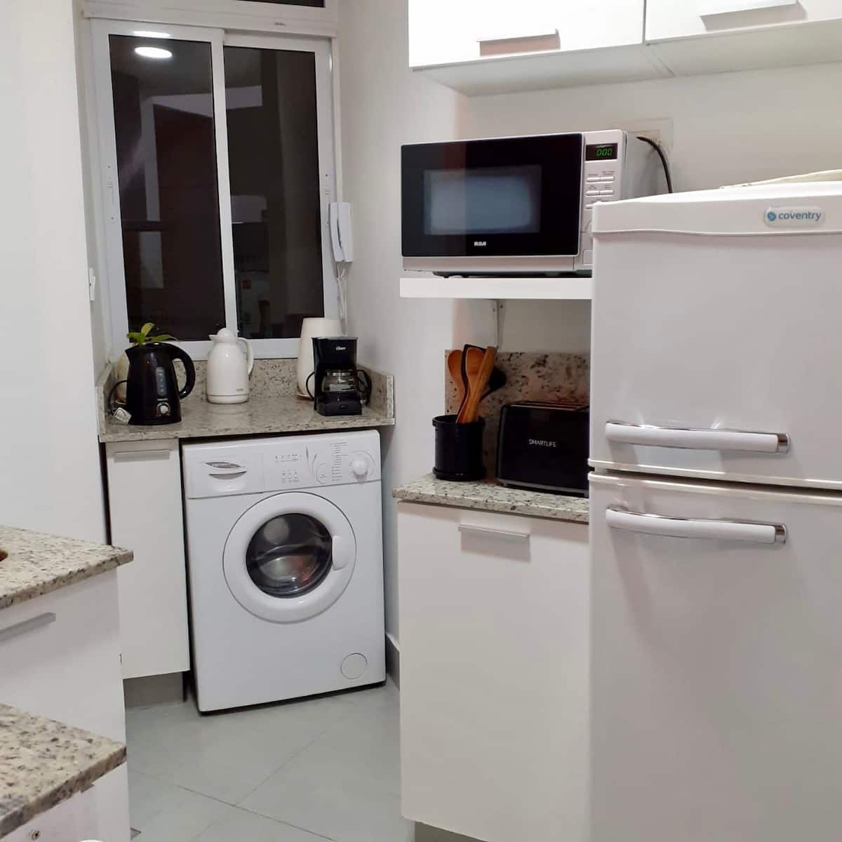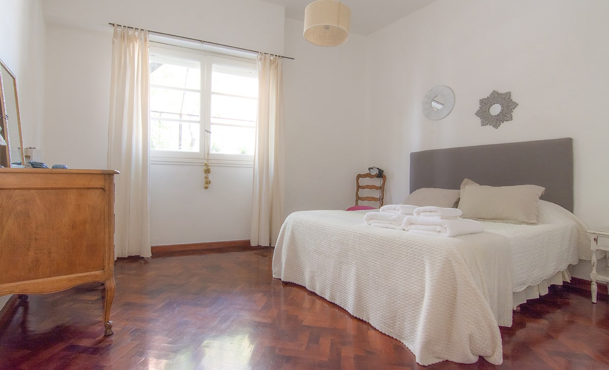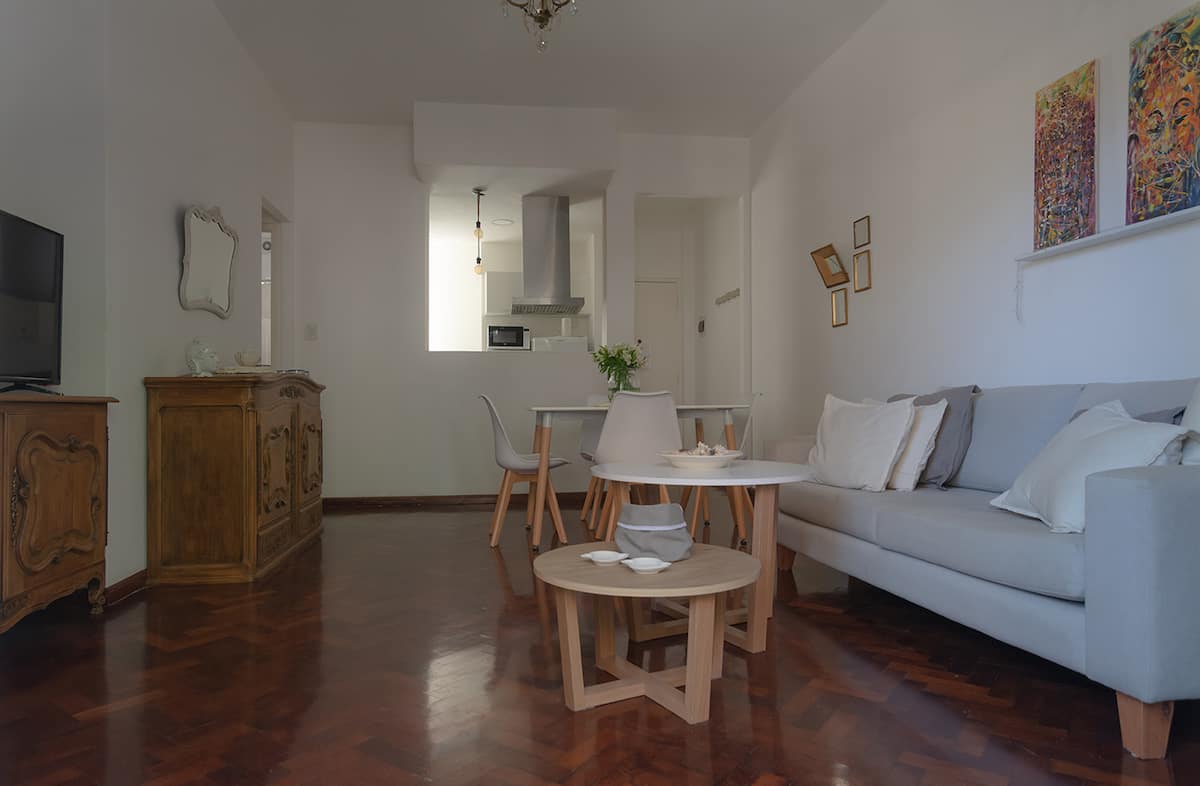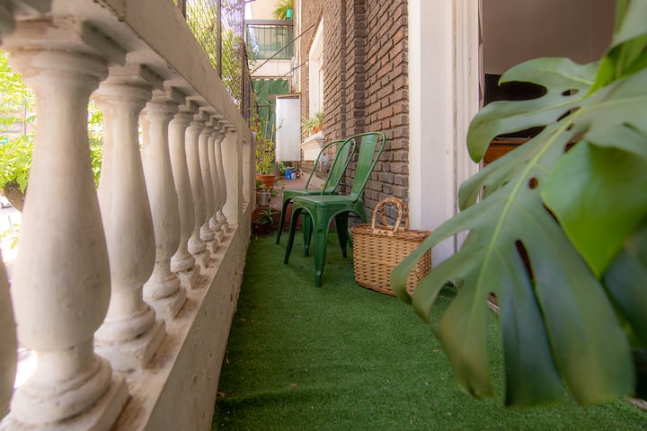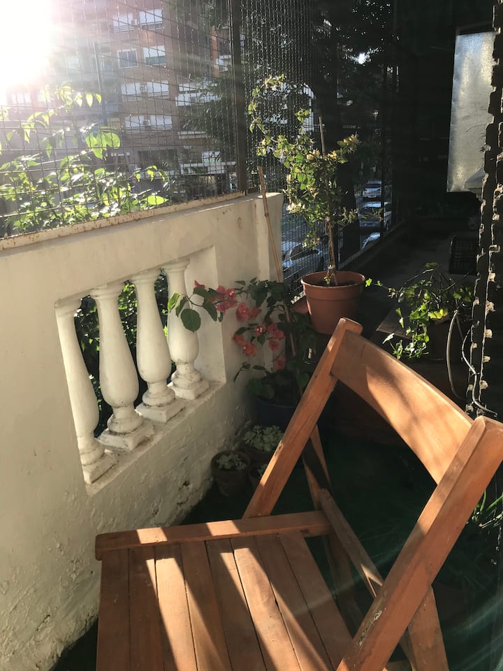 Apartamento com 2 quartos, para 4 pessoas, em Colegiales, no 1º andar por escada e de frente para a rua. Tem varanda ampla com vista para uma rua arborizada. A sala e a área de jantar têm ar-condicionado quente/frio; inclui TV de 42", internet de 60 Mbps e Wi-Fi de 50 Mbps. Cozinha equipada com utensílios para 4 pessoas, chaleira elétrica, cafeteira elétrica, torradeira, forno, micro-ondas e multiprocessador; há máquina de lavar automática e secadora dentro do apartamento. O banheiro completo é