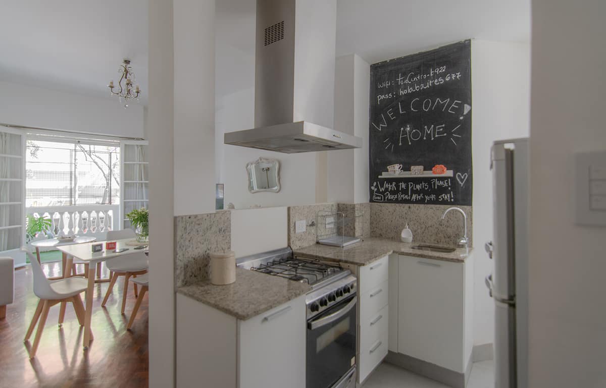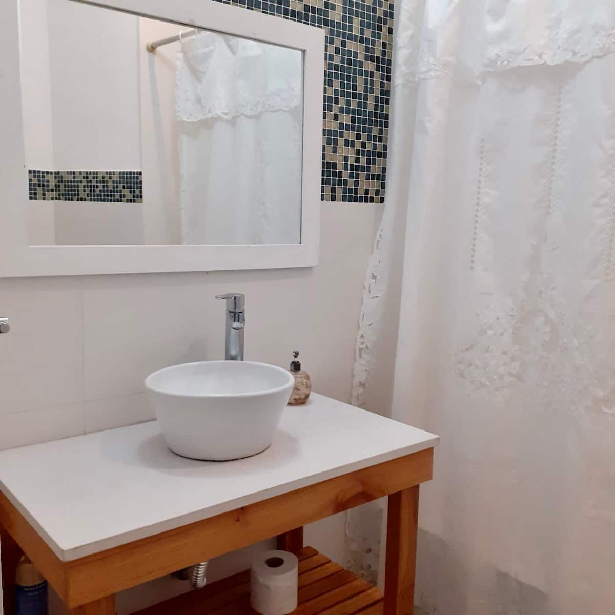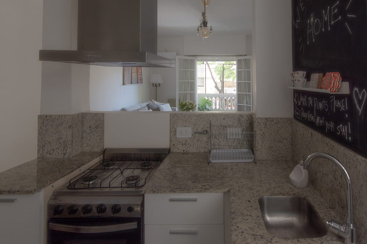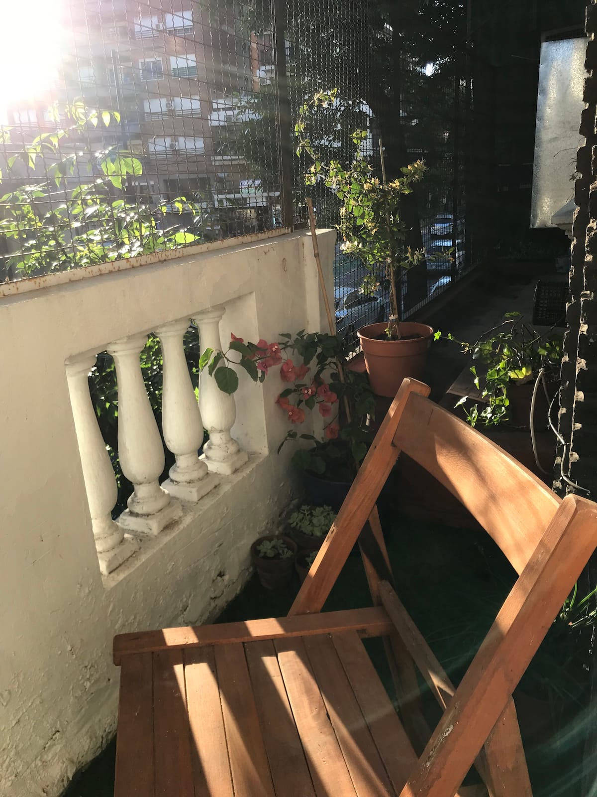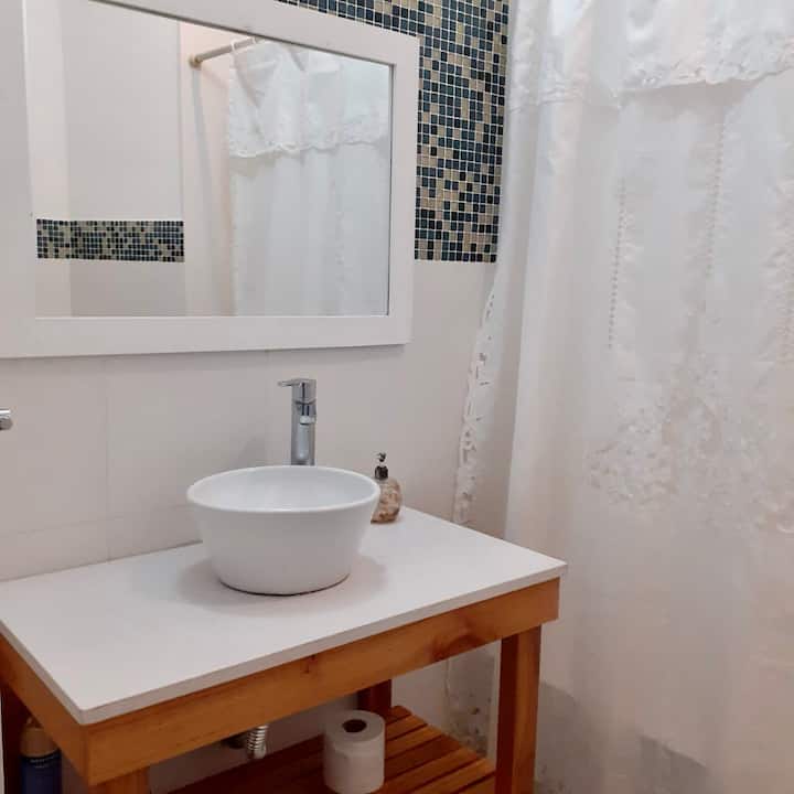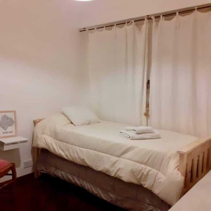 Apartamento com 2 quartos, para 4 pessoas, em Colegiales, no 1º andar por escada e de frente para a rua. Tem varanda ampla com vista para uma rua arborizada. A sala e a área de jantar têm ar-condicionado quente/frio; inclui TV de 42", internet de 60 Mbps e Wi-Fi de 50 Mbps. Cozinha equipada com utensílios para 4 pessoas, chaleira elétrica, cafeteira elétrica, torradeira, forno, micro-ondas e multiprocessador; há máquina de lavar automática e secadora dentro do apartamento. O banheiro completo é