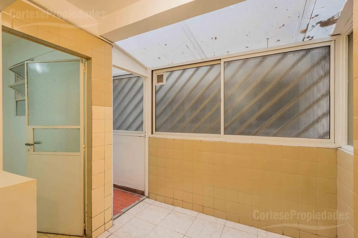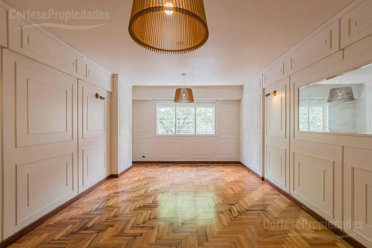 Apartamento de três ambientes em primeiro andar, de frente para a rua, com hall de recepção, living e sala de jantar, 2 dormitórios e banheiro completo. Cozinha separada e área de serviço independente, com dependência de serviço (quarto) e banheiro próprio; inclui lavadero independente. Há aquecimento e água com serviços centrais. Pisos de madeira e boiserie no estar e no hall. Inclui uma fração indivisa de depósito (baulera) no subsolo.