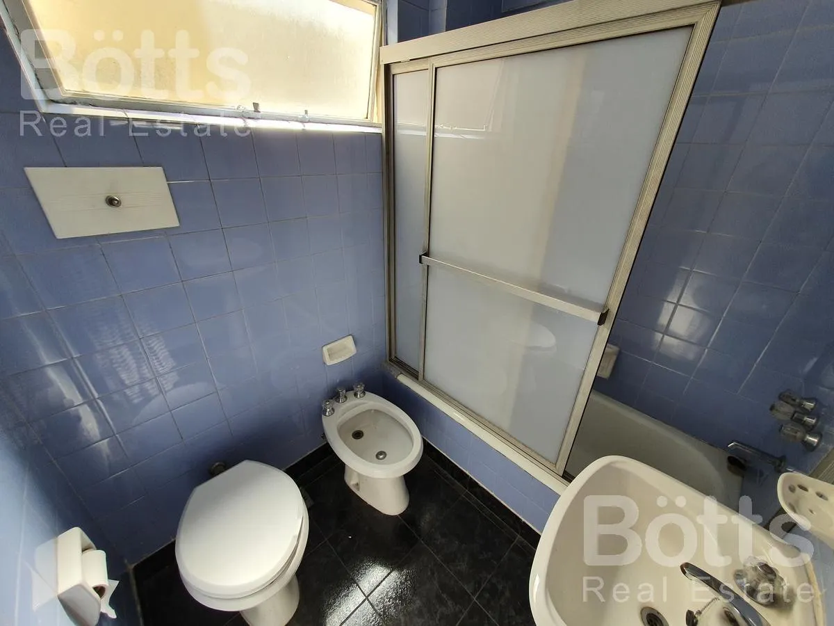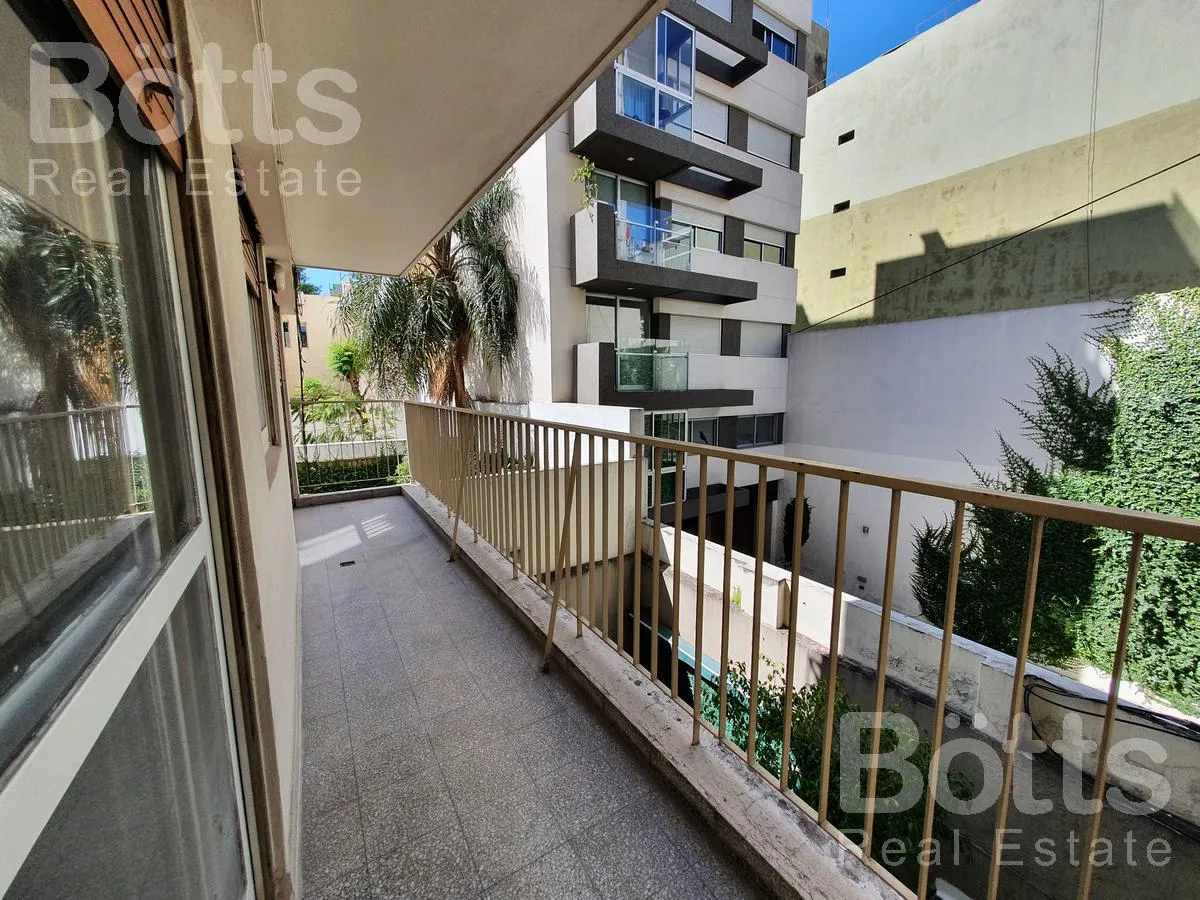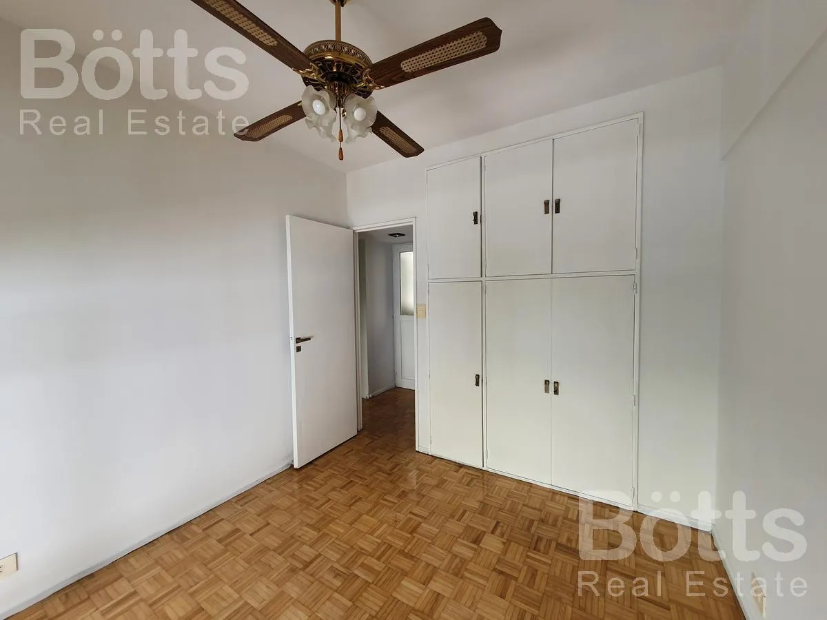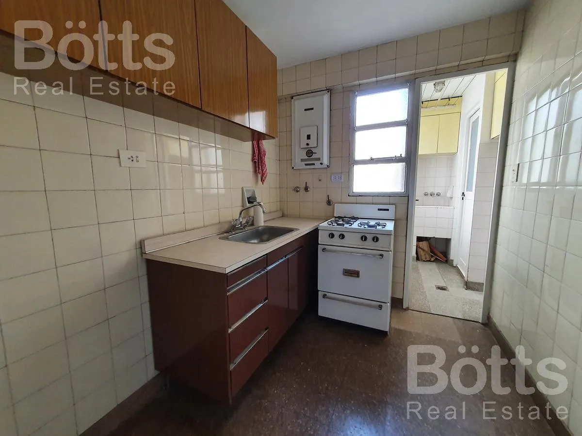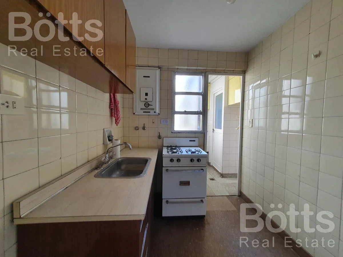Apartamento de 3 ambientes com 2 quartos no 2º andar, de fundos, com varanda contínua e vista aberta. Cozinha separada com armários superiores e inferiores, banheiro completo com banheira e área de serviço separada. Possui aquecimento via calefón e calefação por piso radiante com serviço central; todos os ambientes ventilam para o exterior. O prédio tem 7 andares, 3 unidades por andar, com elevador e escada de emergência, e dispõe de funcionário com moradia; condomínio de $ 145.000. Não são acei