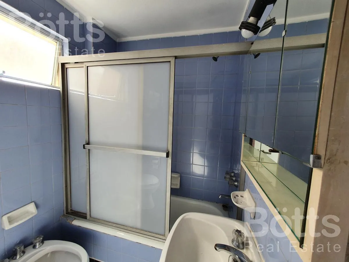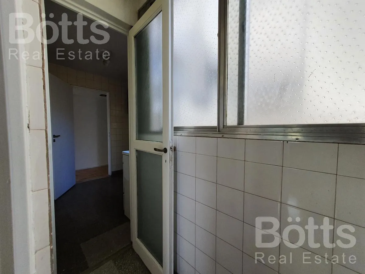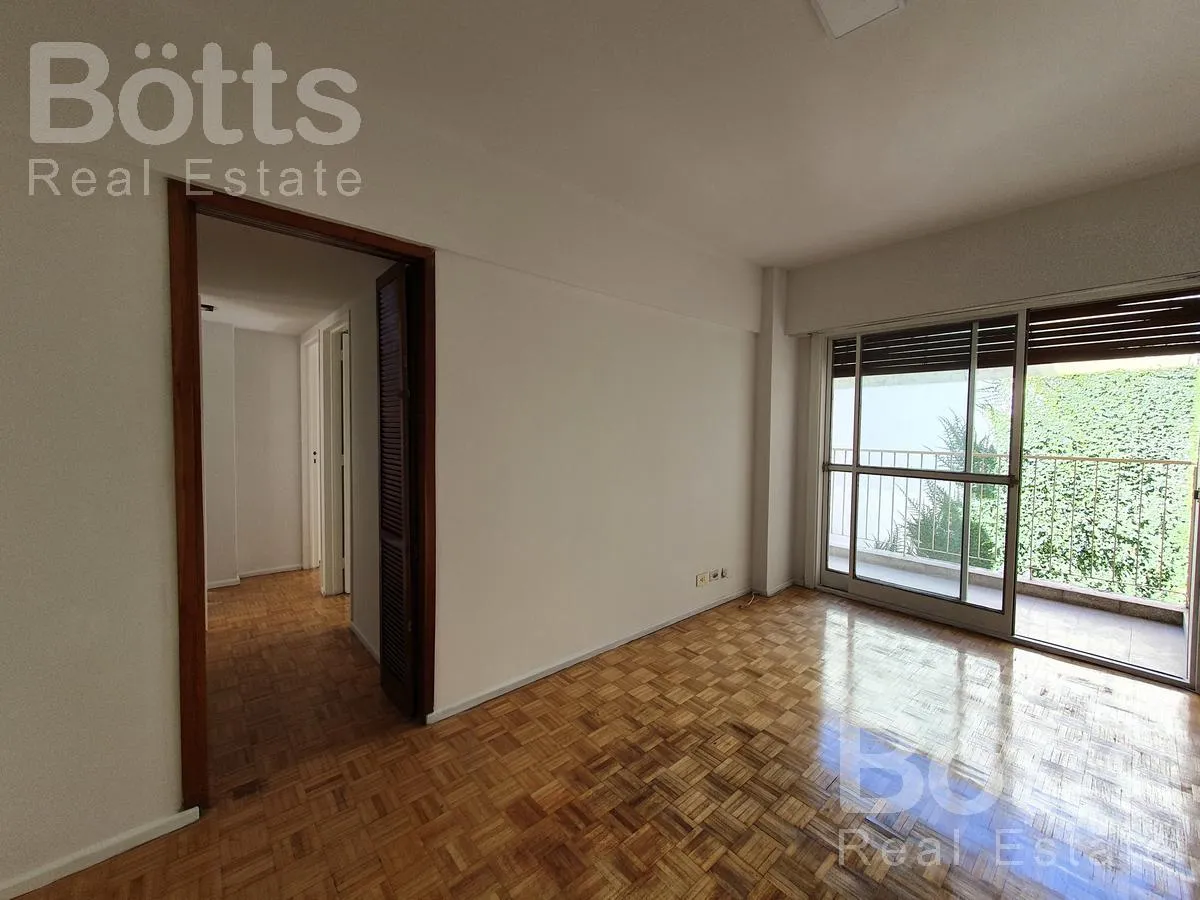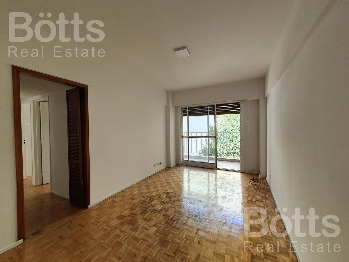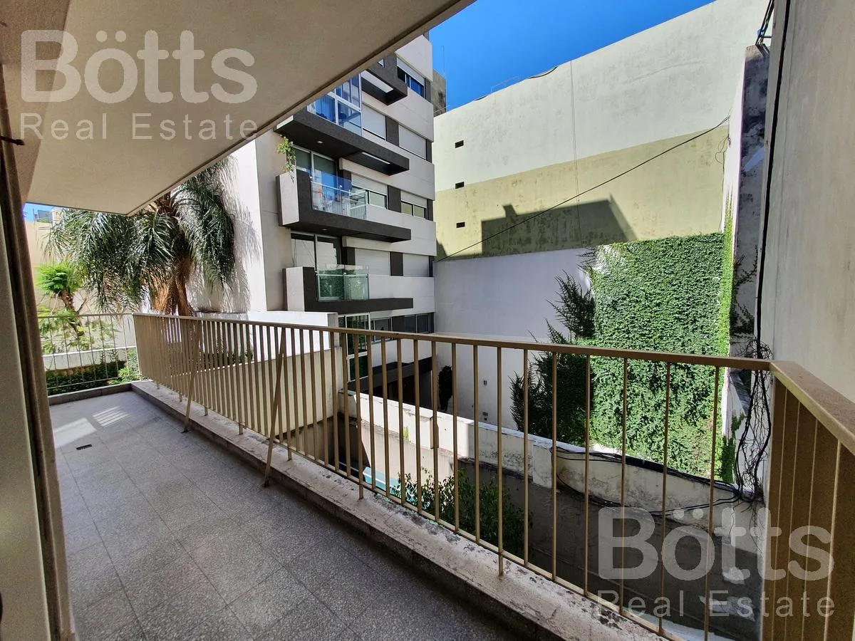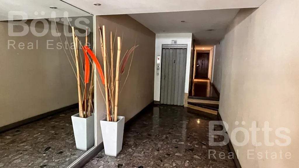 Apartamento de 3 ambientes com 2 quartos no 2º andar, de fundos, com varanda contínua e vista aberta. Cozinha separada com armários superiores e inferiores, banheiro completo com banheira e área de serviço separada. Possui aquecimento via calefón e calefação por piso radiante com serviço central; todos os ambientes ventilam para o exterior. O prédio tem 7 andares, 3 unidades por andar, com elevador e escada de emergência, e dispõe de funcionário com moradia; condomínio de $ 145.000. Não são acei