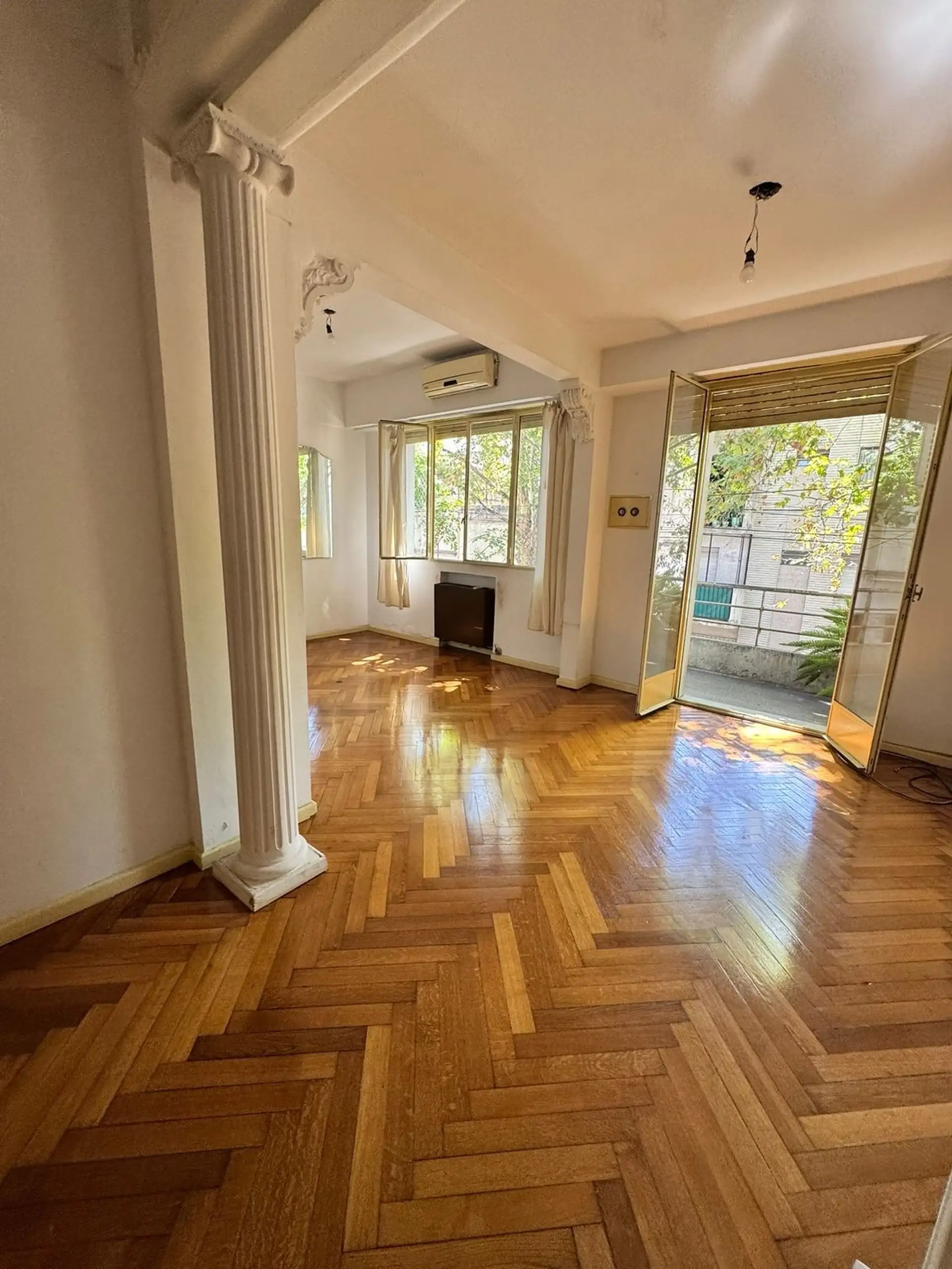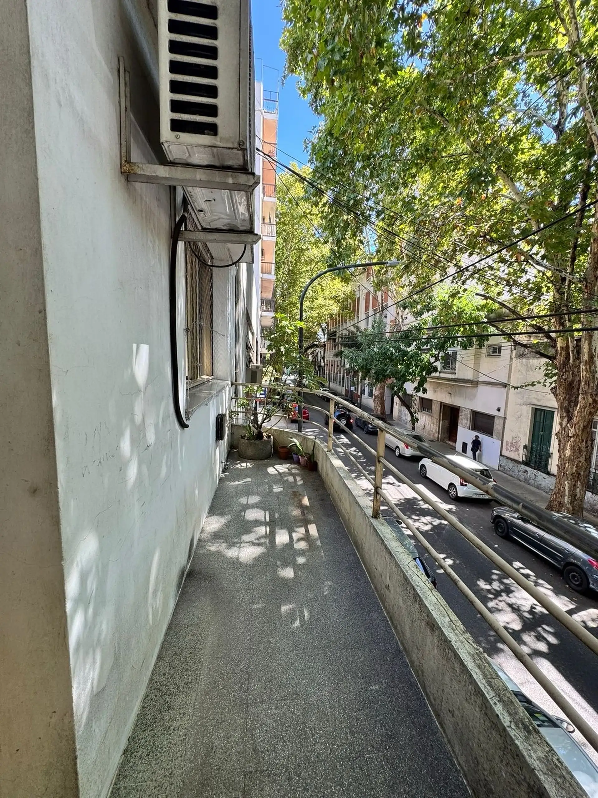 Apartamento de 3 ambientes em Flores, com 2 quartos e dependência, com 2 andares de ar-condicionado e varanda de frente para a rua. Sala de estar e jantar em formato L, piso de madeira e acesso a uma área de terraço próprio. O anúncio informa que não são aceitos animais de estimação.