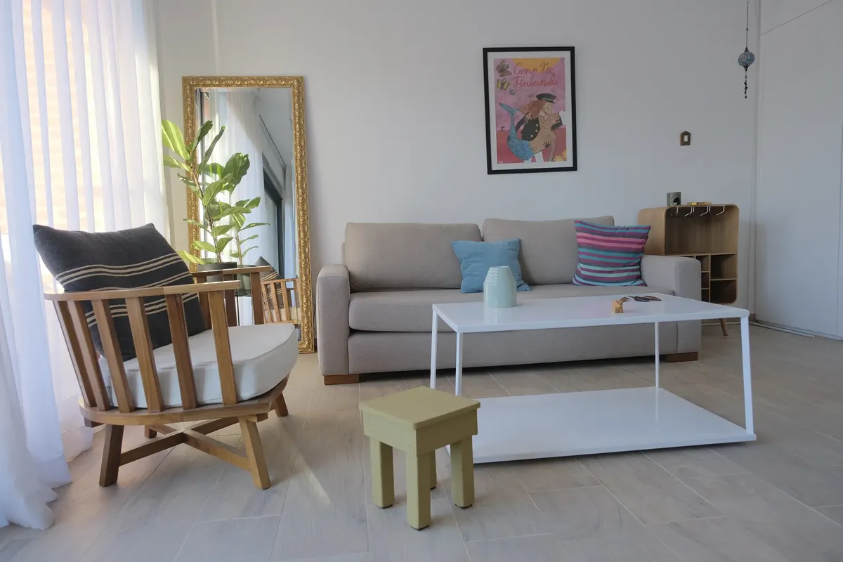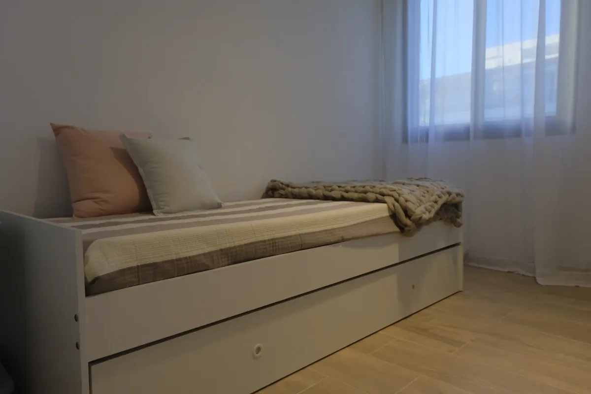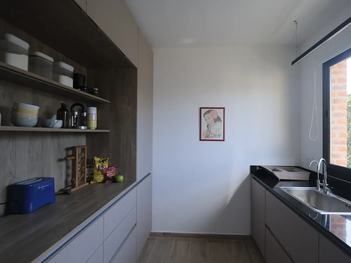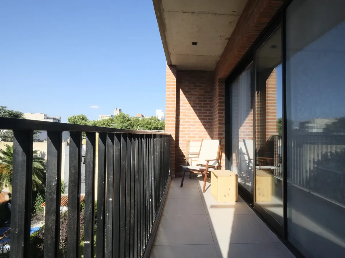 Apartamento mobiliado e equipado com 80 m², apartamento passagem, com orientação norte e silencioso. Conta com sala de estar e jantar (6,0 x 4,0 m) com mesa para quatro cadeiras, sofá e assentos auxiliares, além de TV com Chromecast; dois dormitórios com banheiros em suíte (um com ducha e outro com banheira pequena). A unidade tem varanda corrida (1,20 x 5,0 m) com vista para a Plaza de Florida, cozinha independente totalmente equipada com fogão a gás de 4 bocas, forno elétrico, coifa, geladeira