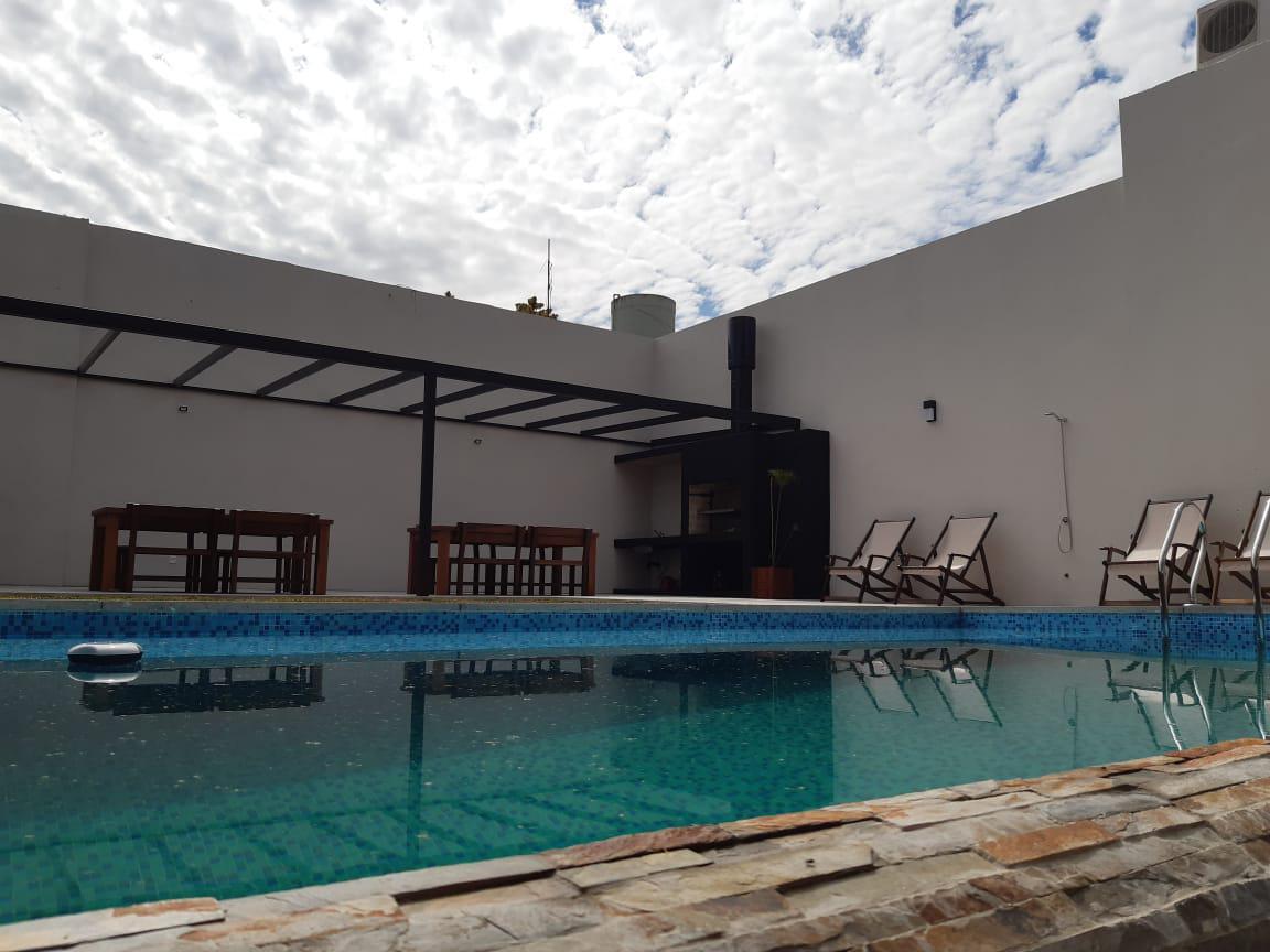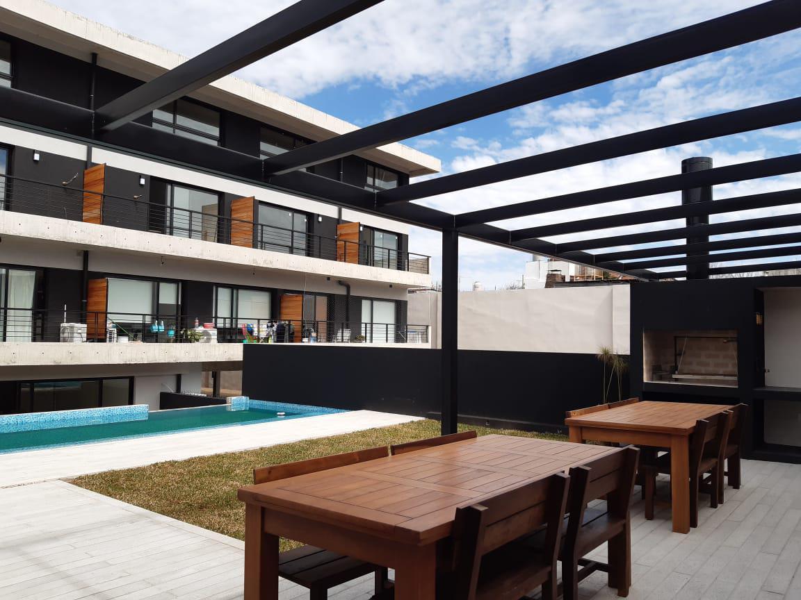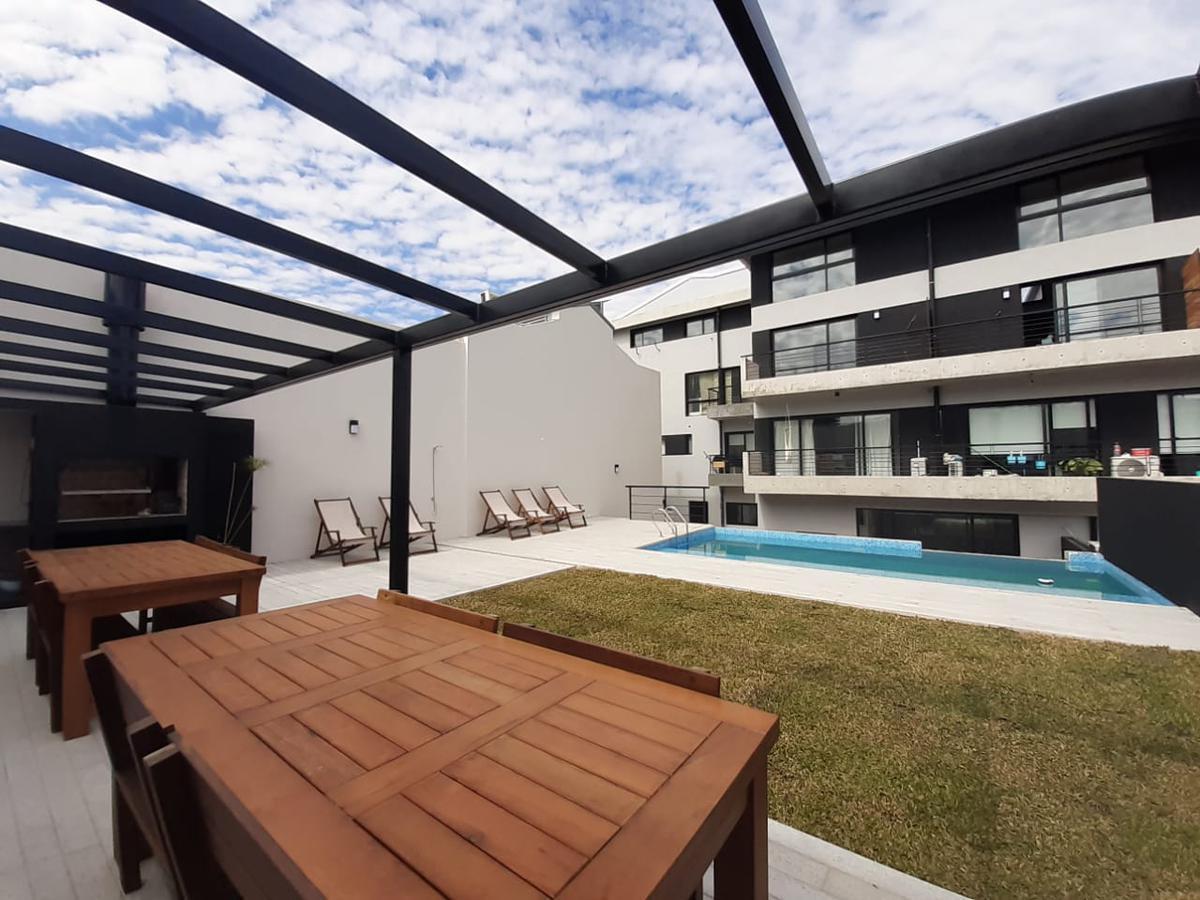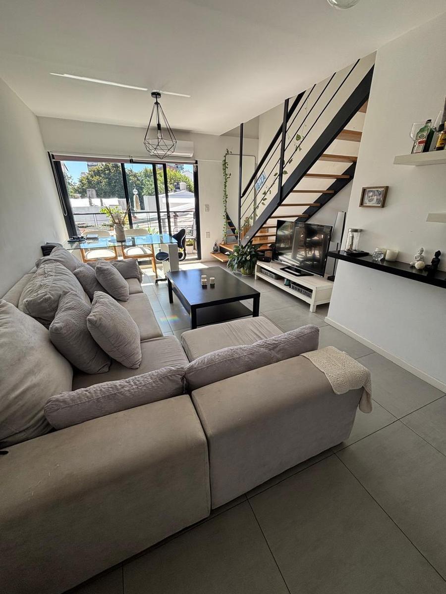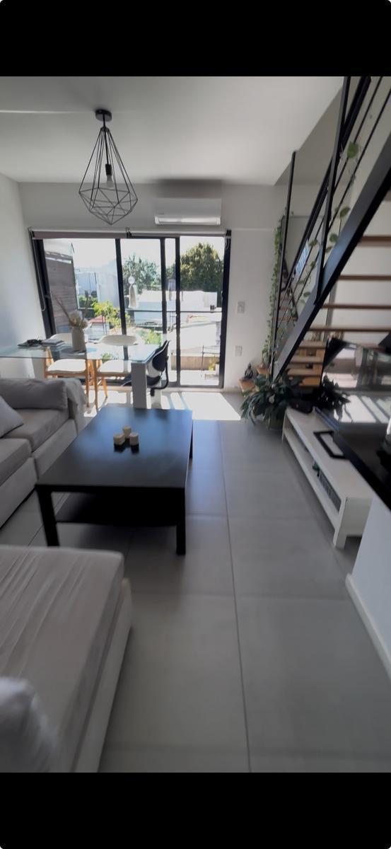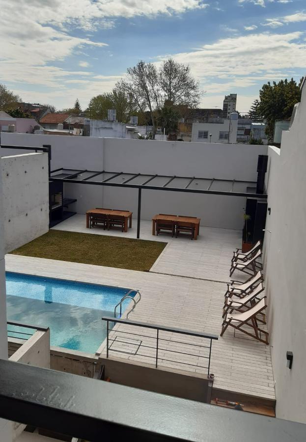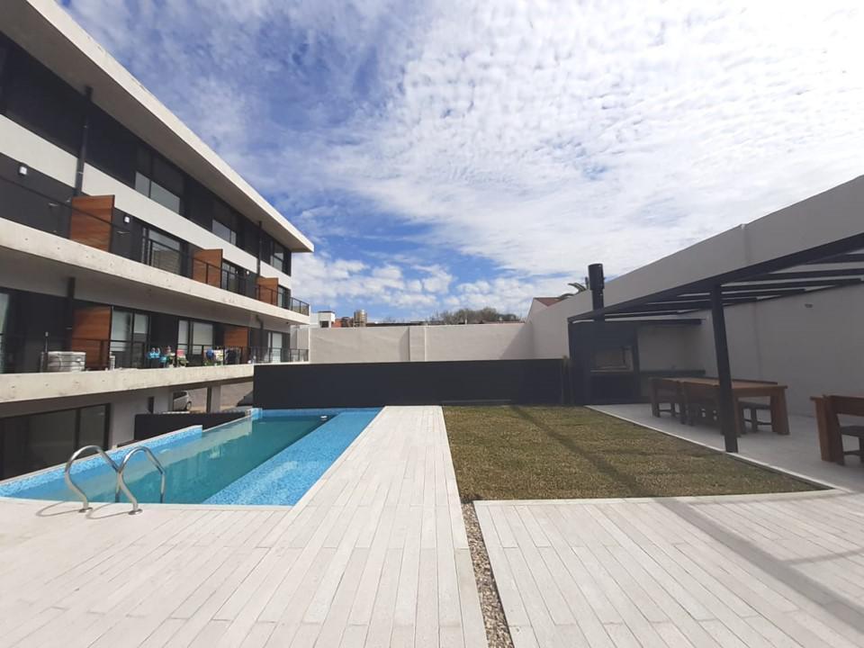 Apartamento duplex de 3 ambientes em Florida, com 2 dormitórios, sala e área de jantar, cozinha equipada e 2 banheiros completos. O complexo oferece piscina, SUM com envidraçamento e vista para o parque, área de churrasco, bicicletário, solarium e elevador. O texto menciona expensas baixas e segurança com câmeras e alarme perimetral.