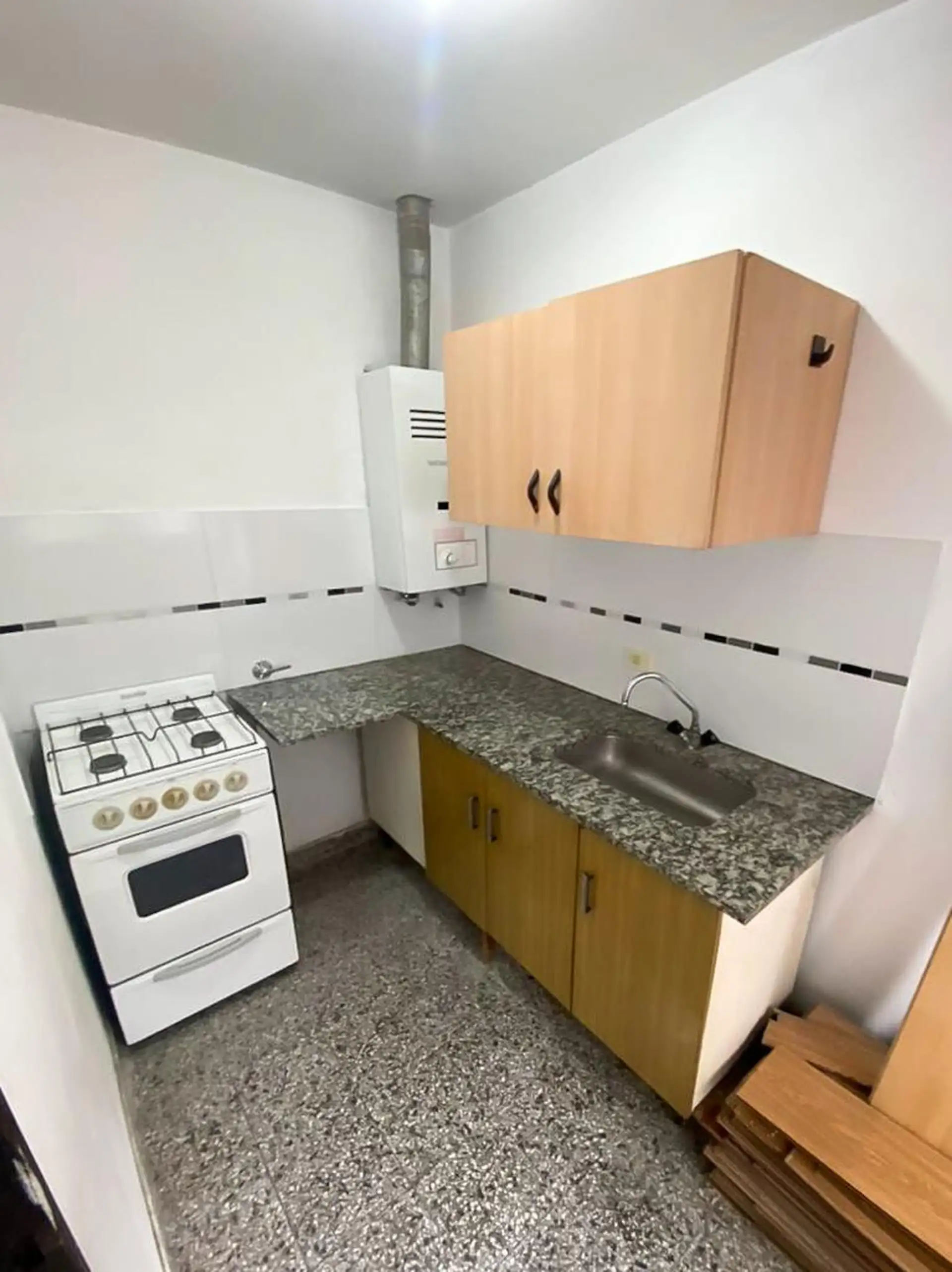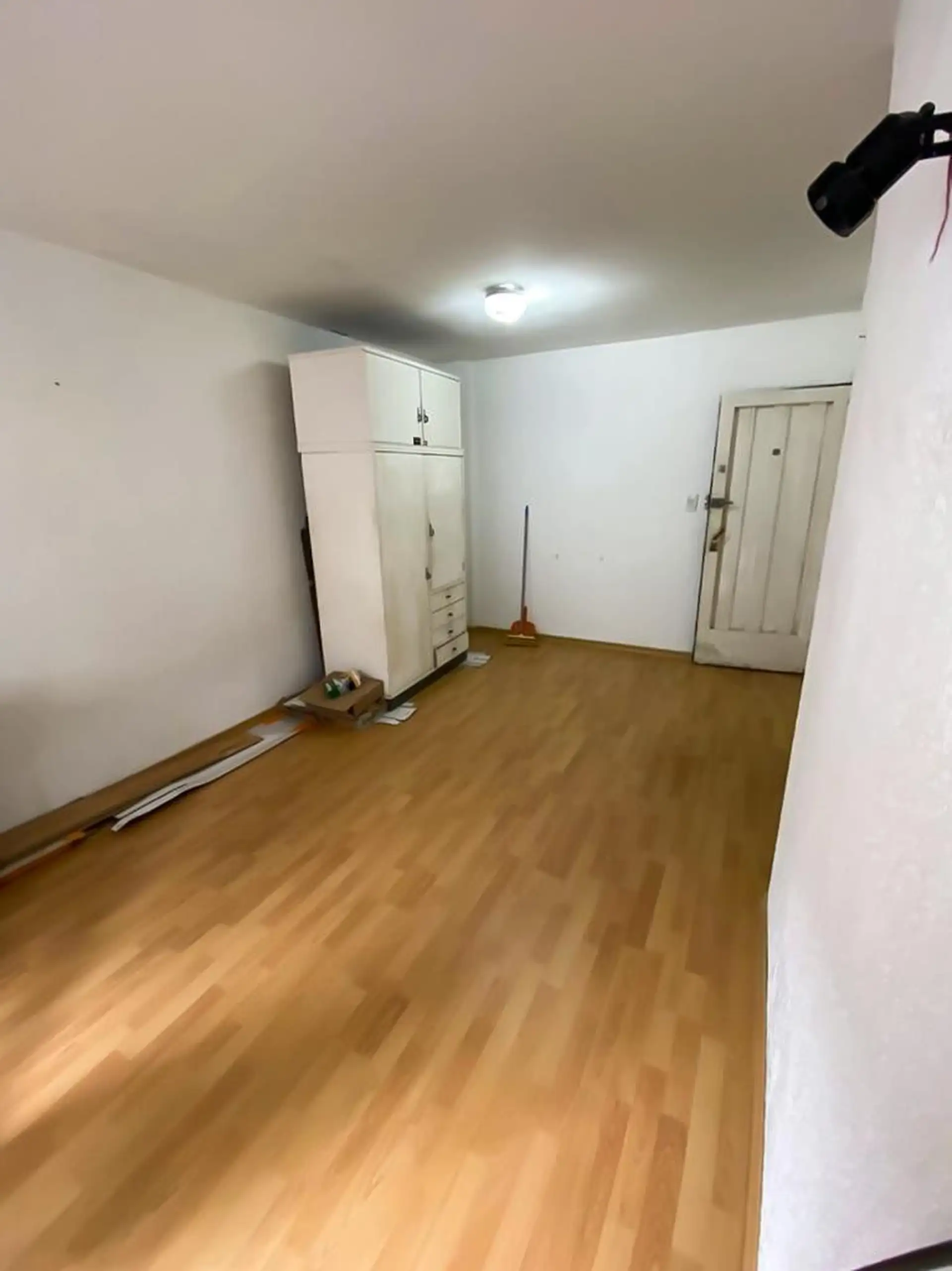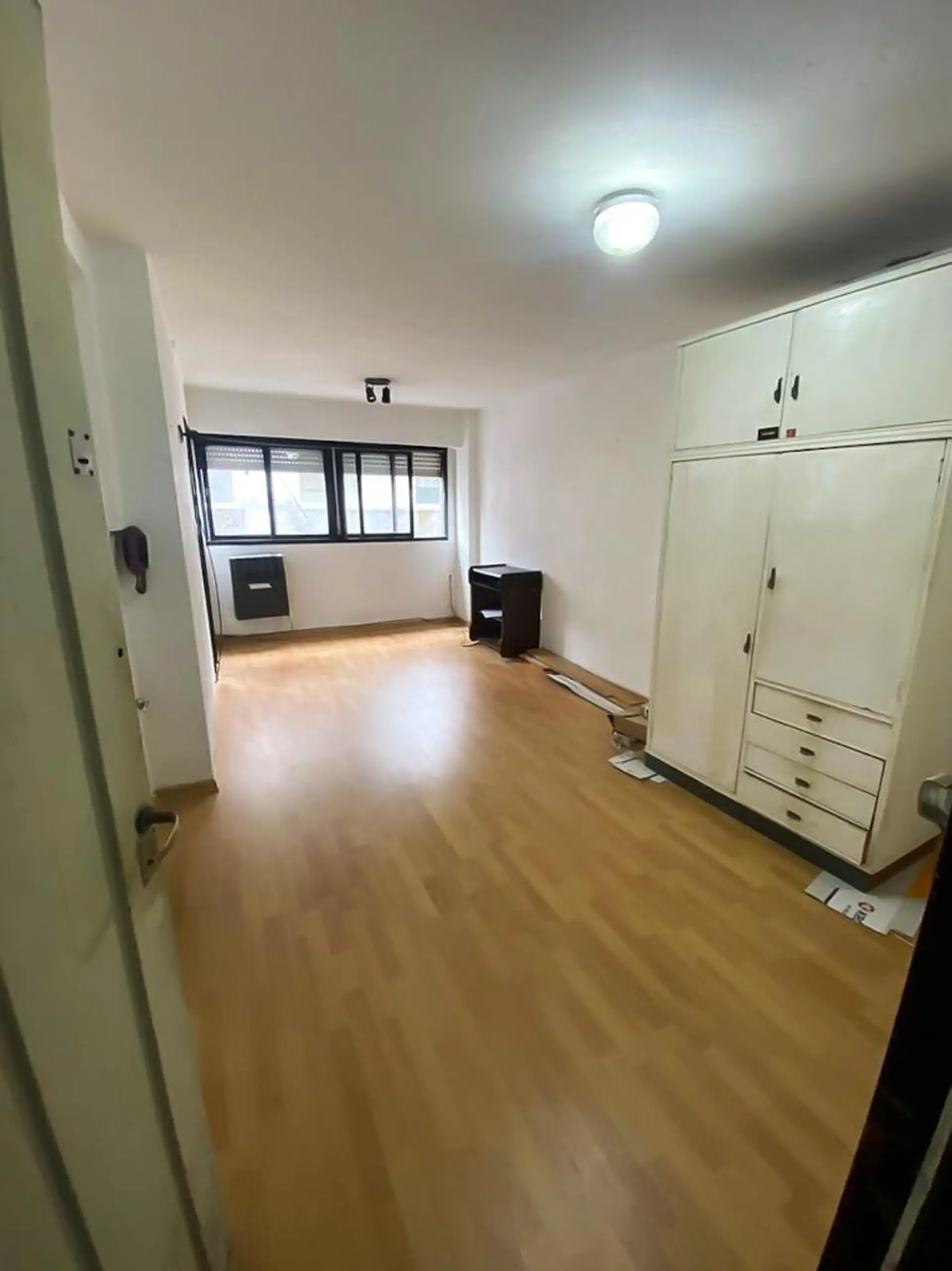 Kitnet em um décimo andar interno, com um único ambiente e cozinha separada com armários na parte inferior e superior da bancada. Conta com banheiro completo. O condomínio inclui ABSA.
