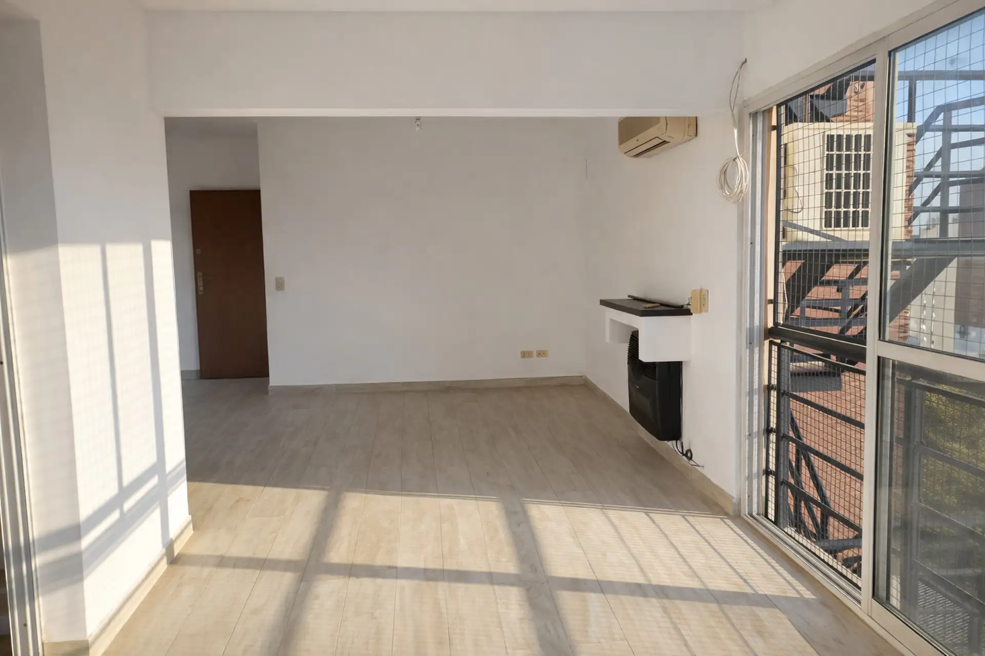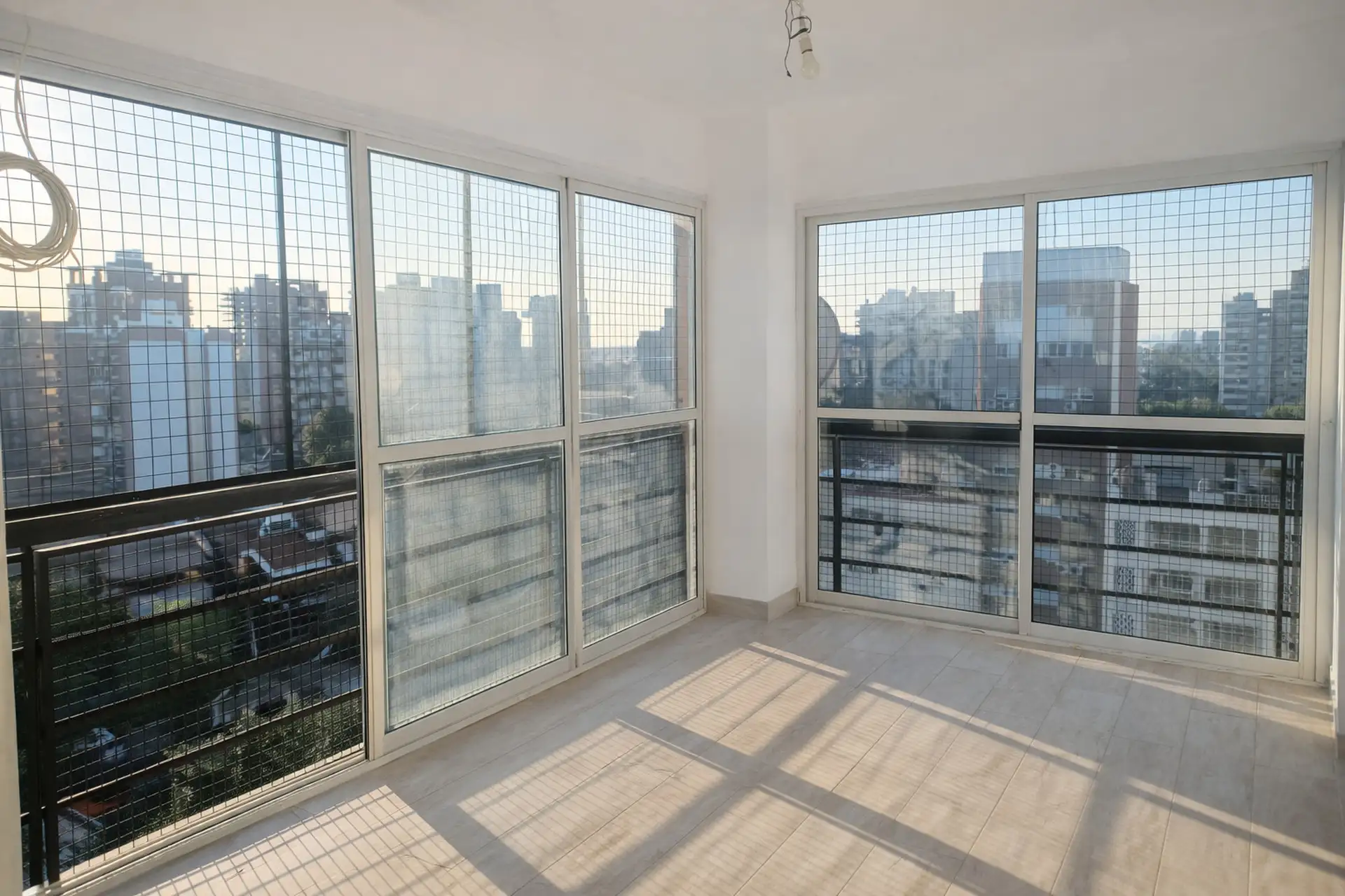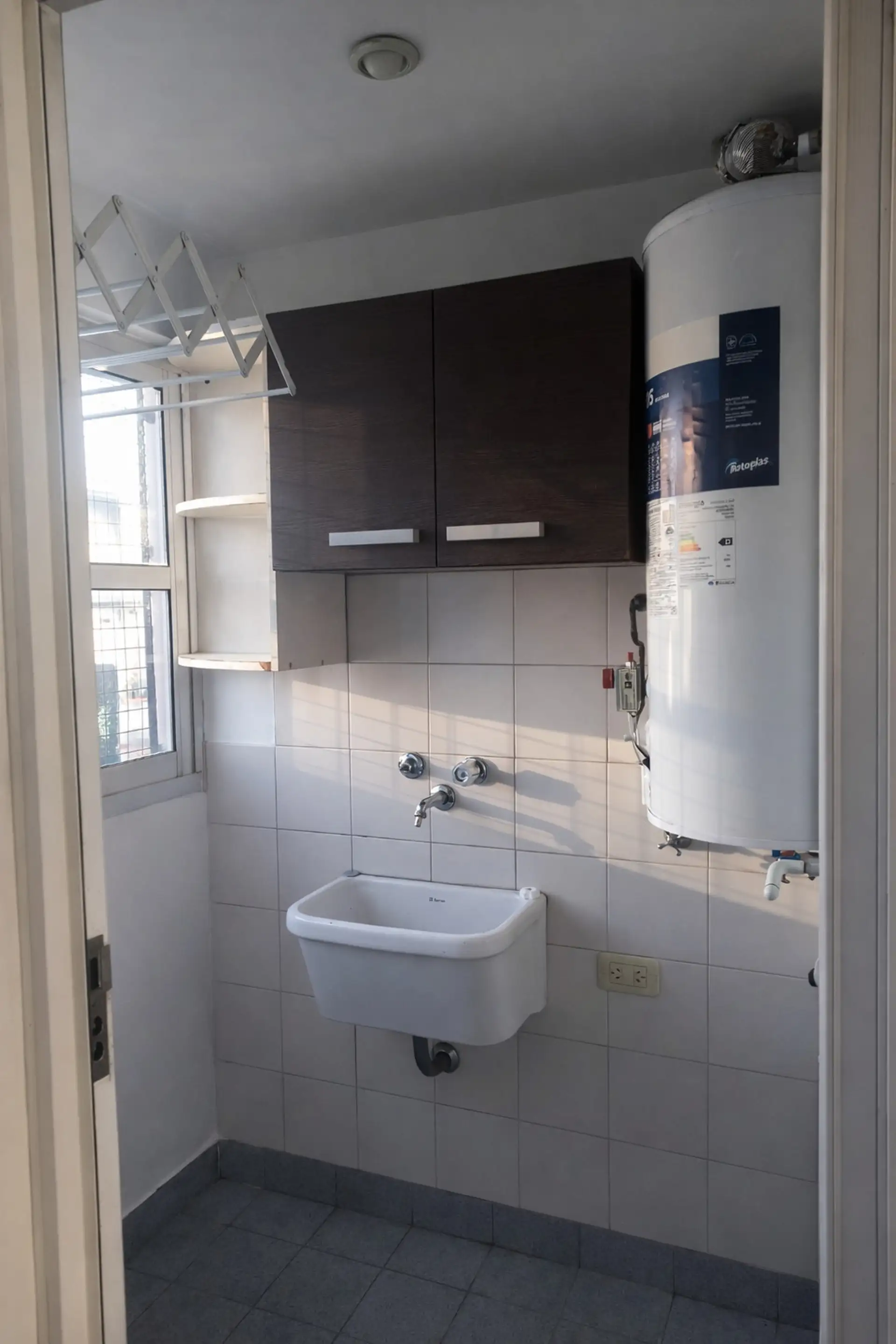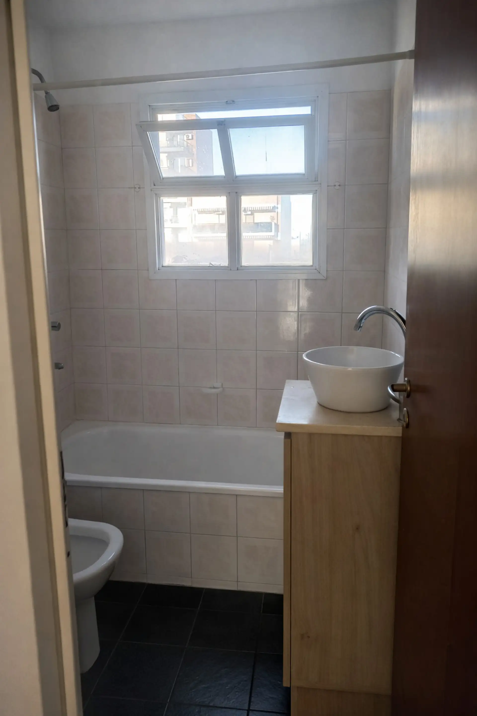Apartamento de 3 ambientes com 2 quartos no 6º andar, de fundos (contrafrente), com vista aberta, em Lanús Oeste. Inclui sala de jantar com saída para varanda tipo francesa, cozinha semi integrada com janela para o exterior, 1 banheiro completo com janela e área de serviço independente com termocumulador (termotanque) embutido. Conta com ar-condicionado frio/quente e estufa, pisos de porcelanato, armários embutidos nos dois dormitórios e vaga de garagem coberta. O prédio Torre Bahía tem 2 elevad