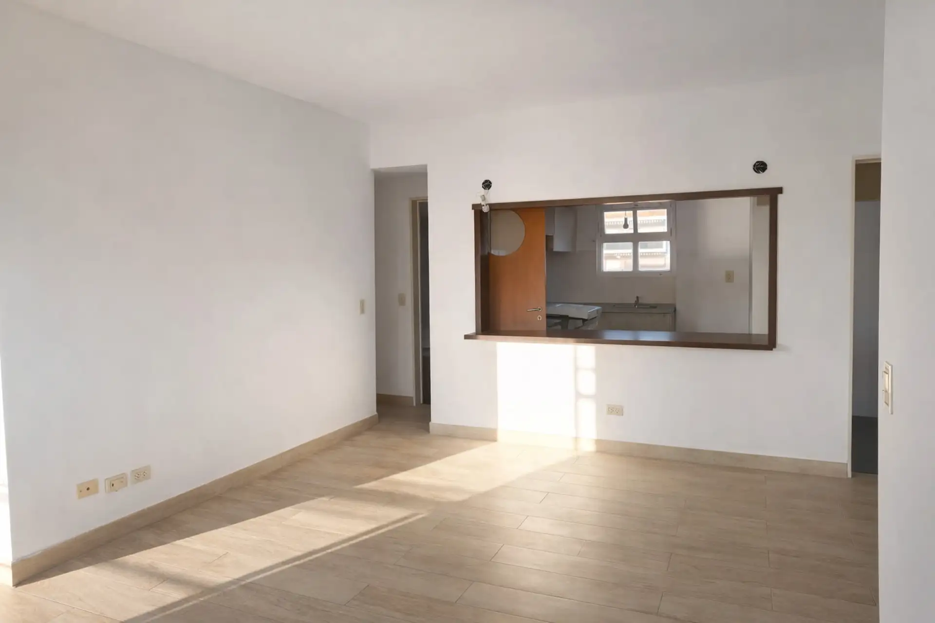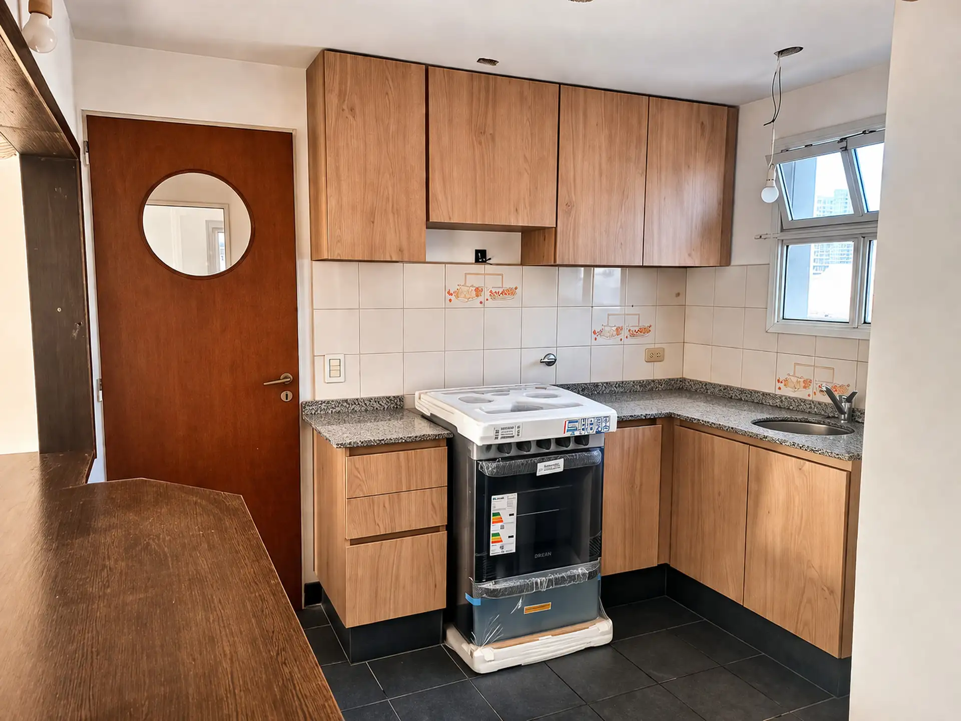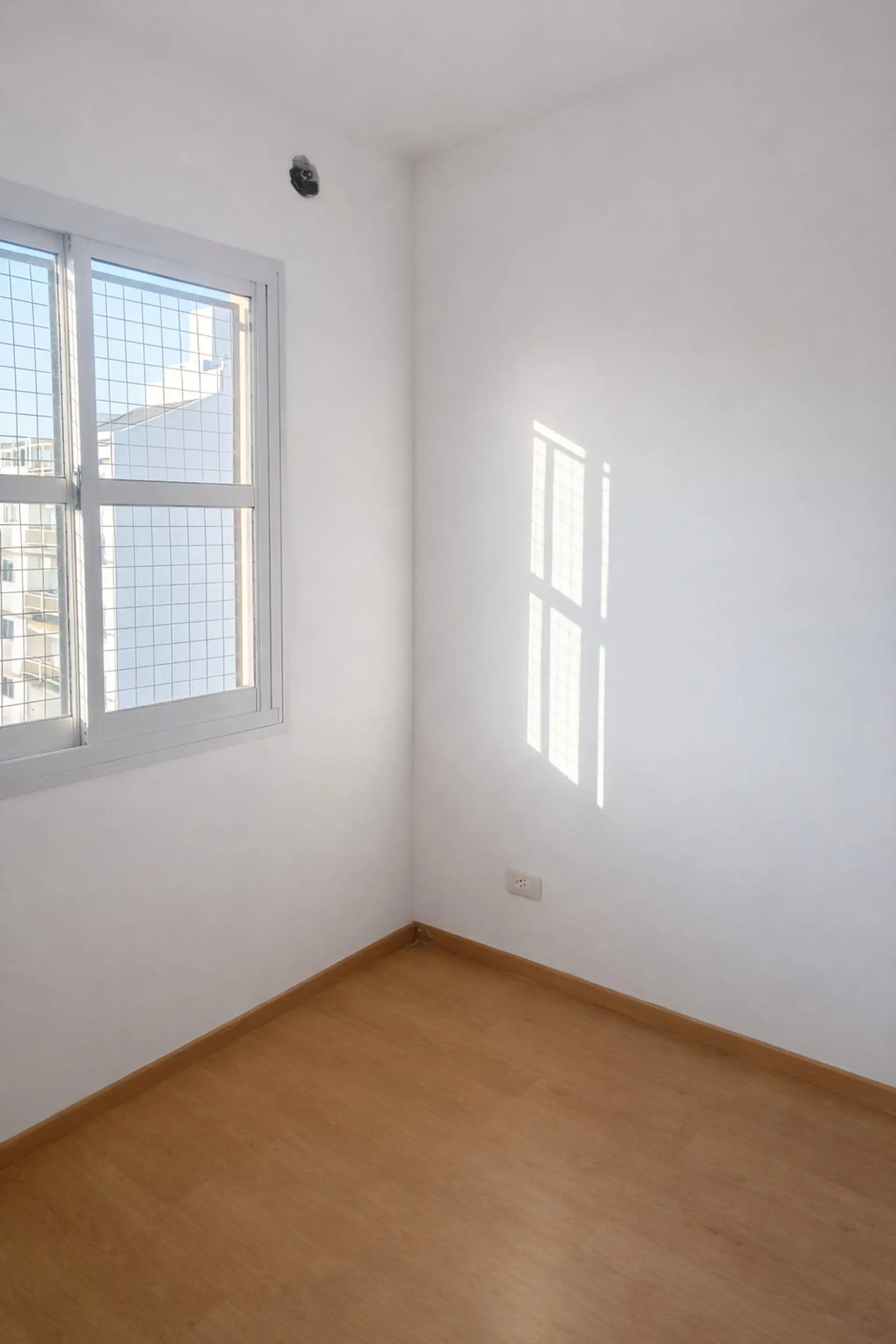 Apartamento de 3 ambientes com 2 quartos no 6º andar, de fundos (contrafrente), com vista aberta, em Lanús Oeste. Inclui sala de jantar com saída para varanda tipo francesa, cozinha semi integrada com janela para o exterior, 1 banheiro completo com janela e área de serviço independente com termocumulador (termotanque) embutido. Conta com ar-condicionado frio/quente e estufa, pisos de porcelanato, armários embutidos nos dois dormitórios e vaga de garagem coberta. O prédio Torre Bahía tem 2 elevad