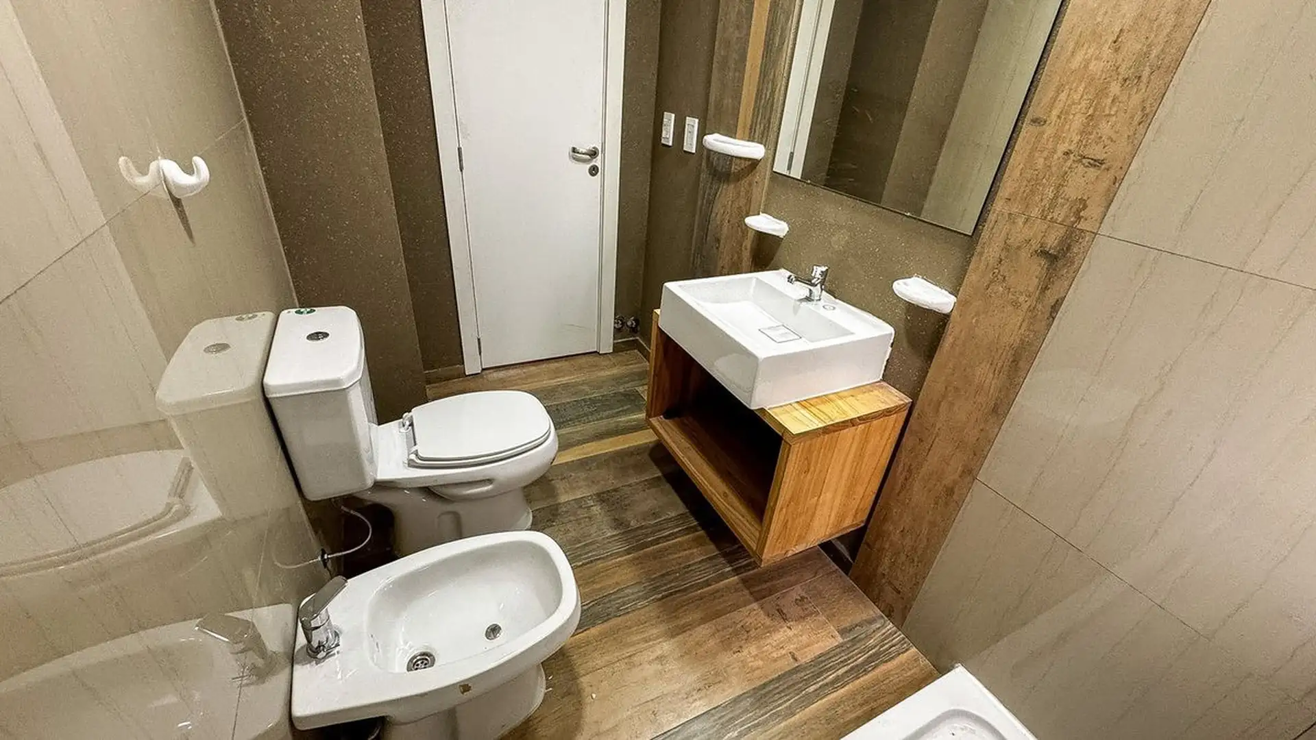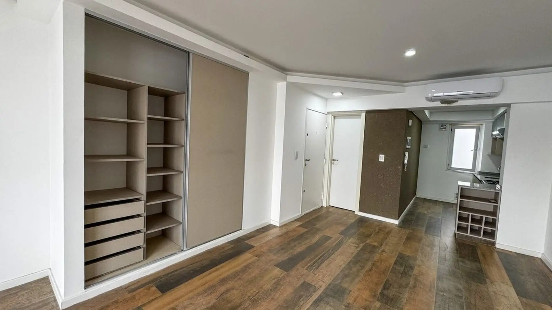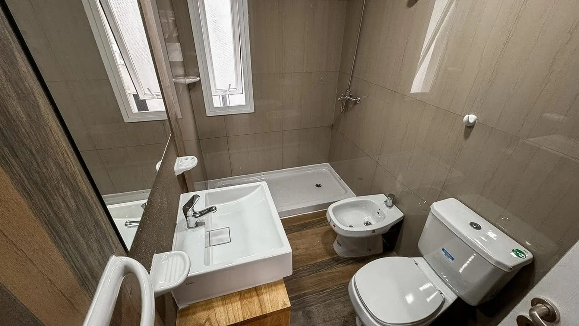 Apartamento novo (nunca habitado) no bairro Gerli, Lanús, com 2 ambientes e entrada de frente para os fundos (contrafrente). Inclui cozinha com armários, bancada inferior, exaustor e fogão a gás, além de ar-condicionado frio/calor e iluminação instalada. O banheiro é completo com box de ducha e o aquecimento de água é feito por termoelétrica individual (fora da unidade). Há área de lavanderia para máquina de lavar e baulera individual no 4º andar; também menciona terraço com churrasqueira, solár