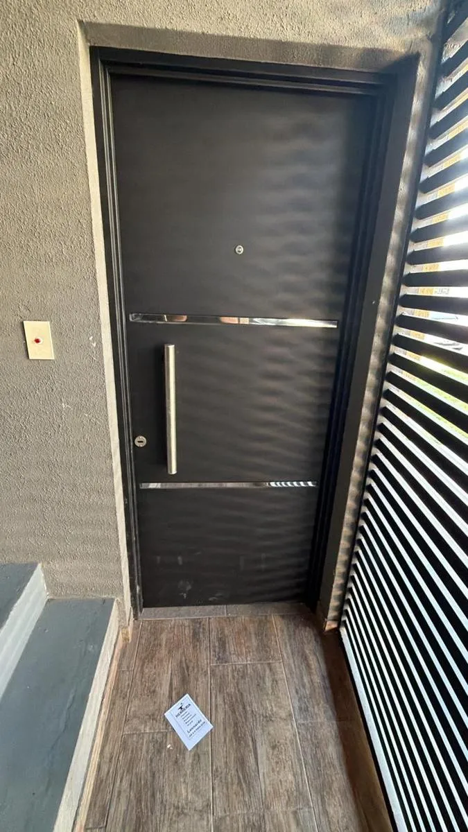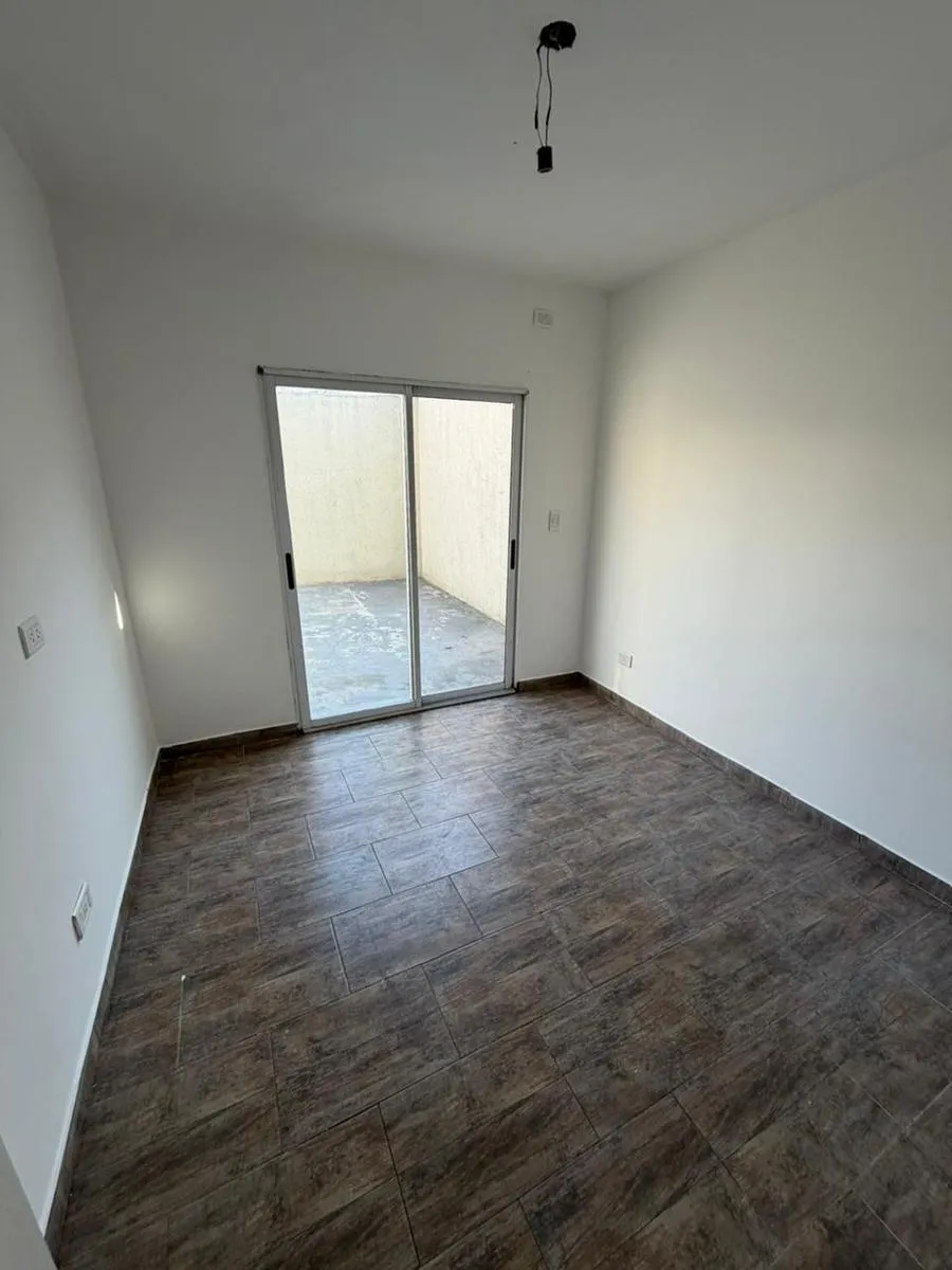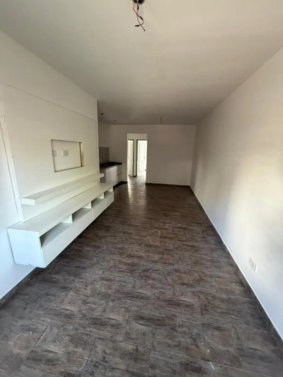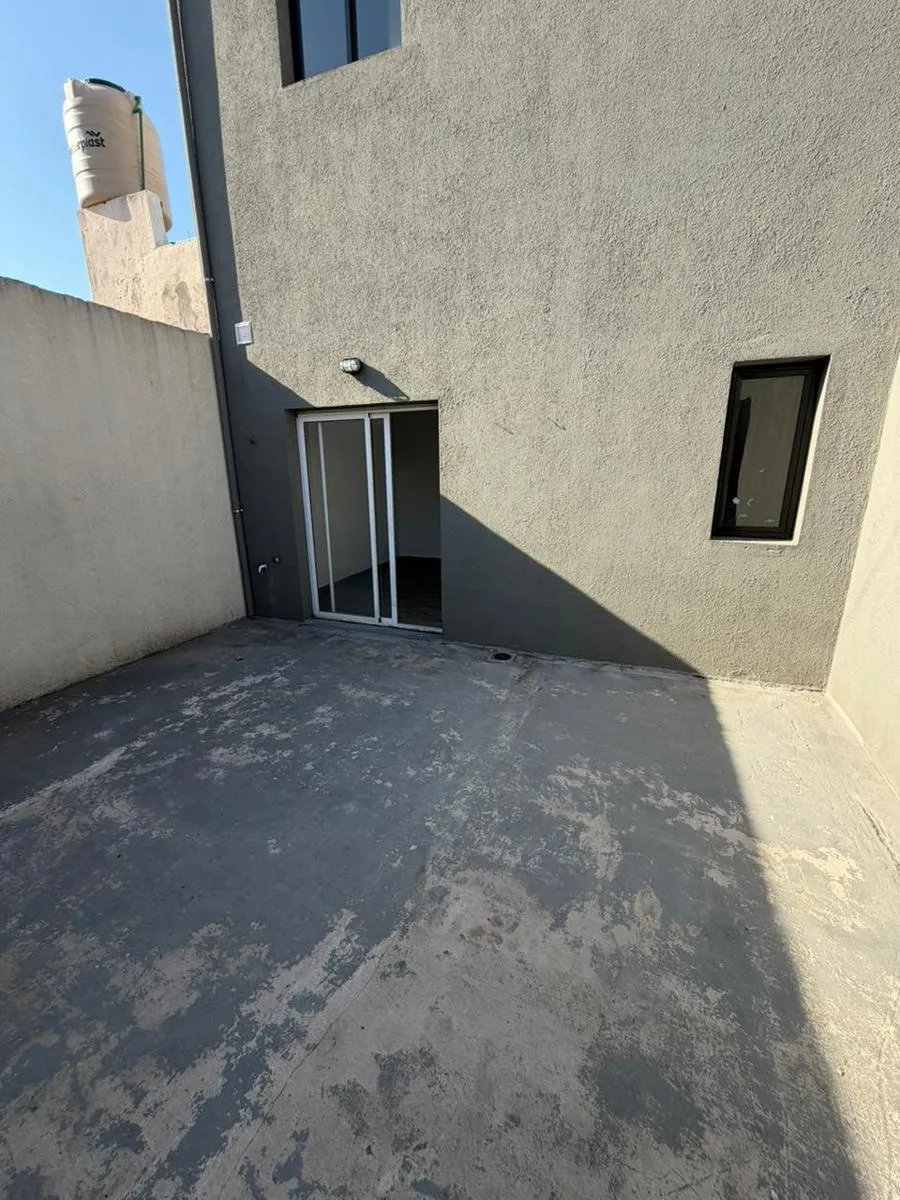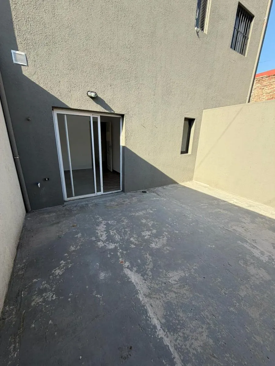 PH de 3 ambientes para alugar, em planta térrea (PB) com pátio, em complexo novo (nunca habitado). O imóvel tem cozinha com área de refeições com pisos que imitam madeira e móveis sob a bancada, além de fogão/placa de 2 bocas e banheiro. Há um dormitório pequeno e um dormitório principal com acesso ao pátio nos fundos.