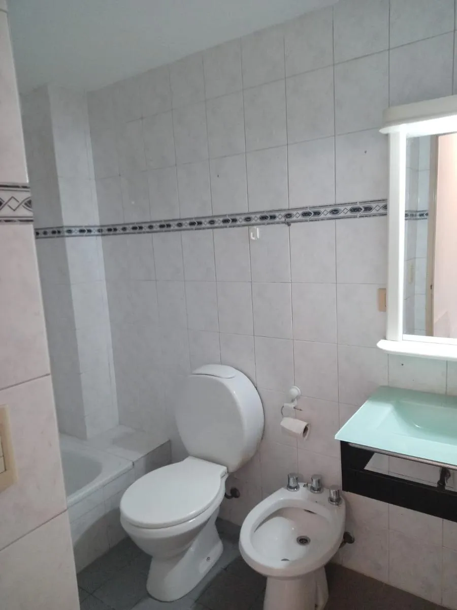 Apartamento de 3 ambientes (2 dormitórios) com vaga de garagem, de frente para a rua, em Banfield Este. Possui sala de jantar com piso cerâmico, estufa a tiro balanceado, ar-condicionado (modo frio) e varanda de frente. Cozinha separada com móveis sob a pia, dois dormitórios com piso flutuante e armários, e banheiro completo com banheira. Contrato de 2 anos, com reajuste trimestral pelo IPC. O valor anunciado não inclui condomínio, serviços e TSG. Exige-se fiança de aluguel e o inquilino deve co