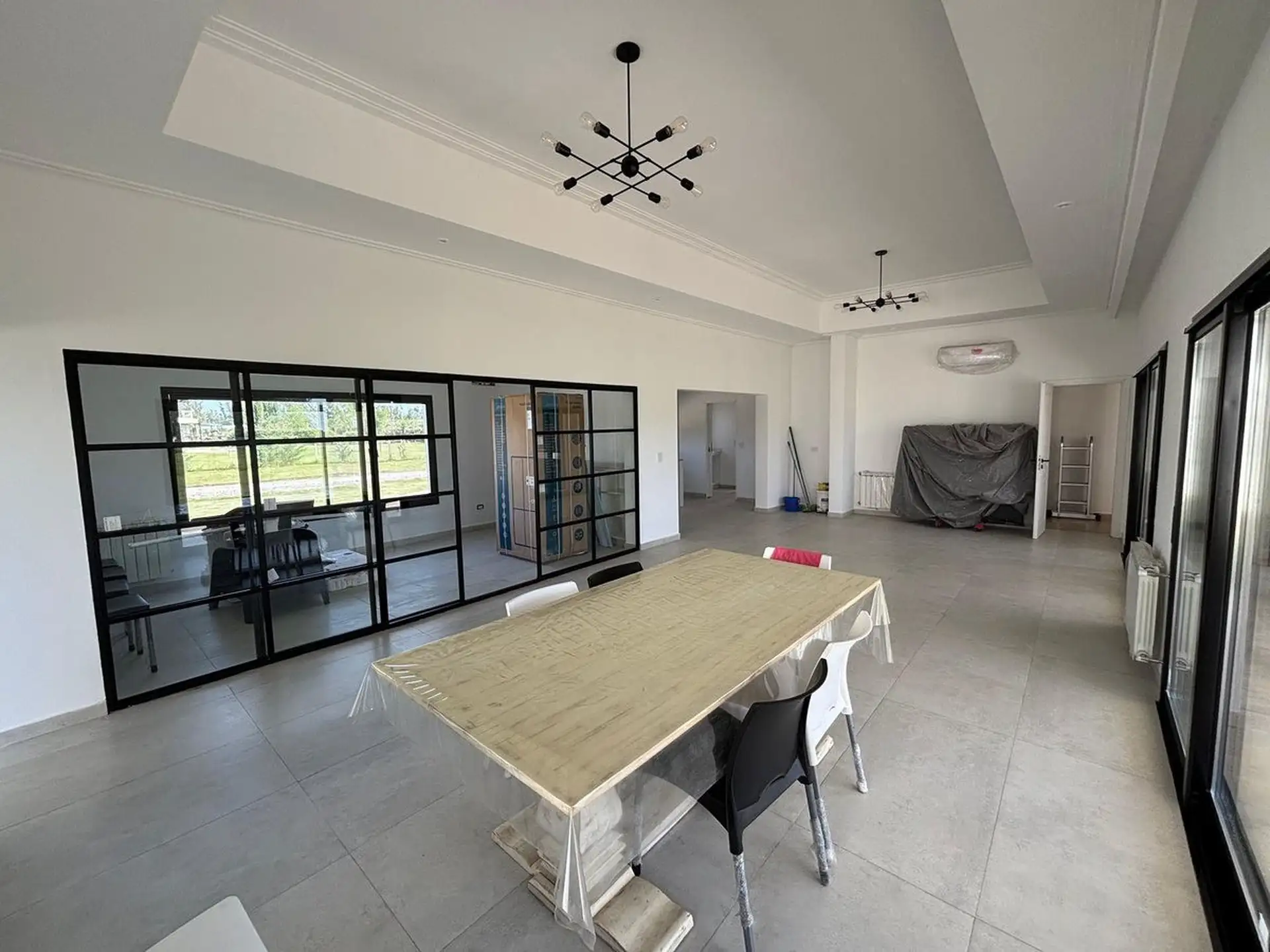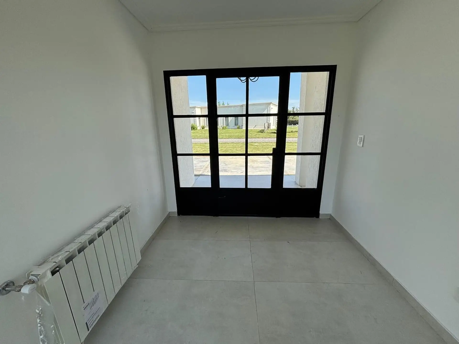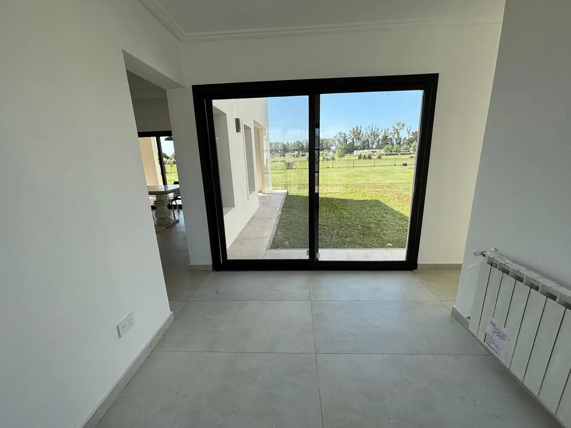 Casa térrea de 4 ambientes em Comarcas de Luján (San Roque), construída em lote de 2000 m². Possui 2 dormitórios, sendo a suíte master com closet e banheiro completo com ducha escocesa, além de sala de estar e jantar com cozinha integrada, área de escritório, galeria com área de churrasco e parque ao fundo. Inclui depósito ou despensa com banheiro externo, irrigação automatizada, bomba d’água e biodigestor, aquecimento por radiadores, espaço para lareira e garagem coberta para 2 carros mais 2 de