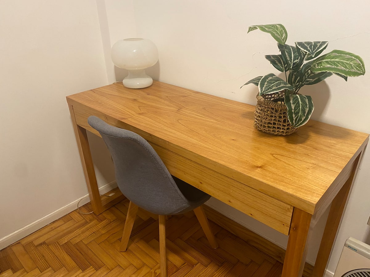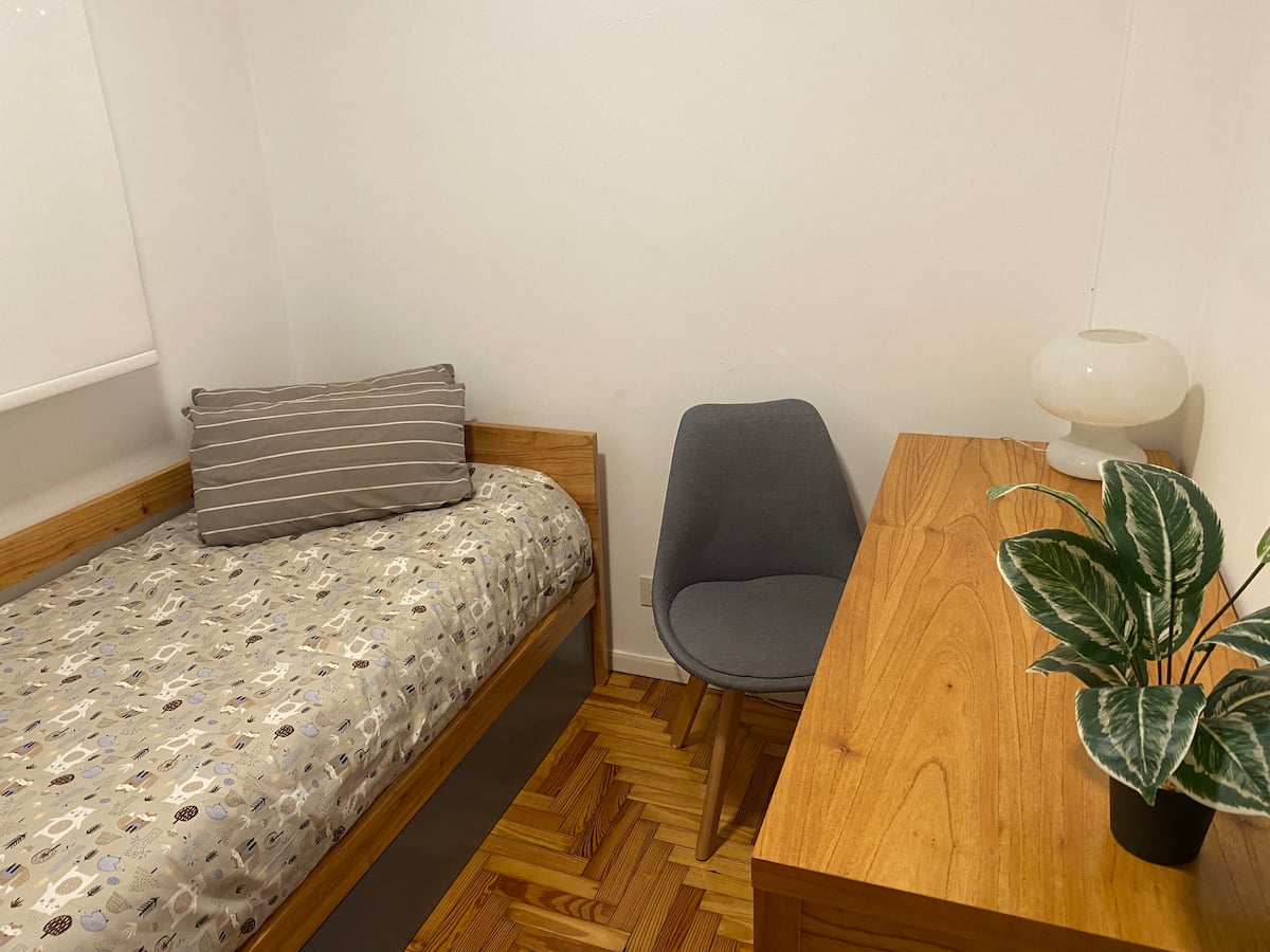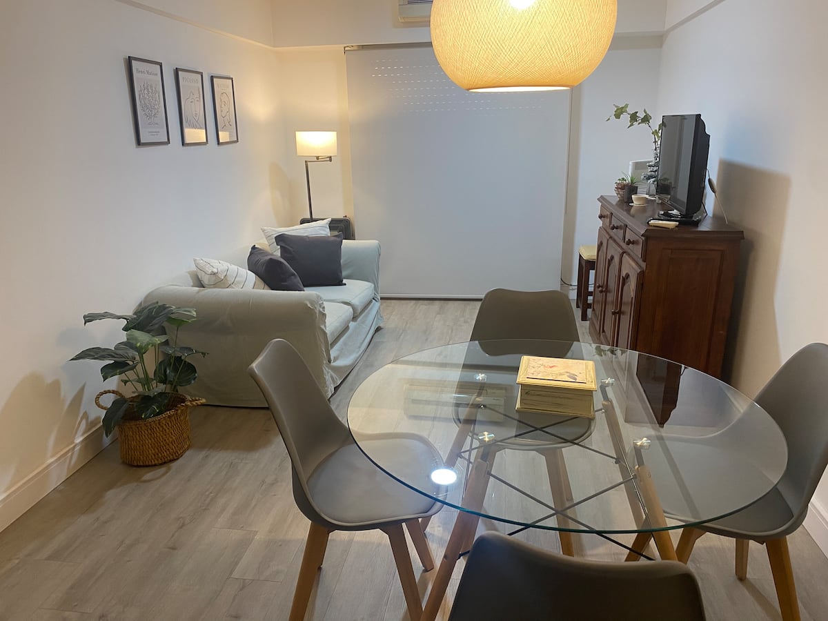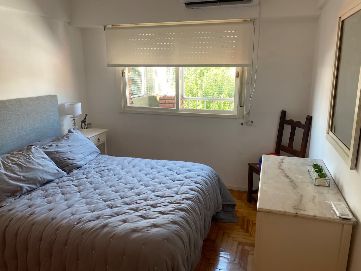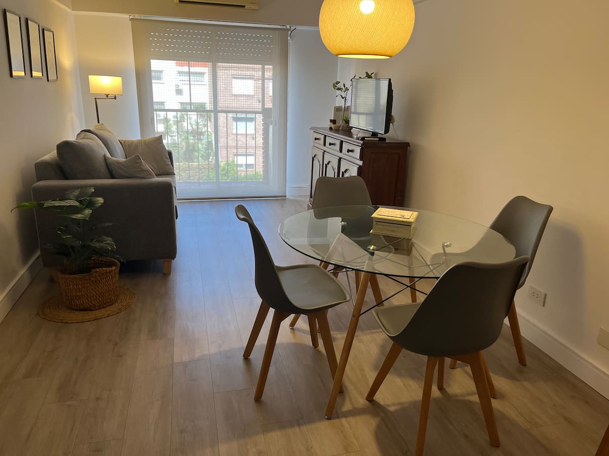 Apartamento de 3 ambientes em Martínez, com 2 quartos. É mobiliado e totalmente equipado, com quarto com cama de casal e segundo quarto com escrivaninha e cama de solteiro. A cozinha é totalmente equipada, com lavanderia que inclui máquina de lavar. Há Netflix e TV online.