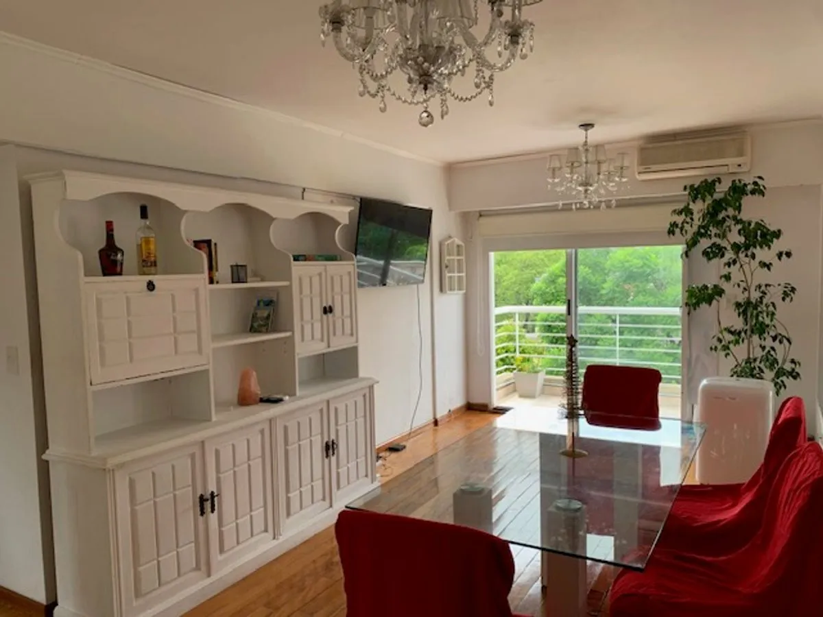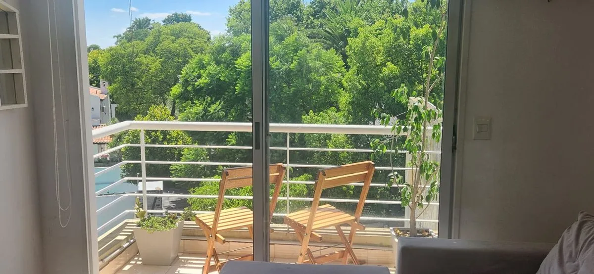 Apartamento mobiliado de 3 ambientes com 62 m² em Martínez, de fundos (contrafrente), em prédio de apenas três pisos. Possui 2 quartos, banheiro completo e lavabo, cozinha com área de refeições e varanda com vista para o miolo de quadra. Inclui vaga de garagem descoberta. Disponível a partir de abril.