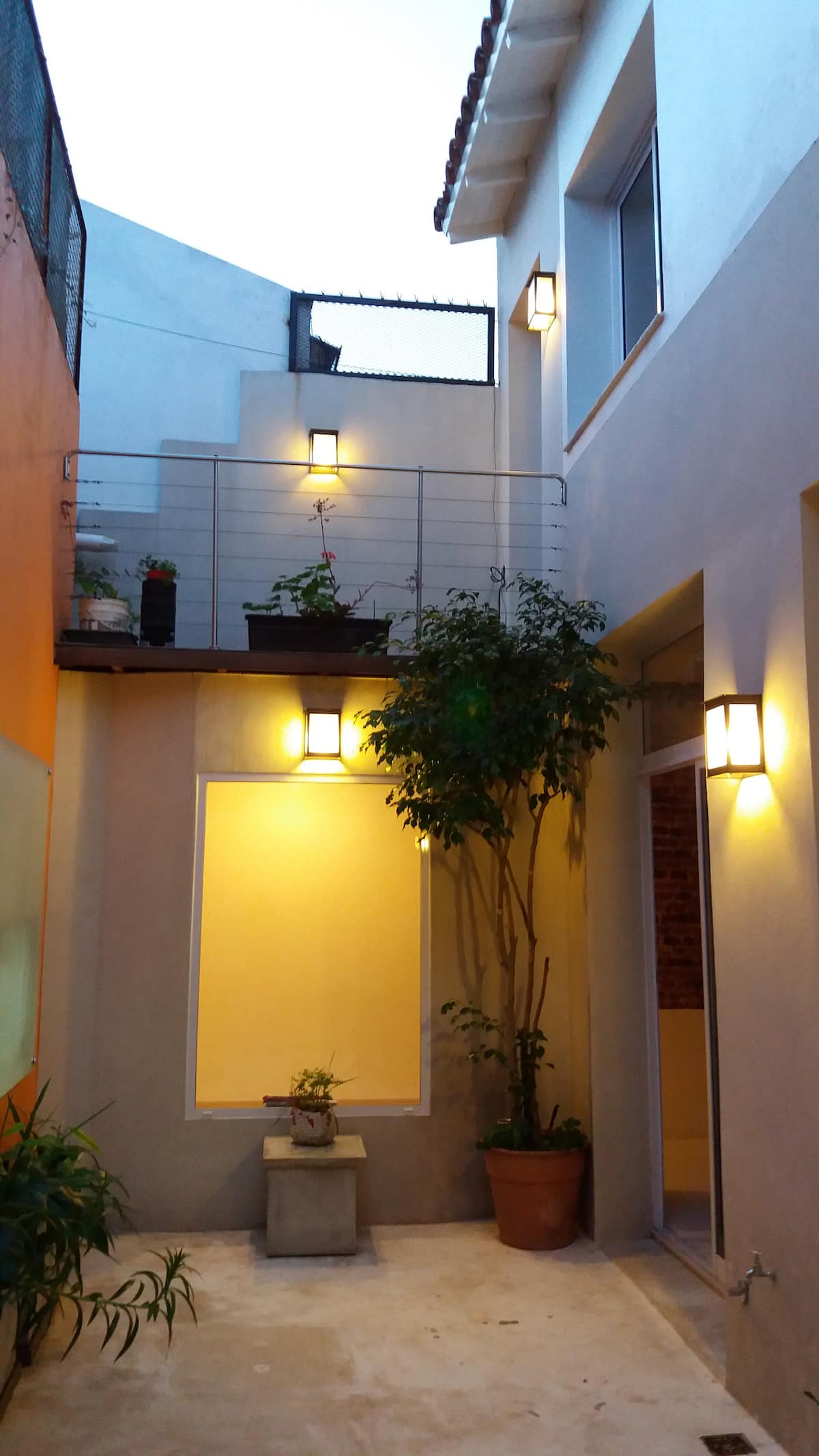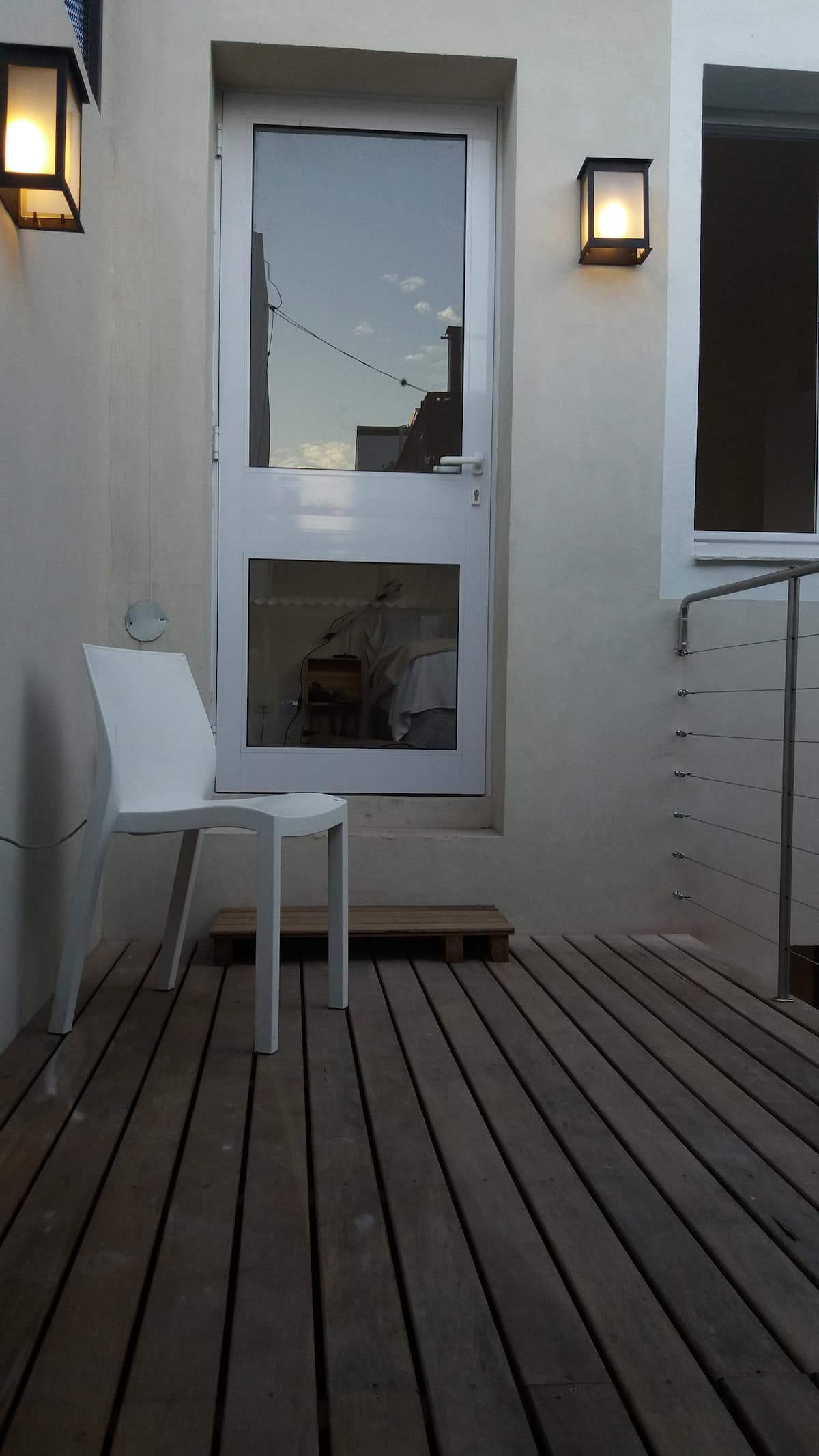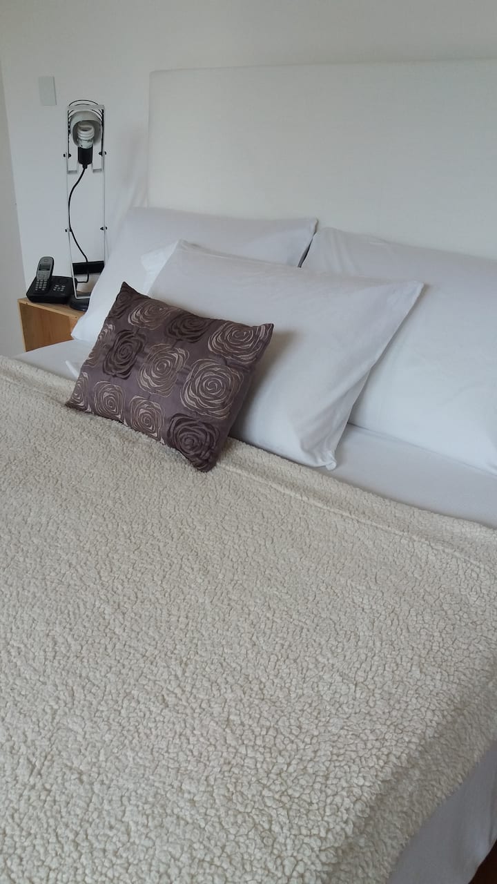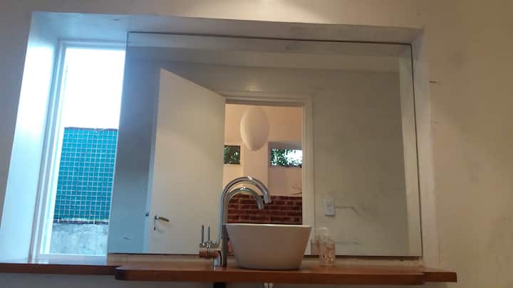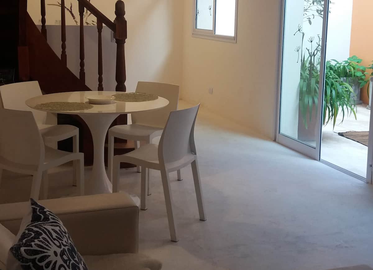 Apartamento com 2 quartos em dois andares, com pátio privativo e terraço. O piso térreo integra cozinha e sala, com vista para o pátio. O pátio tem cerca de 20 m² e o terraço é privativo e fica ao lado do quarto principal. Há Wi-Fi de 24 megabytes; canais a cabo e lock box. No apartamento há cafeteira, micro-ondas, forno elétrico e torradeira. São disponibilizados café, chá, açúcar, adoçante e leite em pó para preparo de chocolates. No quarto principal há máquina Nespresso com kit de cápsulas. T