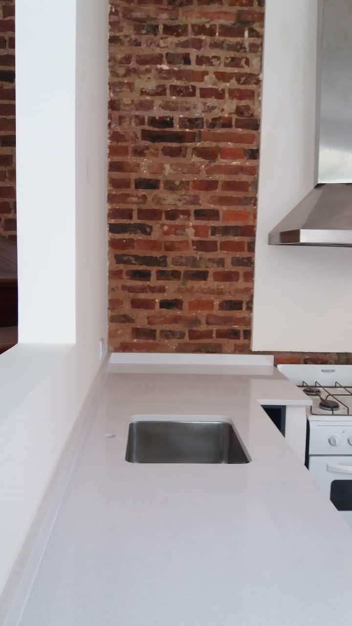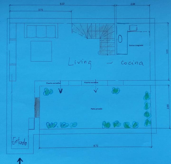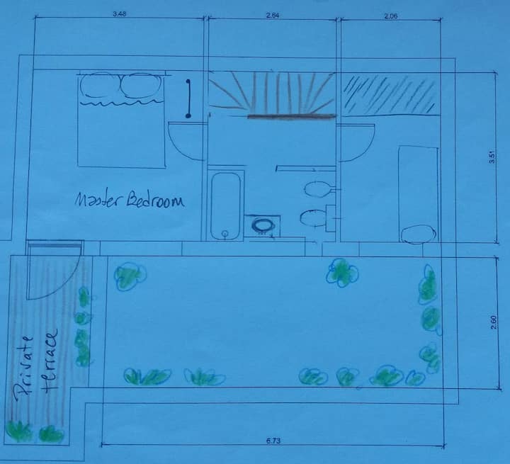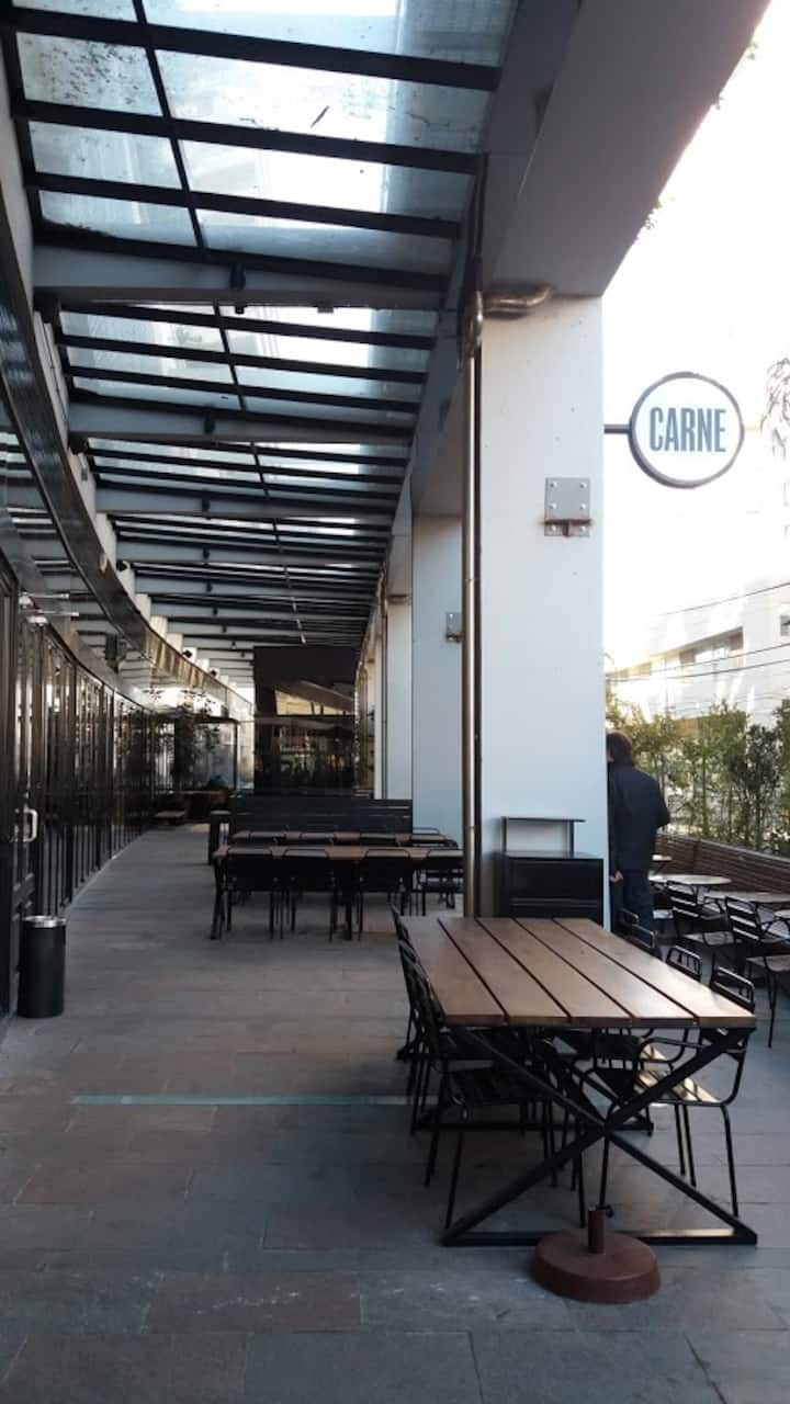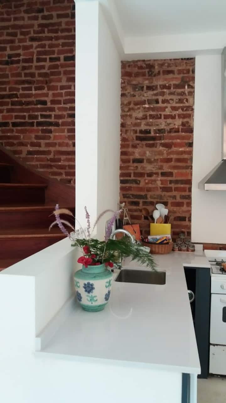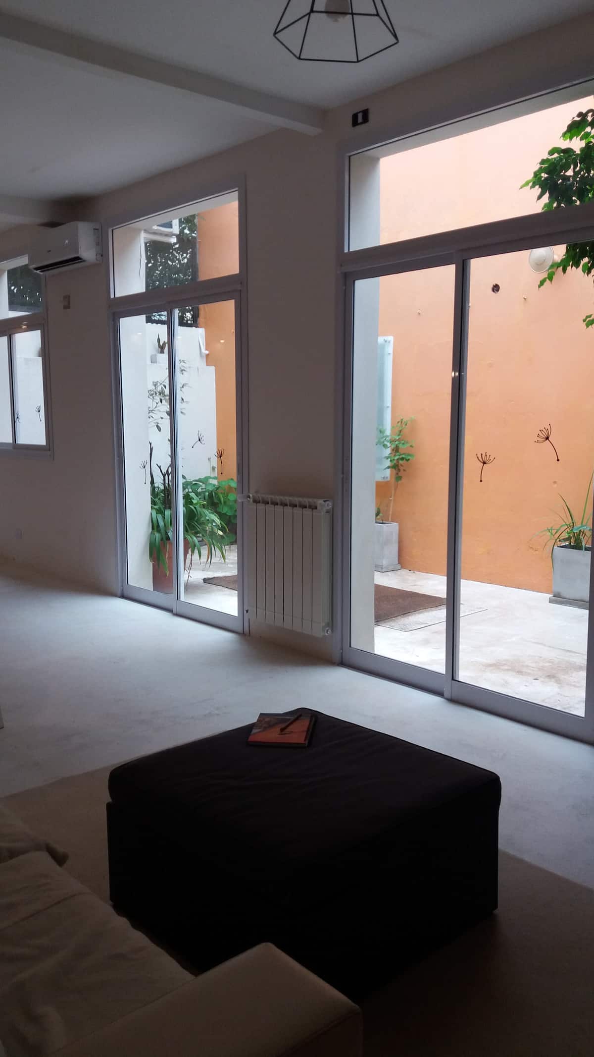 Apartamento com 2 quartos em dois andares, com pátio privativo e terraço. O piso térreo integra cozinha e sala, com vista para o pátio. O pátio tem cerca de 20 m² e o terraço é privativo e fica ao lado do quarto principal. Há Wi-Fi de 24 megabytes; canais a cabo e lock box. No apartamento há cafeteira, micro-ondas, forno elétrico e torradeira. São disponibilizados café, chá, açúcar, adoçante e leite em pó para preparo de chocolates. No quarto principal há máquina Nespresso com kit de cápsulas. T