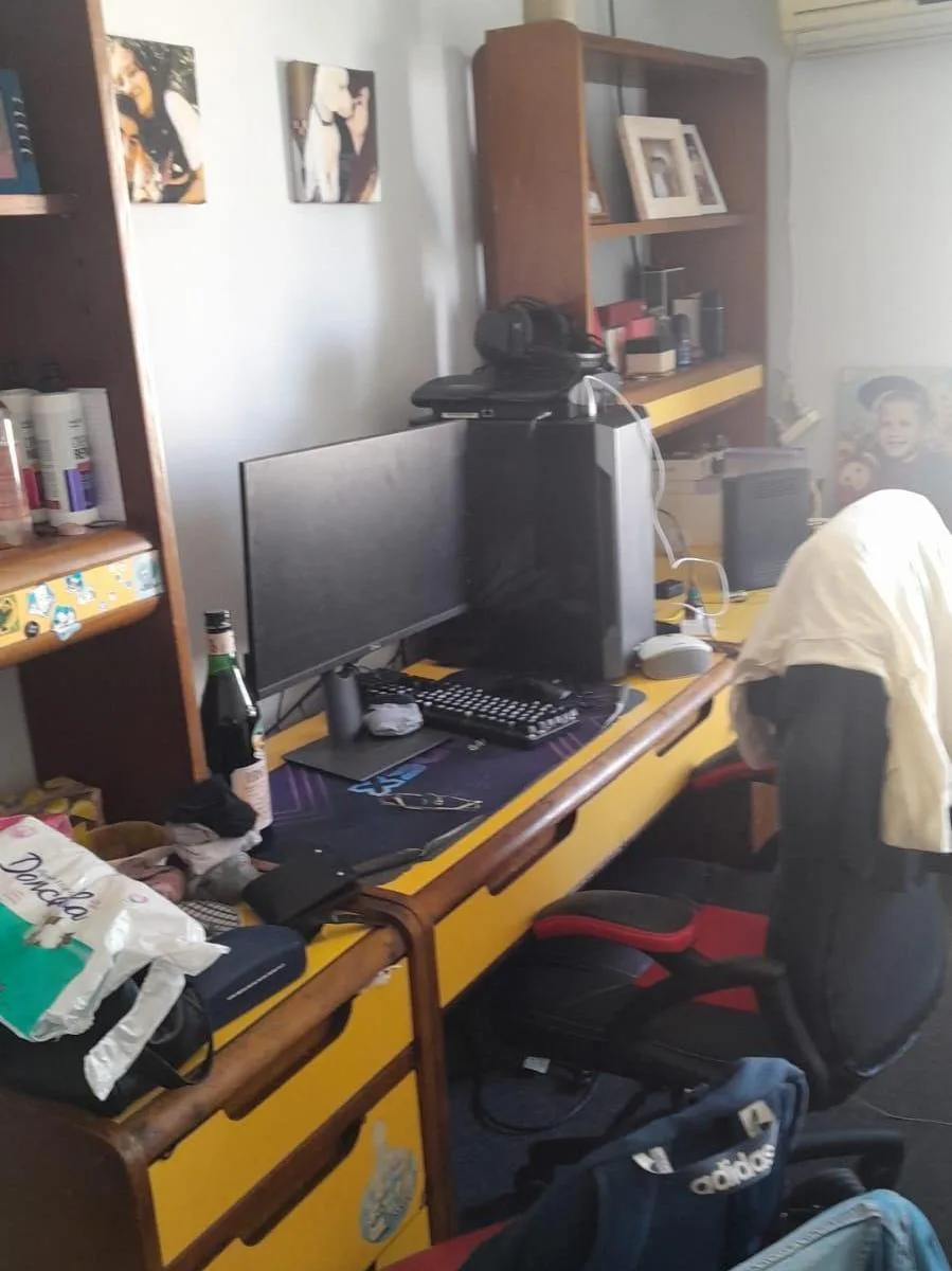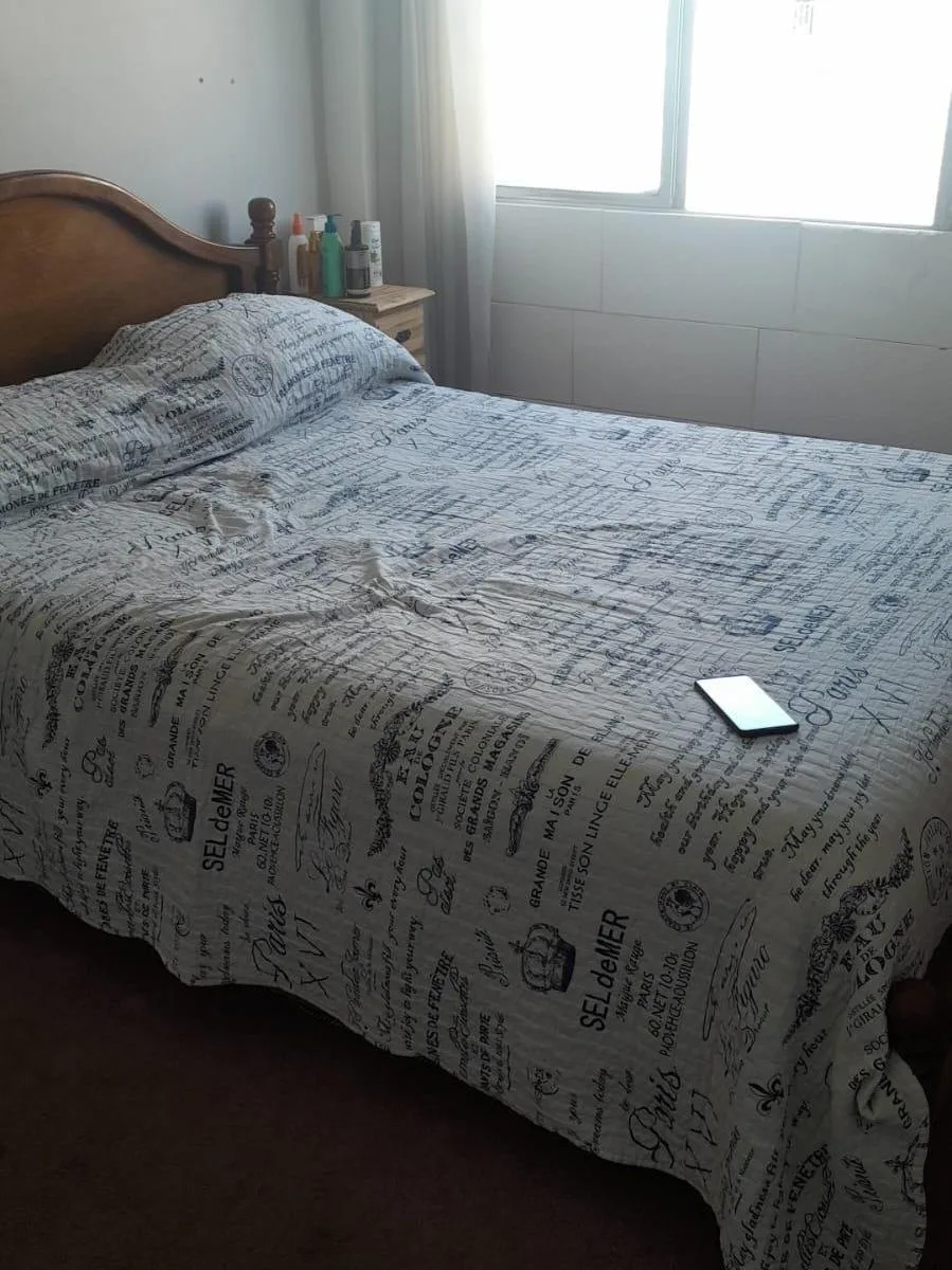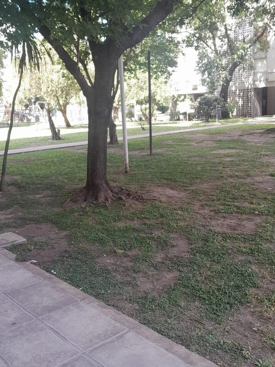 Apartamento de 3 ambientes, de frente para a rua, no 9º andar, no Complejo Parque Norte, com espaço de garagem fixa. A planta tem 7 x 3 com pisos de lajota negra, cozinha de 3 x 2,40 com armários sob e sobre a bancada, lavanderia independente de 2 x 1,50, dois dormitórios de 3 x 3 com armários e banheiro completo com banheira, além de hall de distribuição de 3 x 1. Todos os ambientes dão para a rua, com vista panorâmica; o complexo tem jardins com área de recreação infantil, campo de futebol, so