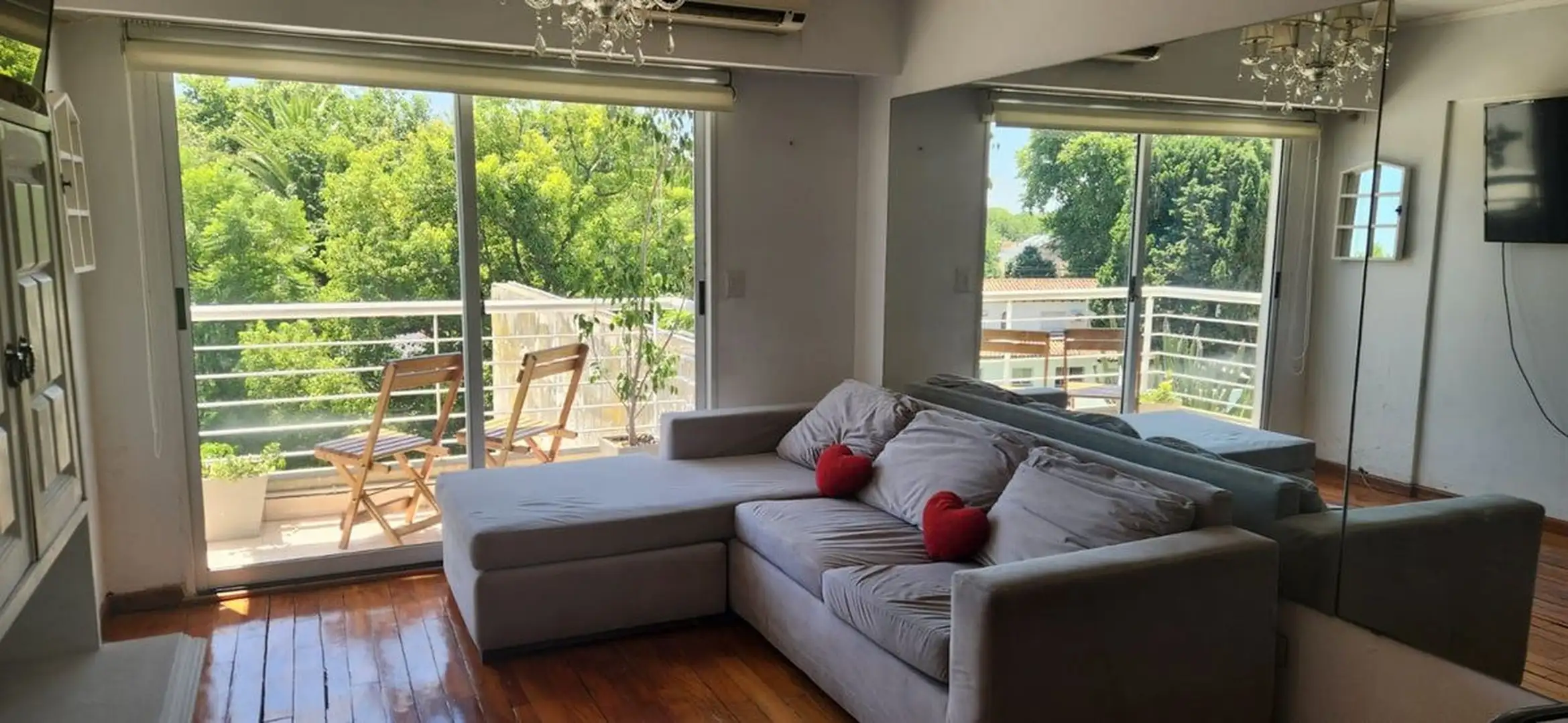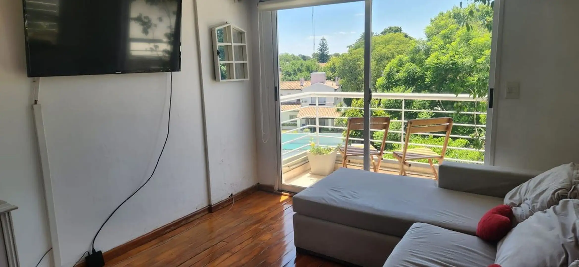 Apartamento de 3 ambientes mobiliado e equipado, com 62 m², no contrafrente. Fica em Martínez, sobre Av. Santa Fe, em prédio de apenas três andares. Possui 2 quartos, 1 banheiro completo e 1 lavabo, cozinha com área de refeições, varanda com vista para o miolo de quadra e vaga de garagem descoberta. Há visitas a partir de abril.
