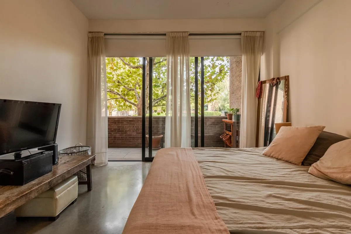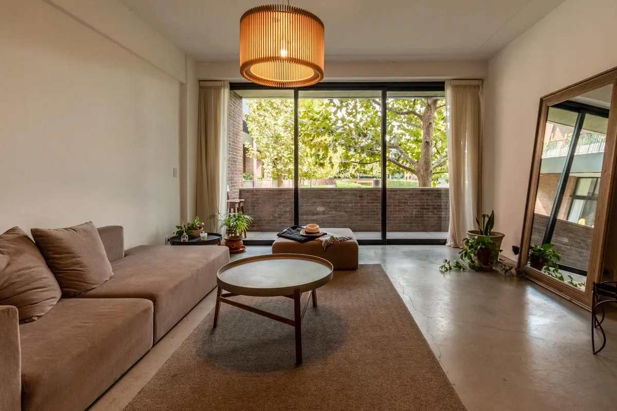 Apartamento em San Isidro Loft, em Martínez, com 2 quartos. O imóvel tem grande living com cozinha integrada, pisos de cimento alisado e pé-direito alto, além de banheiro completo. O living e o quarto principal têm janelas amplas com saída para um pátio tipo varanda, com vista para o parque central e sol de tarde. O complexo conta com segurança 24 horas, parque central com piscina, solarium, academia, vestiários e lavanderia. Condomínio inclui ABL e AySA. Possui vaga de garagem (fixa) e depósito