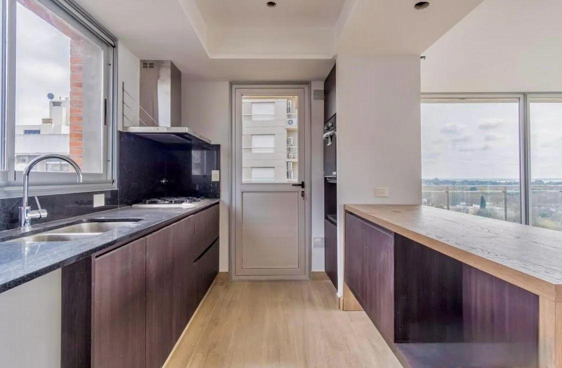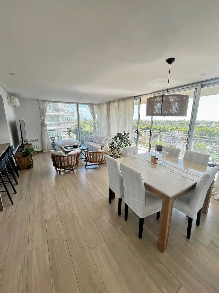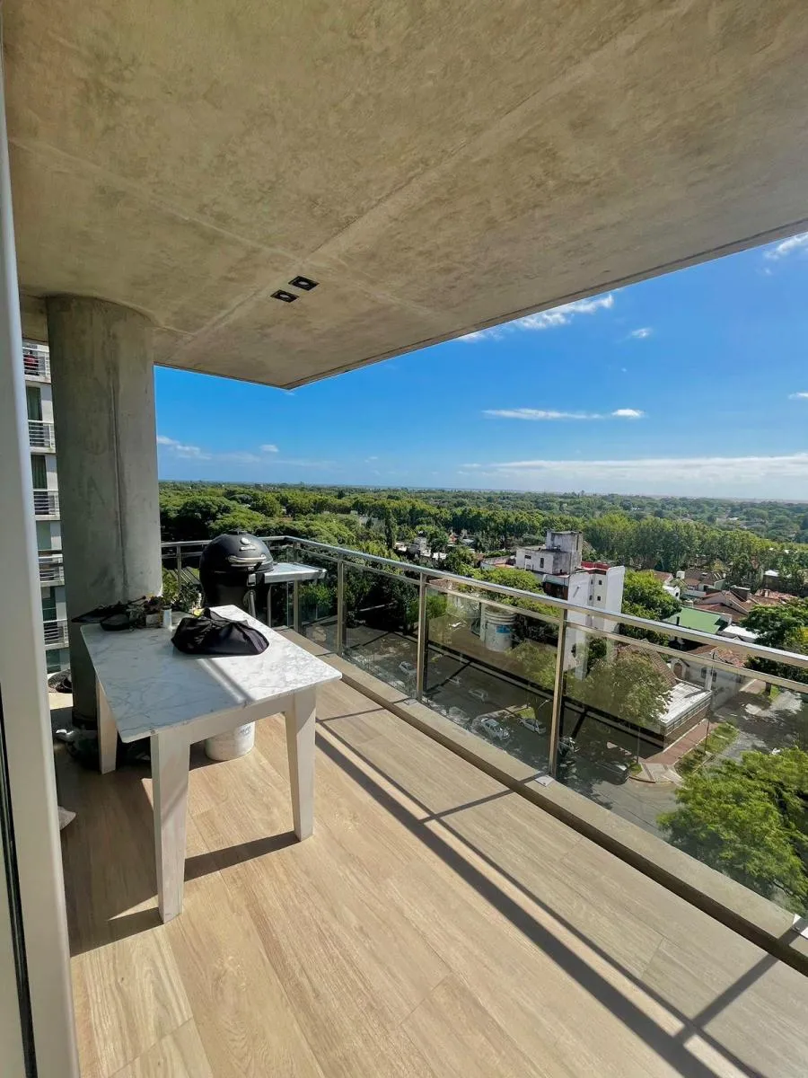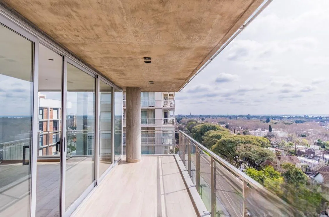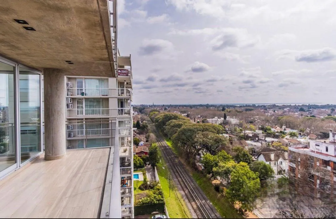 Apartamento de 3 ambientes no Edificio Quadrus (Torre Sarmiento), em Martínez, com vista para o rio. Inclui palier privativo, lavabo, sala de estar e jantar com acesso a varanda tipo terraço, cozinha semi-integrada com bancada e armários, 2 banheiros (1 deles na suíte principal) e quartos com armários. O imóvel conta com 2 vagas de garagem fixas e 1 depósito (baulera), além de piscina, terraço e área de churrasco no prédio.