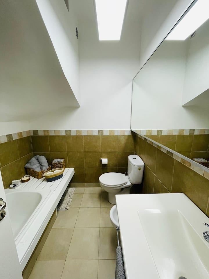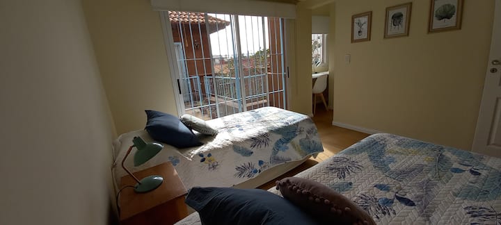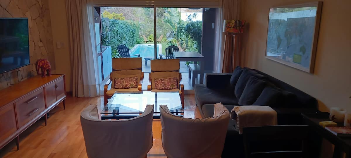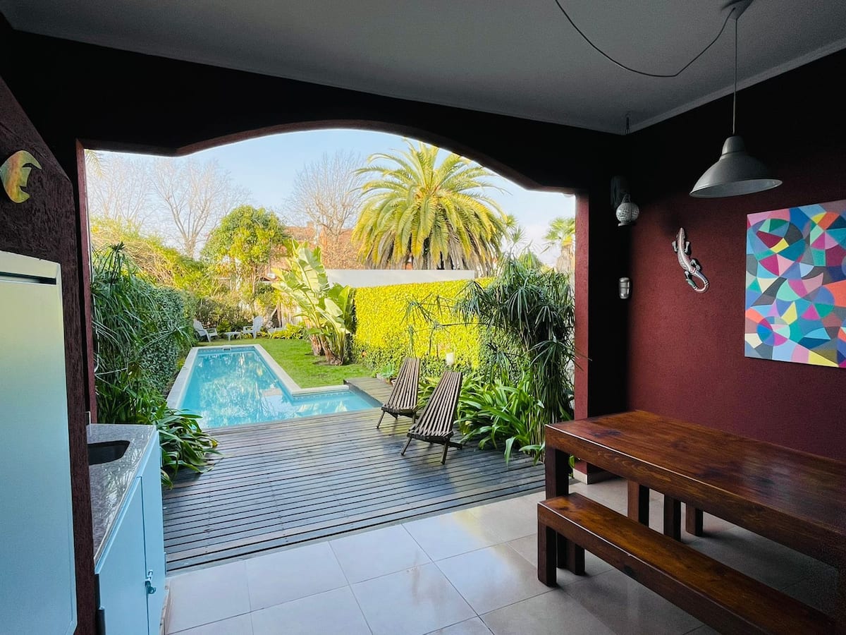 Casa/duplex em área residencial de Martínez, com 2 quartos. A sala tem acesso ao jardim. Há galeria coberta com área de churrasco e piscina, além de cozinha completa com área de refeições do dia. No térreo há lavabo e, no andar superior, dois quartos e 1 banheiro completo com banheira. Um dos quartos tem cama super king (2x2), TV e dois closets; o outro tem 2 camas de solteiro (80x1,90), mesa e roupeiro, com acesso a varanda/terraço. Conta com aquecimento central com caldeira, ar-condicionado no
