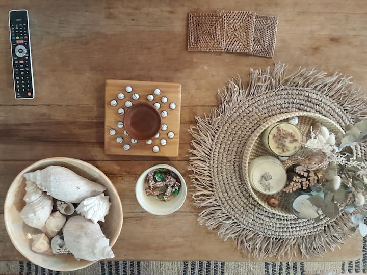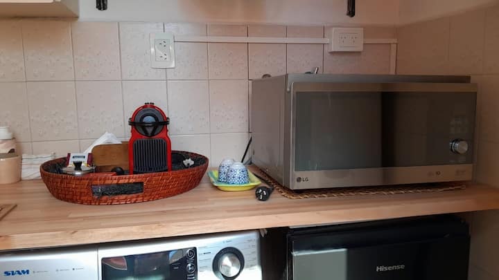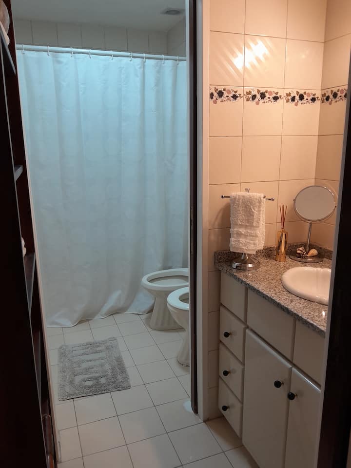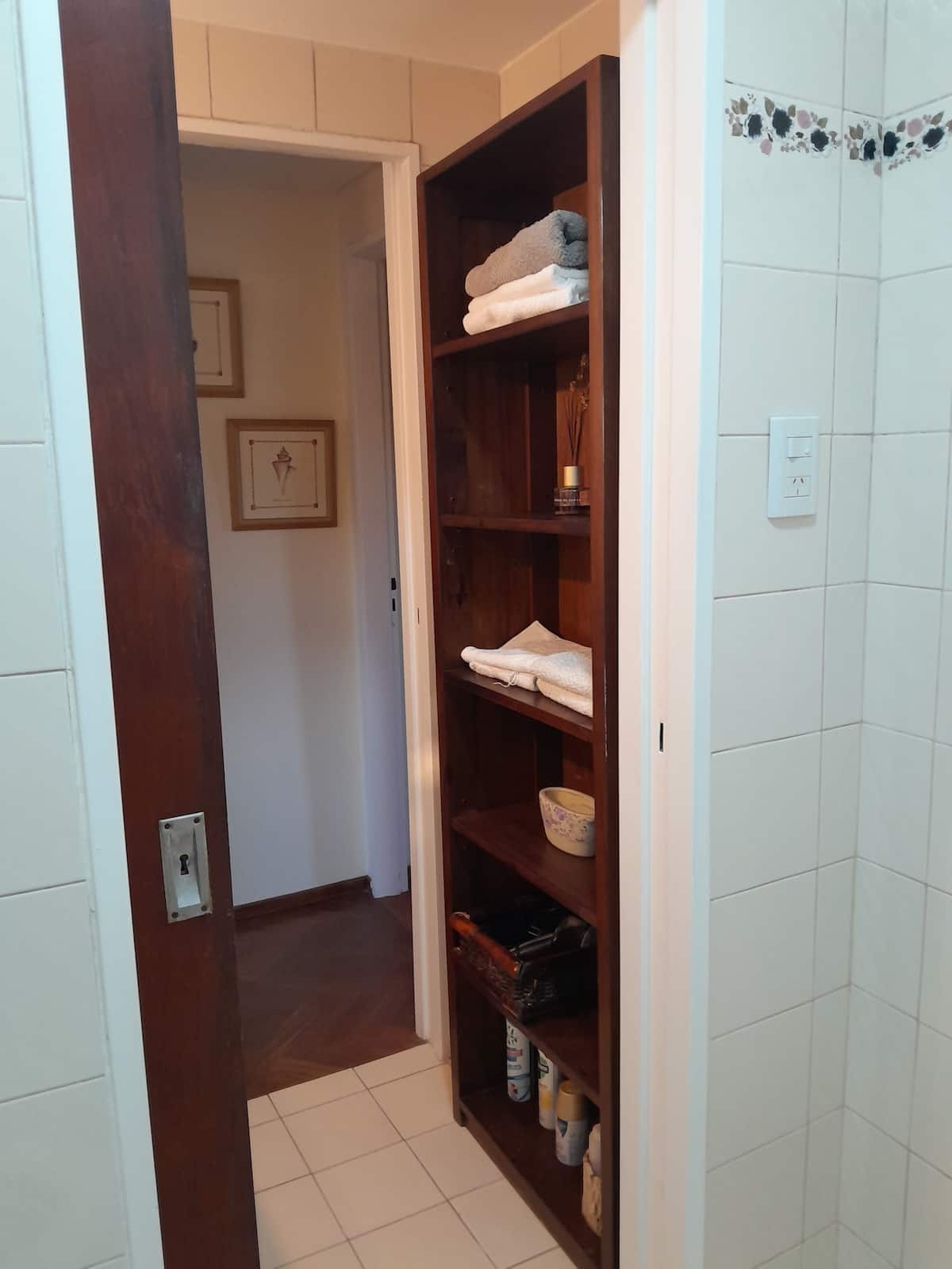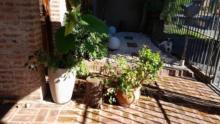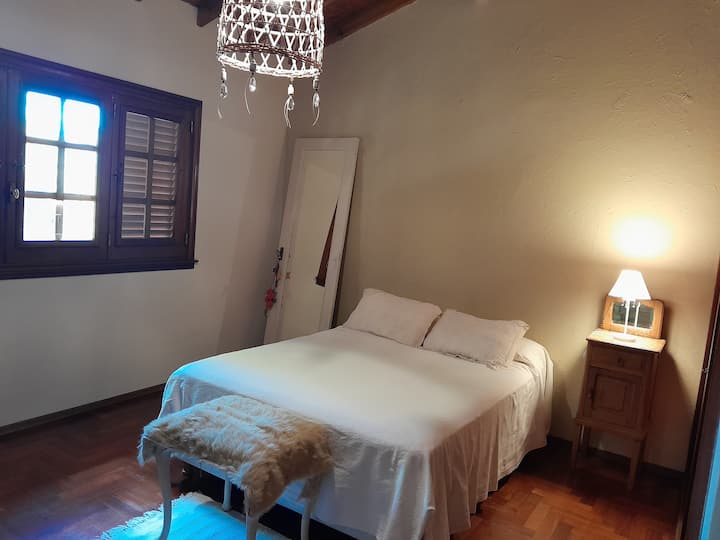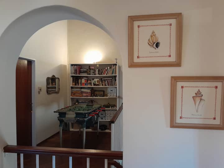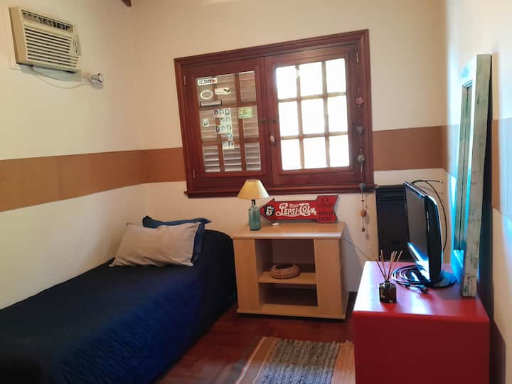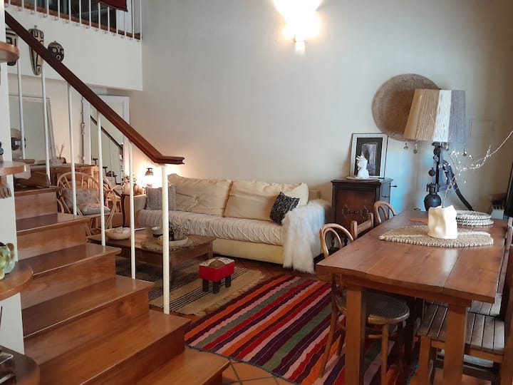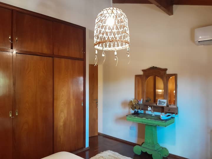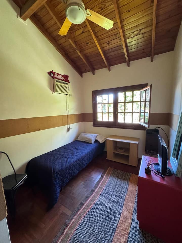 Casa em Martínez com 2 quartos em 2 andares e vaga de garagem. No térreo há sala de estar e sala de jantar. No piso superior há 2 quartos (1 cama de casal e 1 cama de solteiro), banheiro completo, kitchenette e área com mesa de futebol profissional, além de biblioteca e terraço com vista. Há ar-condicionado nos quartos; animais não são permitidos. O acesso é individual, com check-in por portão compartilhado com a hospedagem próxima.