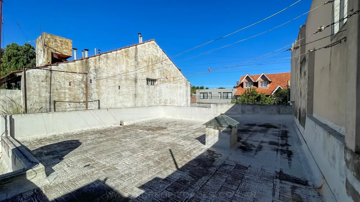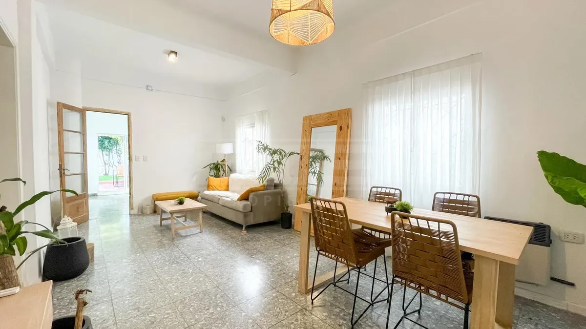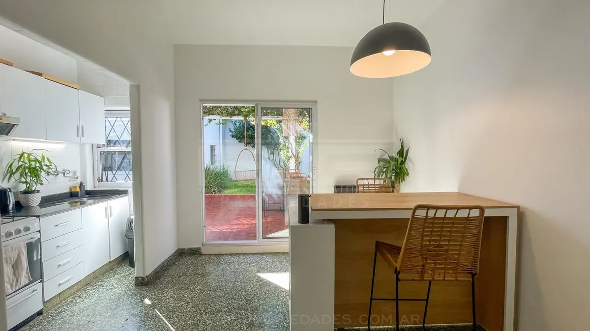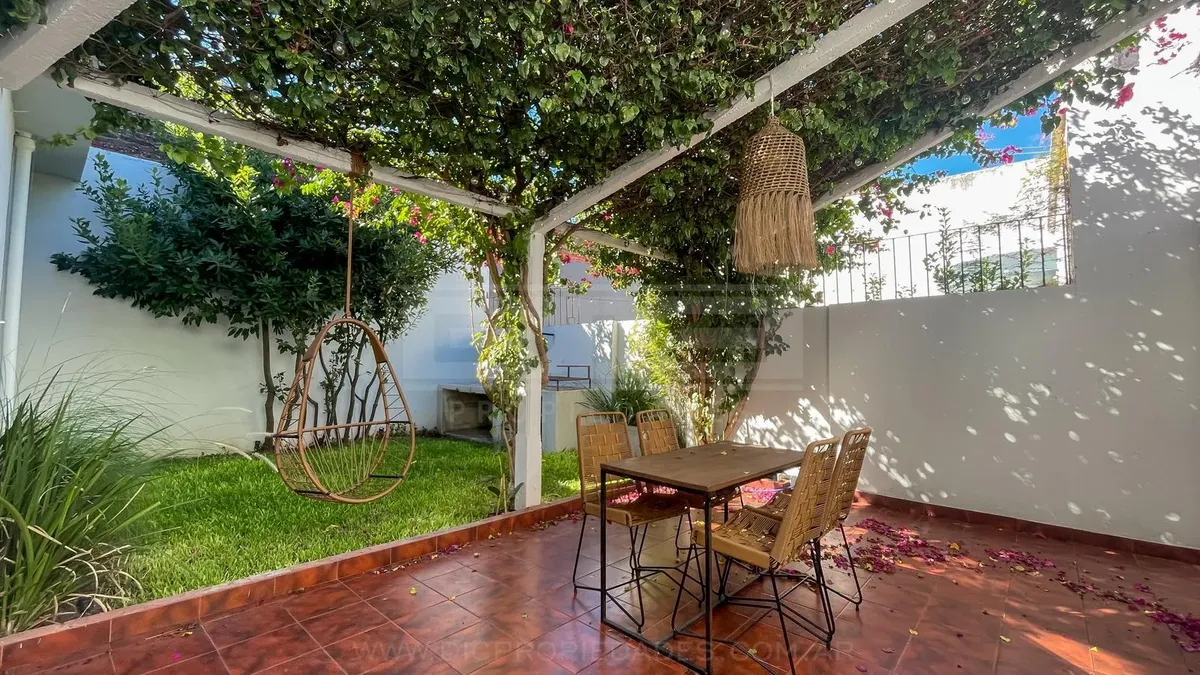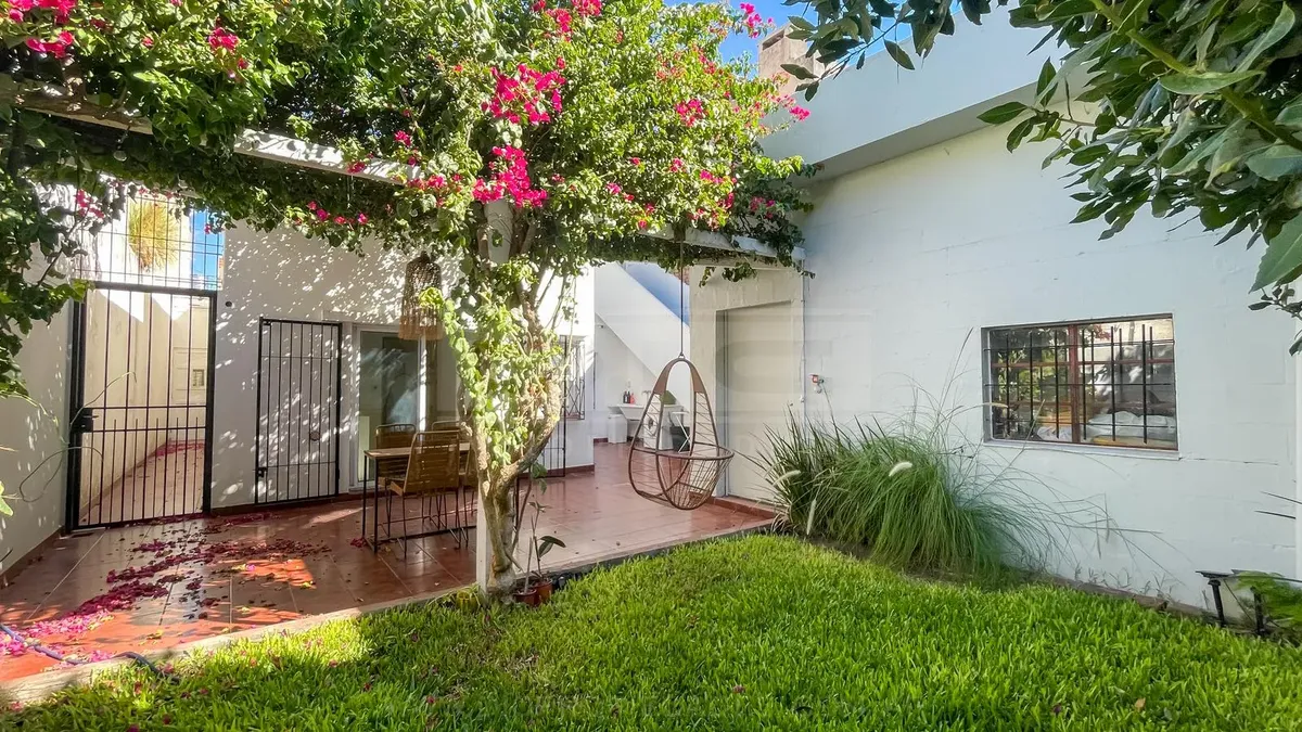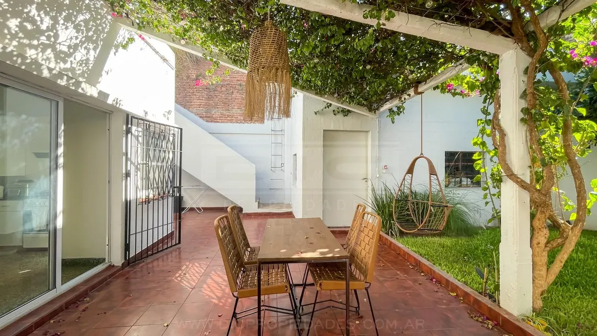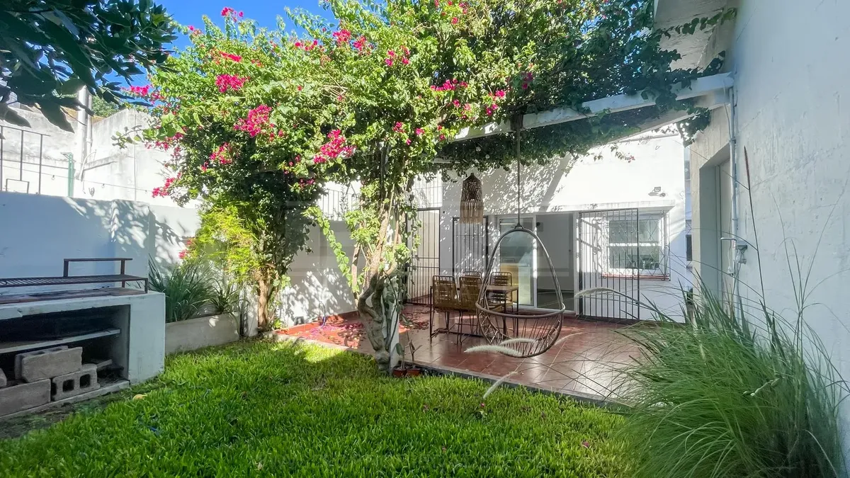 Casa de 3 ambientes em um único piso, em um lote de 8,66 x 25,33, com boa iluminação por sua orientação. Tem jardim na frente, garagem para 2 autos, entrada principal e de serviço, living com área de jantar, 2 dormitórios, banheiro completo, cozinha com armários e espaço para refeições no dia a dia, além de saída para um pátio e jardim com área de churrasco. Inclui área de serviço com lavanderia, depósito que pode ser usado como um ambiente adicional e ampla varanda/terraço.