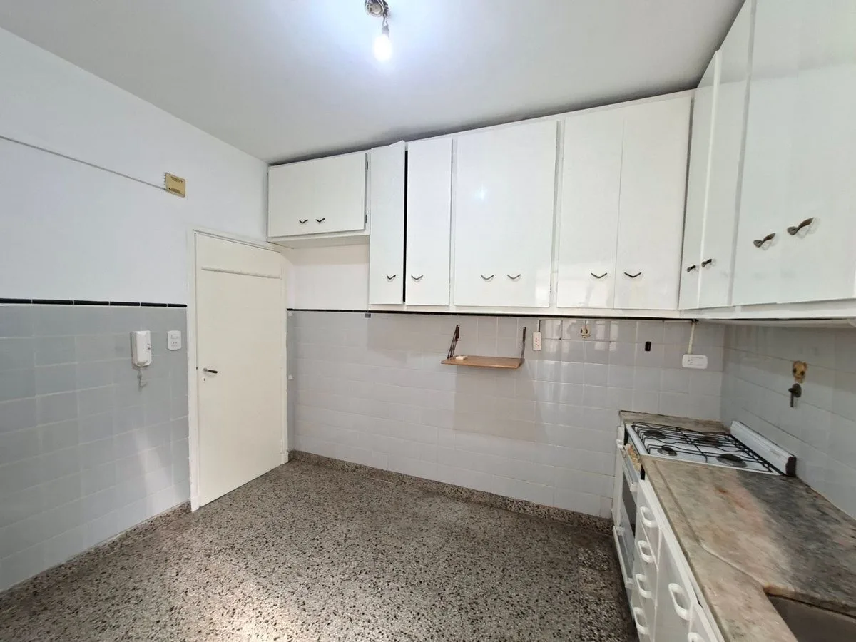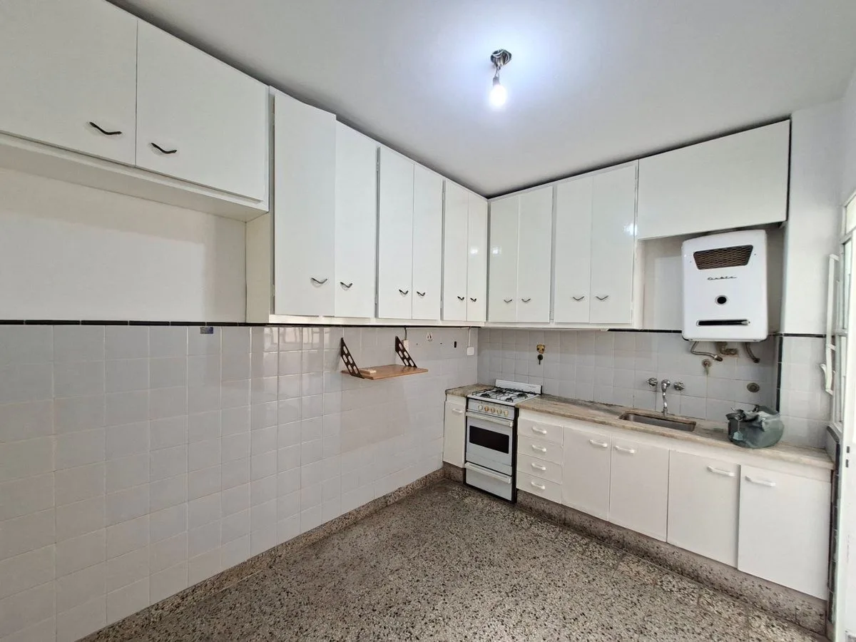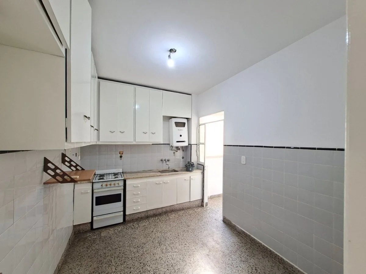 Apartamento de 3 ambientes com 2 dormitórios em Mataderos. O imóvel tem sala com saída para varanda contínua, cozinha integrada com área de refeições e banheiro completo com banheira. Inclui lavadero independente e acesso por escada; o edifício conta com terraço de uso comum. Contrato de 2 anos, com 1 mês de adiantamento e 1 mês de depósito; fiança de garantidor, ajuste trimestral pelo IPC e o prédio não aceita animais.