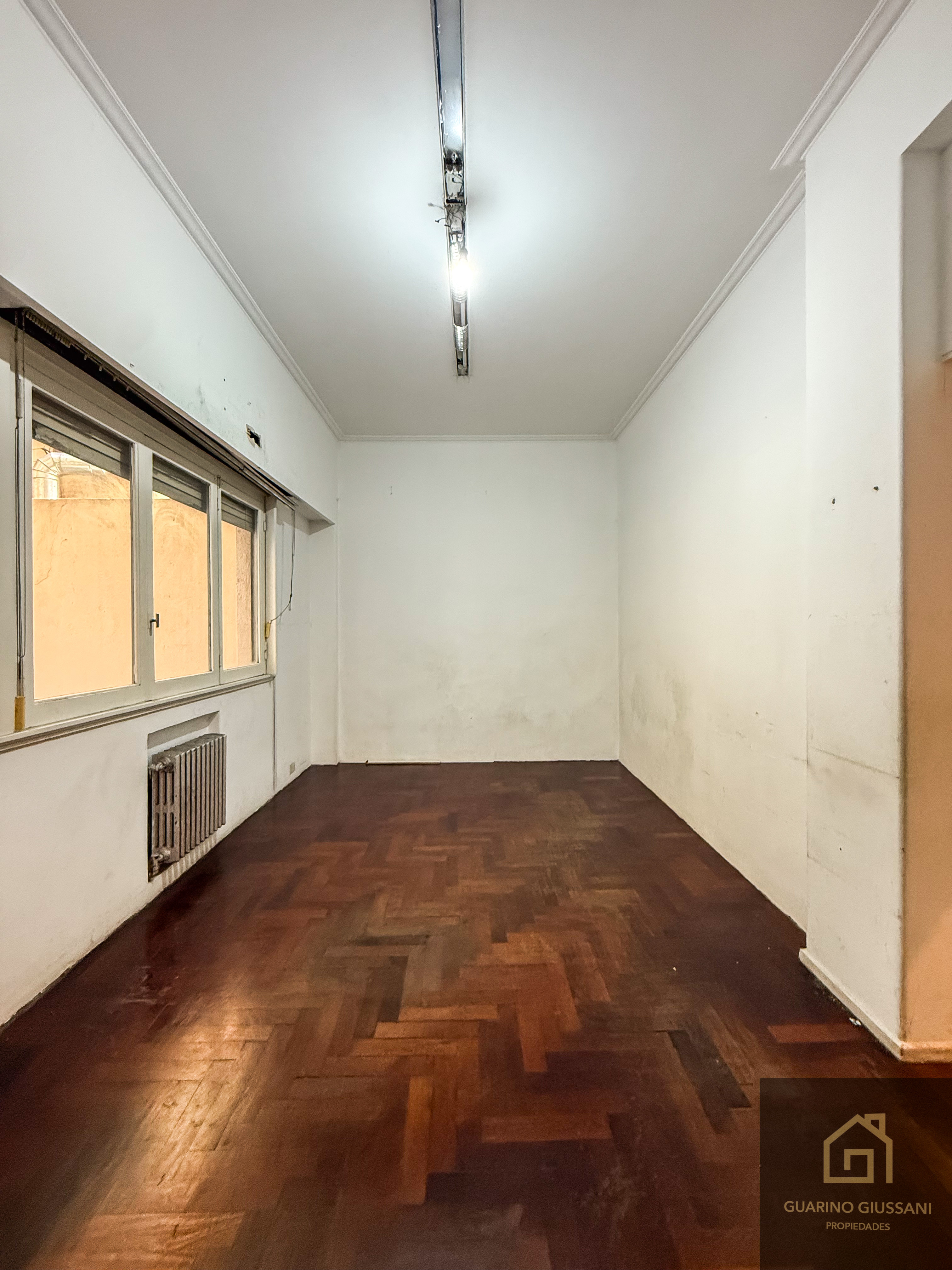 Apartamento de 3 ambientes com sala de estar e jantar, 2 dormitórios (um com armários embutidos e outro menor) e banheiro completo. Cozinha pequena com saída para a área de serviço. O condomínio está incluído.