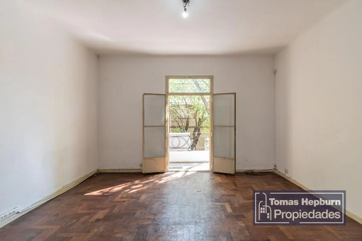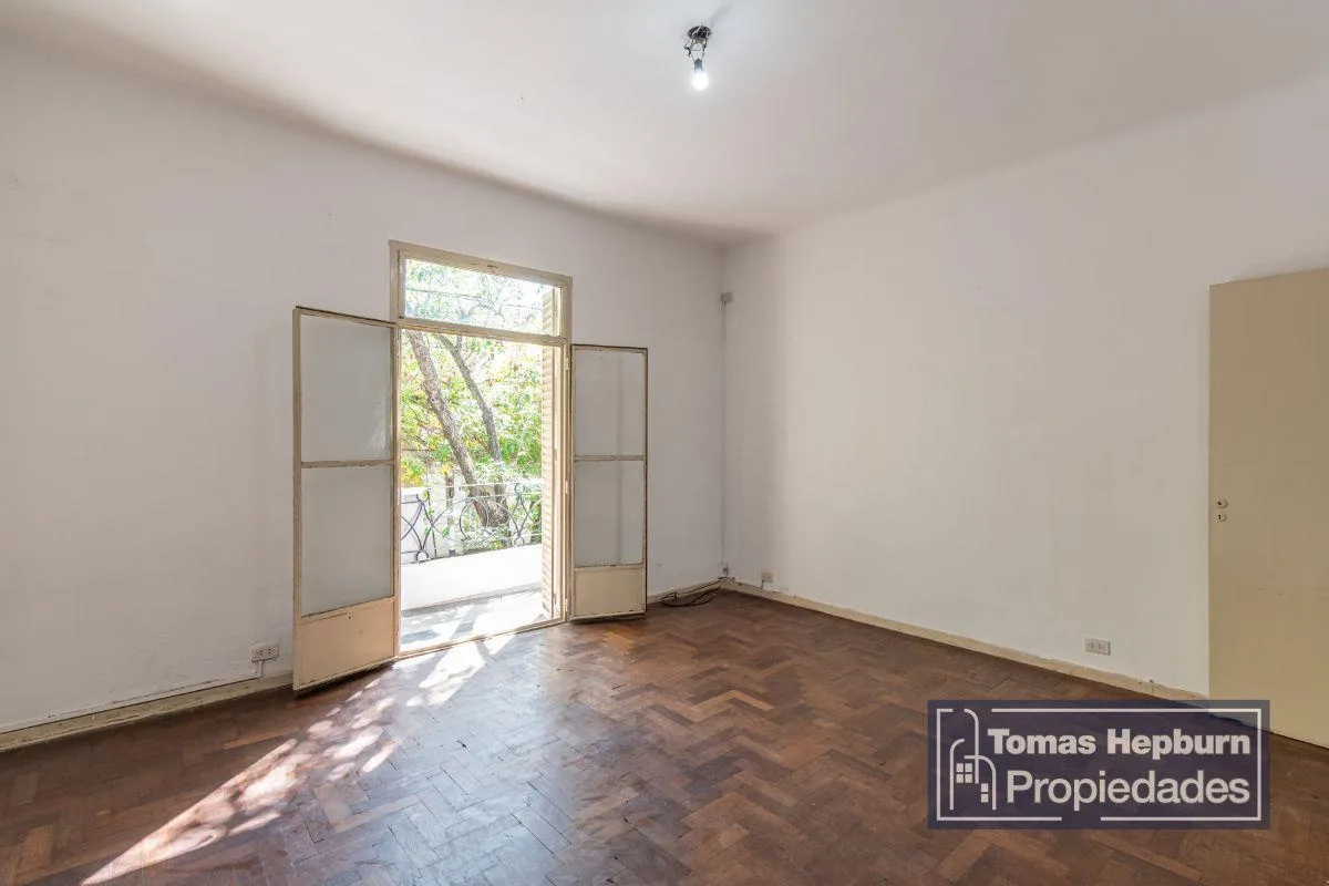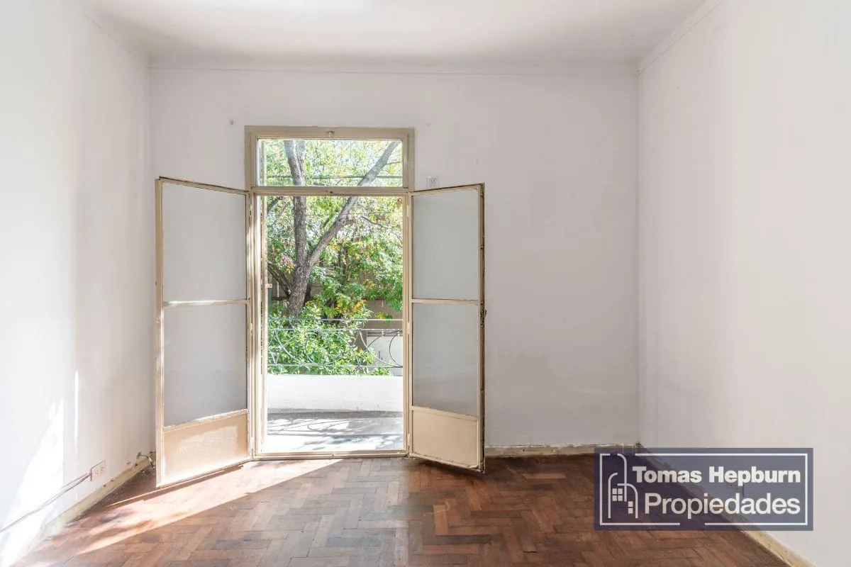 Apartamento semipiso de 3 ambientes com varanda de frente. A unidade fica em um prédio de época com 2 andares e apenas 4 unidades (2 por andar). A entrada é por um primeiro andar por escada; a planta liga hall, sala de estar e jantar, 2 dormitórios, banheiro e cozinha com área de lavanderia separada. Há varanda corrida na frente, acessada pela sala e pelo dormitório principal. O imóvel é 100% elétrico e não tem gás natural; o condomínio é de aproximadamente $90.000, incluindo AYSA. Contrato de 2
