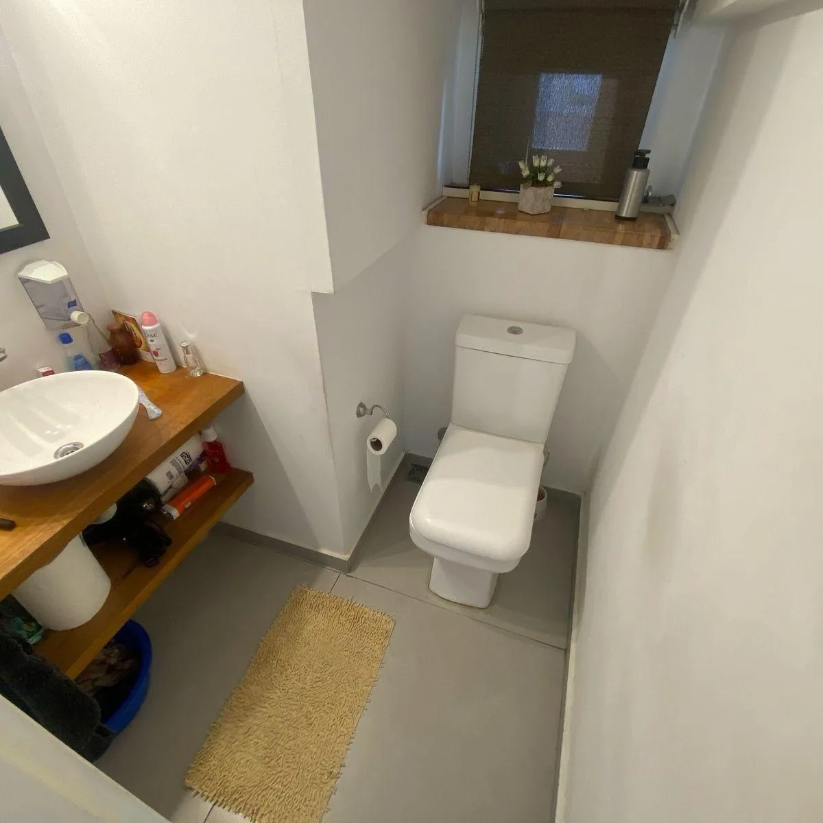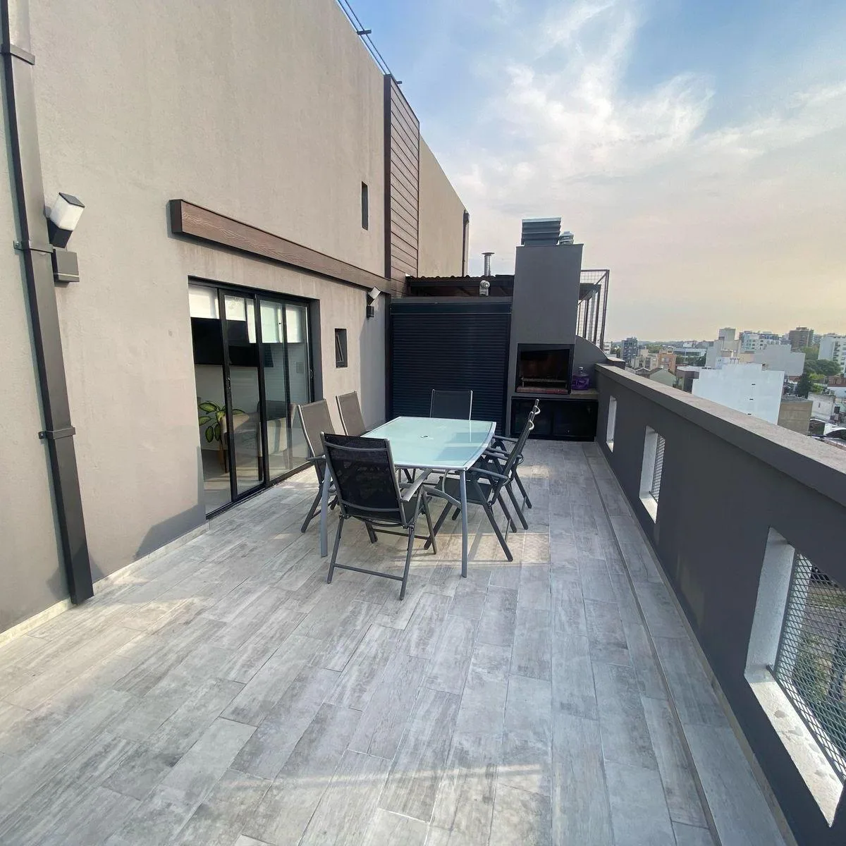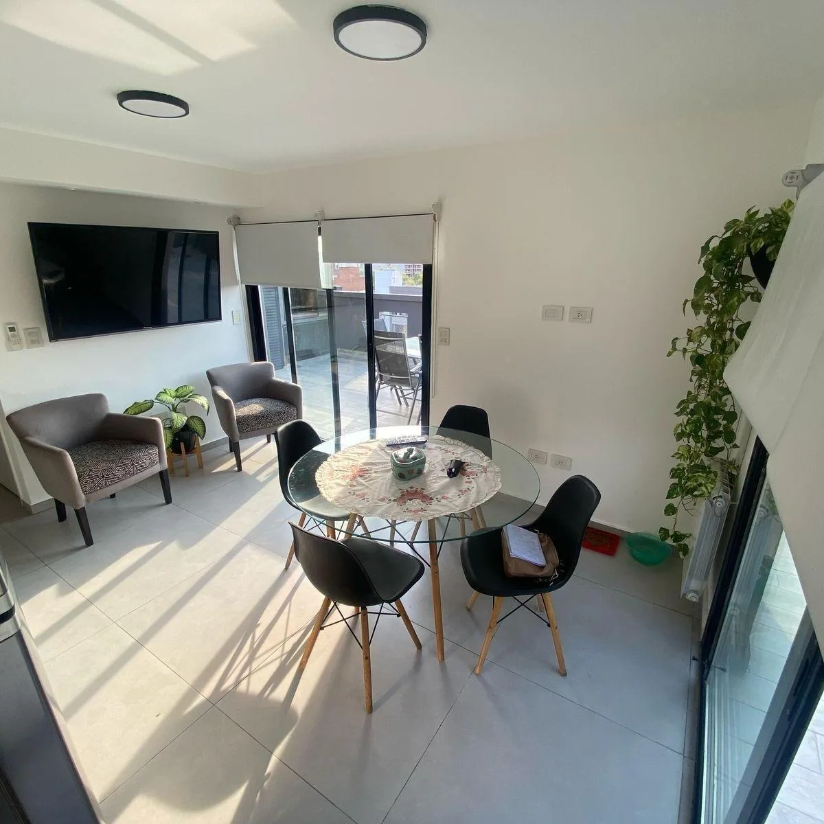Apartamento de três ambientes em Morón, em pátio térreo (planta no térreo). Possui cozinha integrada com sala de jantar, 1 dormitório e lavabo. A sala tem janelas amplas com vista para pátio-terraço com área de churrasco. No primeiro andar, há 1 dormitório em suíte com banheiro completo e uma varanda corrida coberta. O imóvel conta com aquecimento por radiadores, piscina e quincho, além de vaga de garagem.