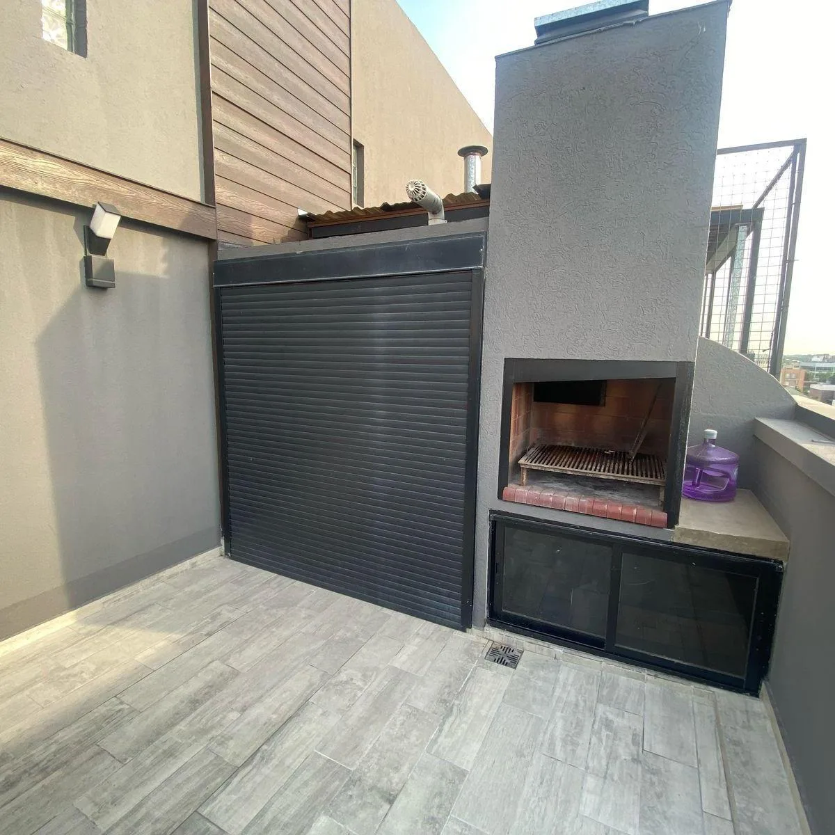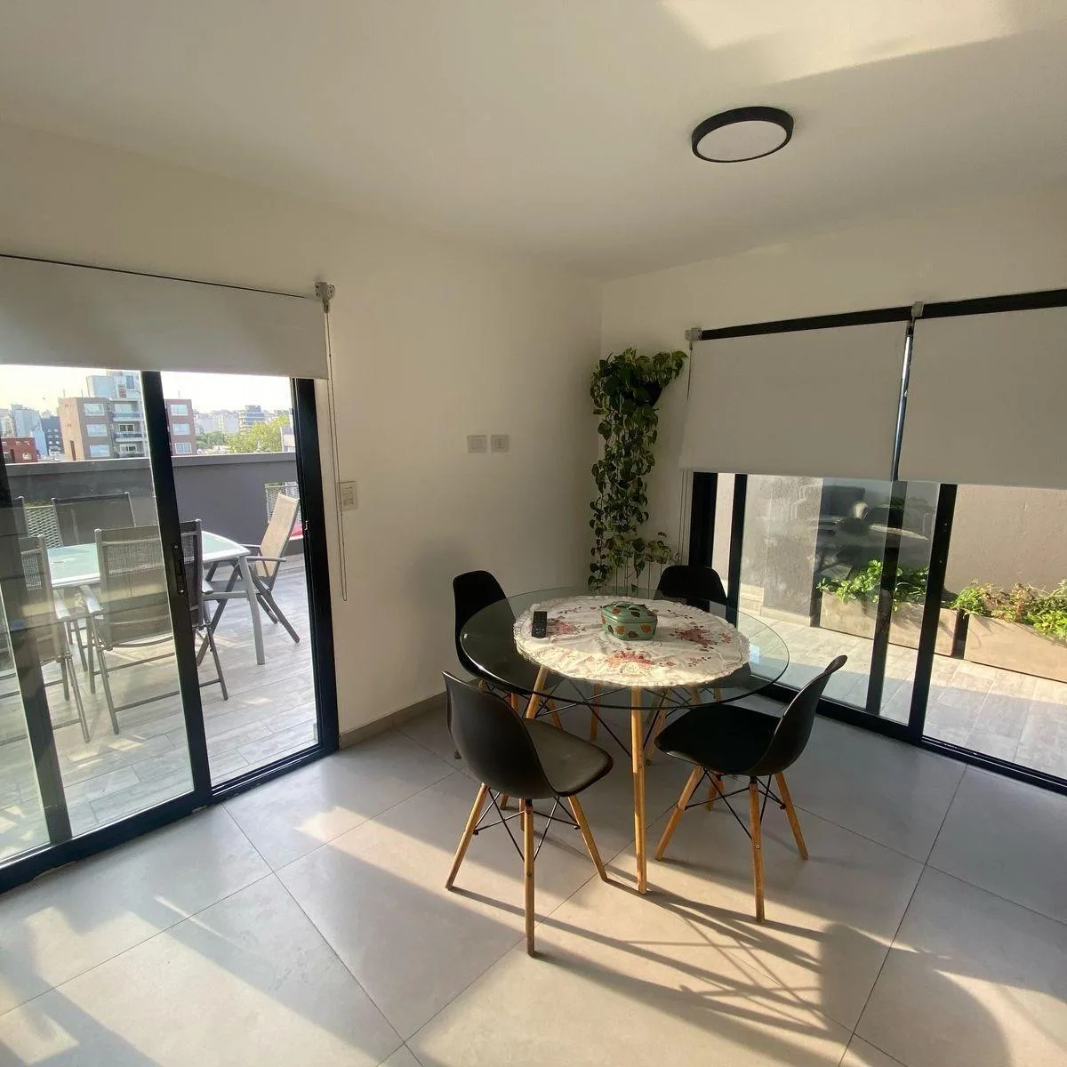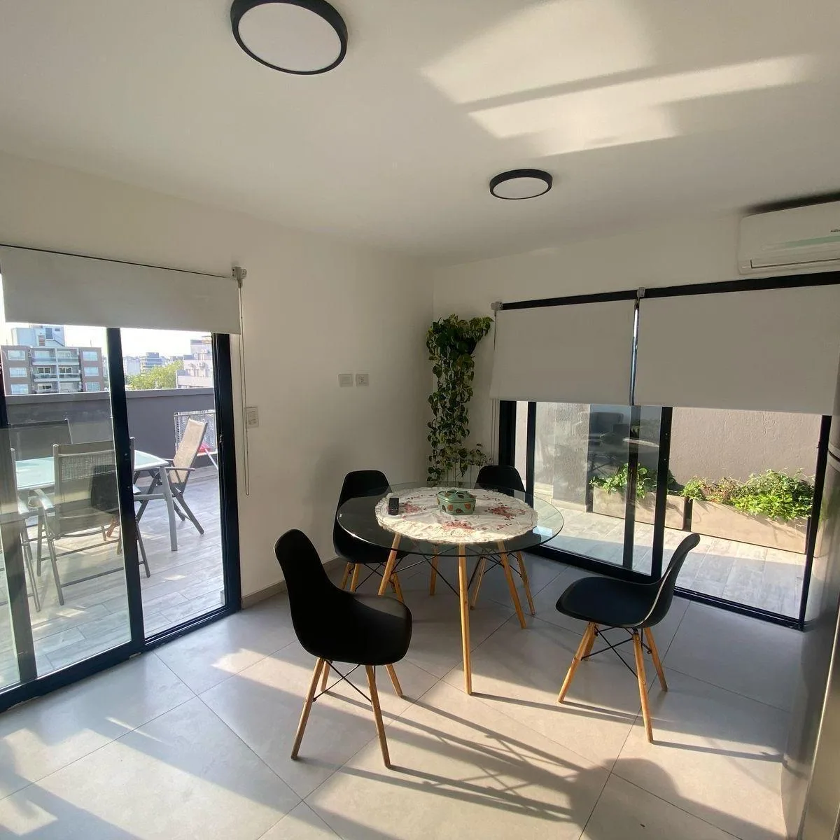 Apartamento de três ambientes em Morón, em pátio térreo (planta no térreo). Possui cozinha integrada com sala de jantar, 1 dormitório e lavabo. A sala tem janelas amplas com vista para pátio-terraço com área de churrasco. No primeiro andar, há 1 dormitório em suíte com banheiro completo e uma varanda corrida coberta. O imóvel conta com aquecimento por radiadores, piscina e quincho, além de vaga de garagem.