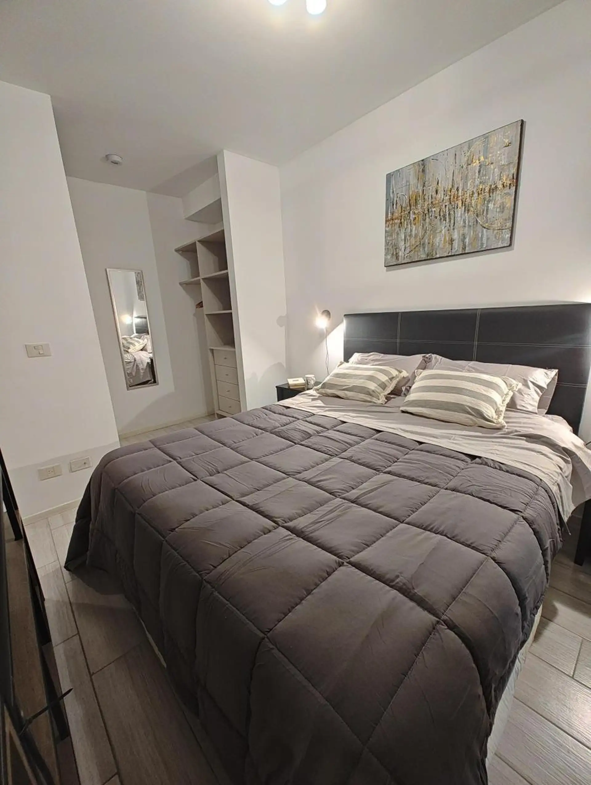 Apartamento tipo kitnet com 49 m² totais, sendo 46 m² cobertos, no 1º andar com elevador, de frente para a rua e orientação para o leste. Cozinha equipada com armários superiores e inferiores, um ambiente com nichos de armazenamento embutidos e 1 banheiro completo.