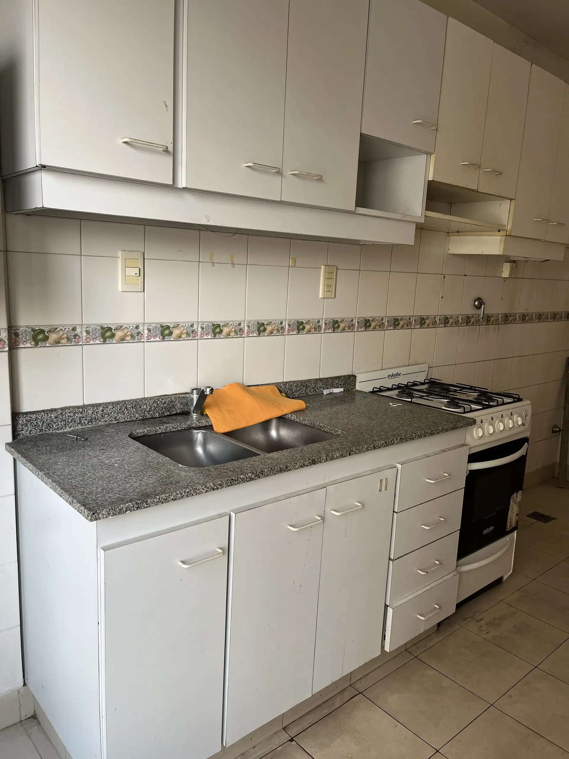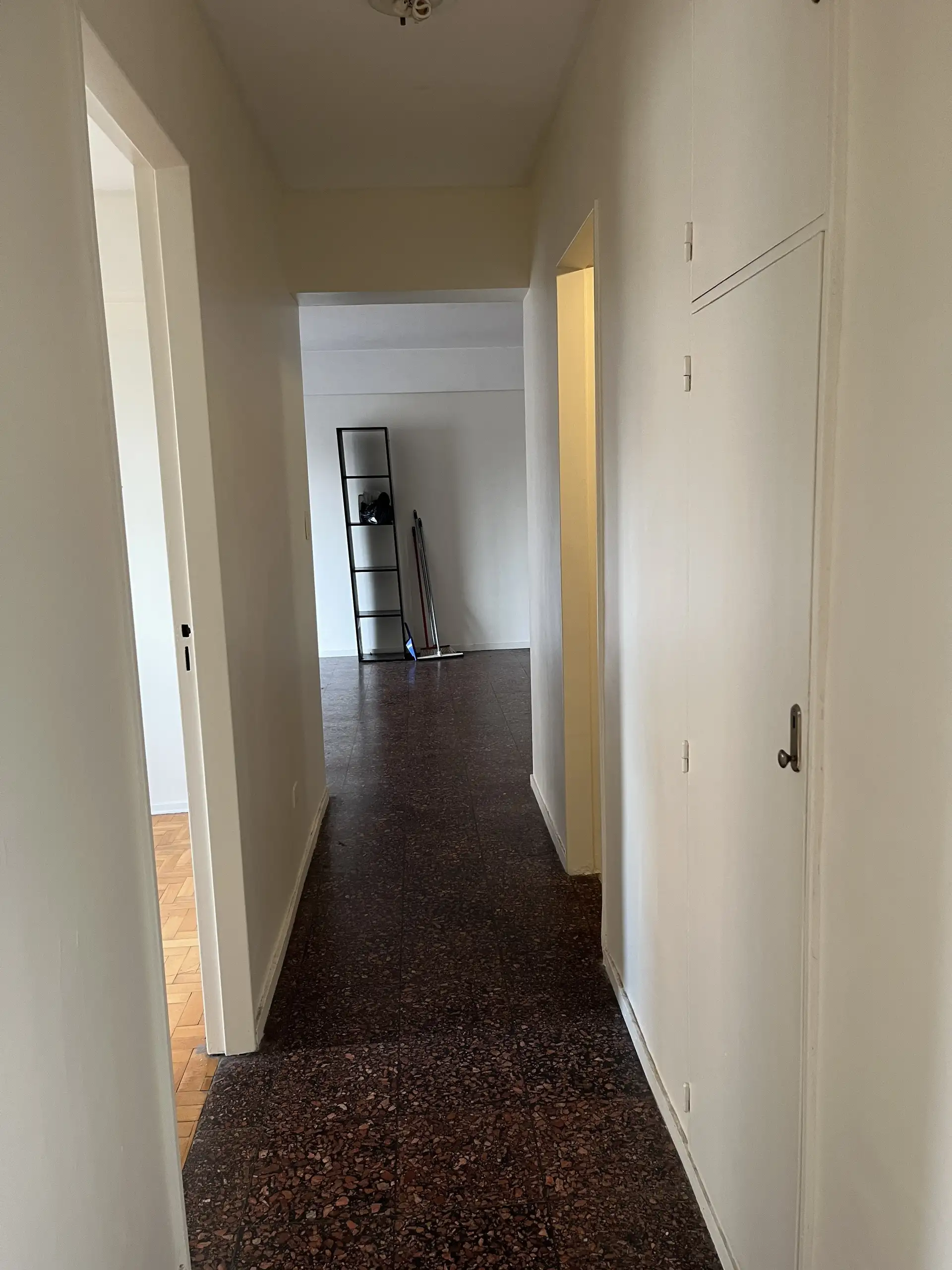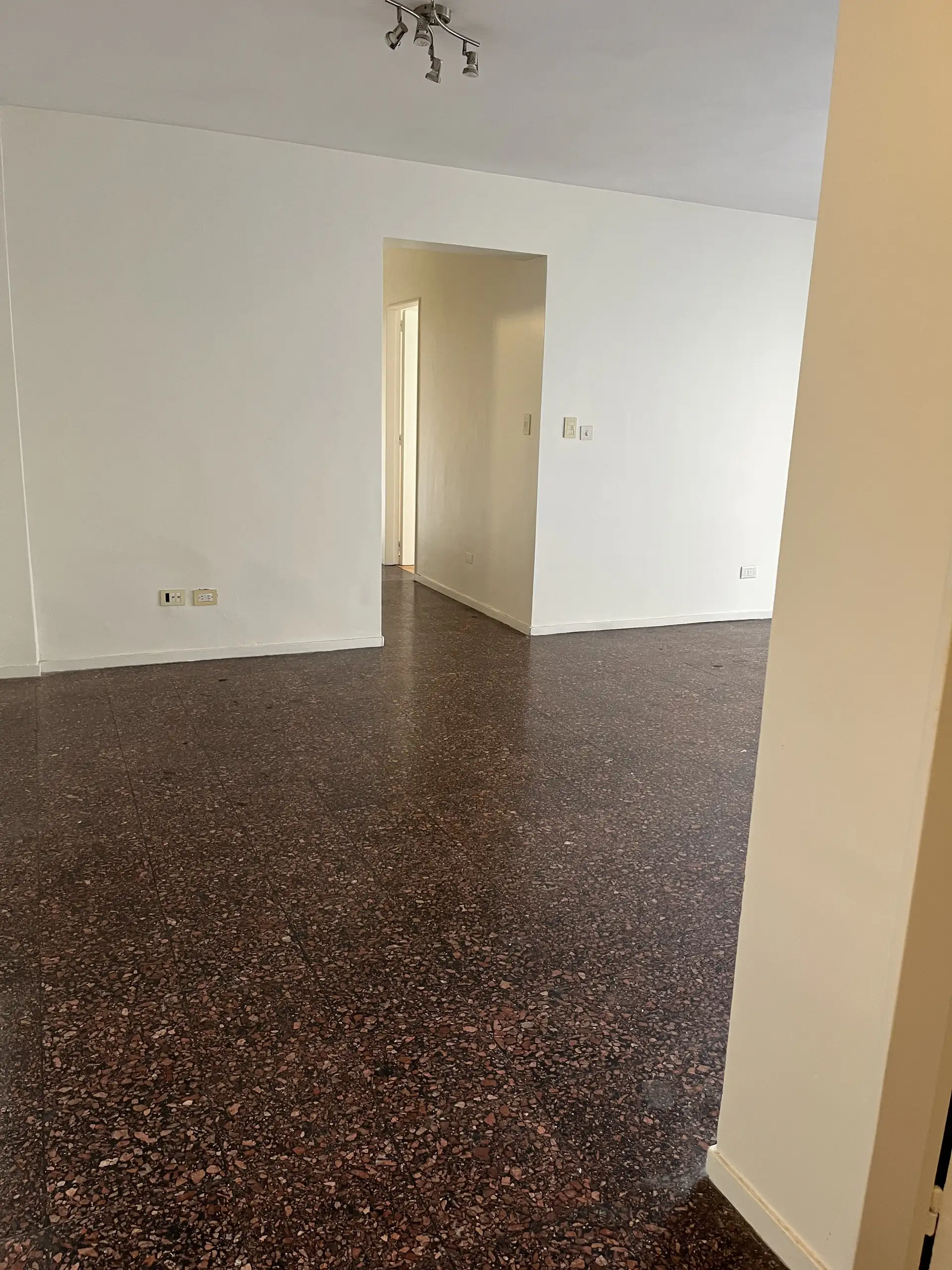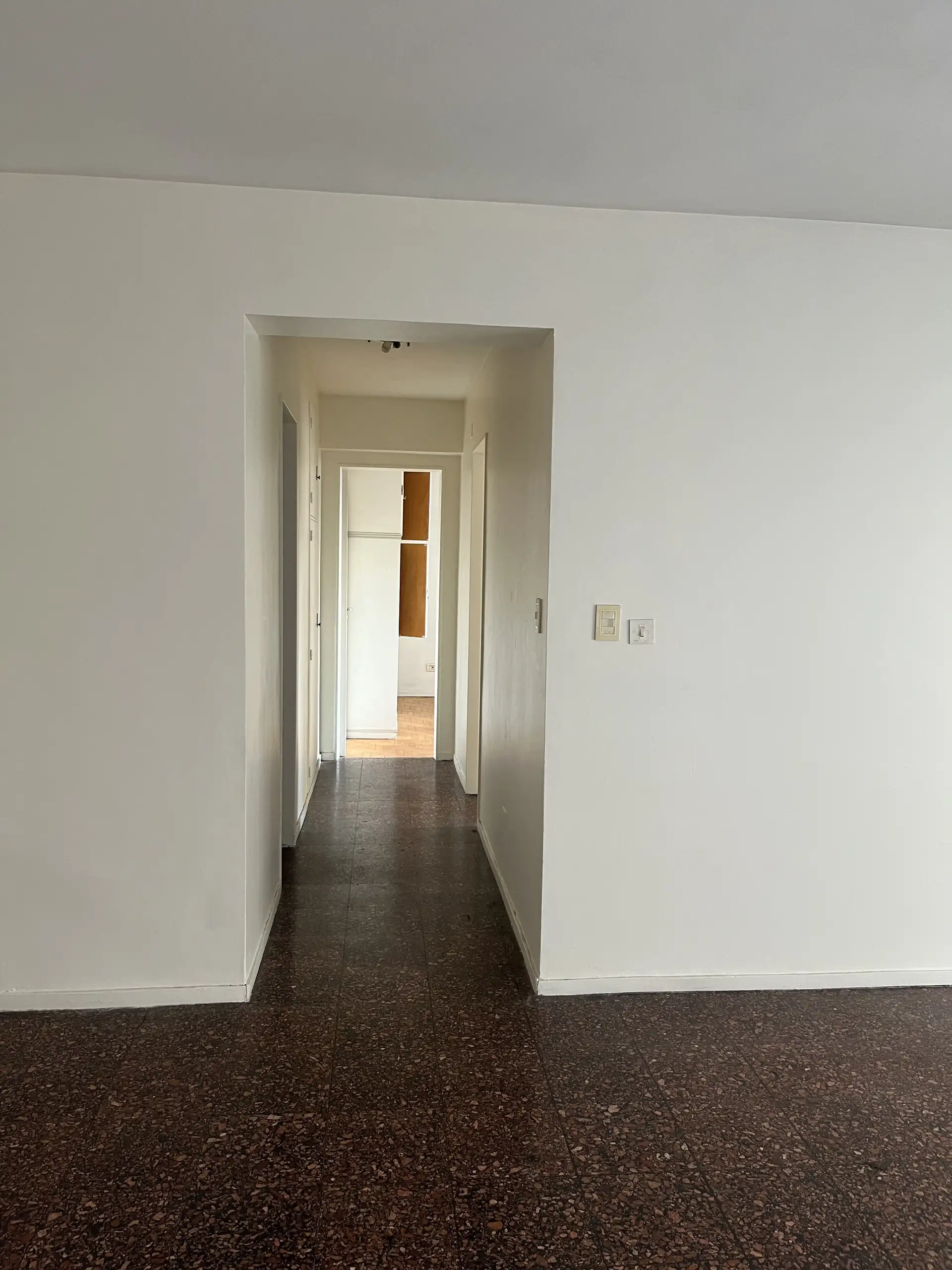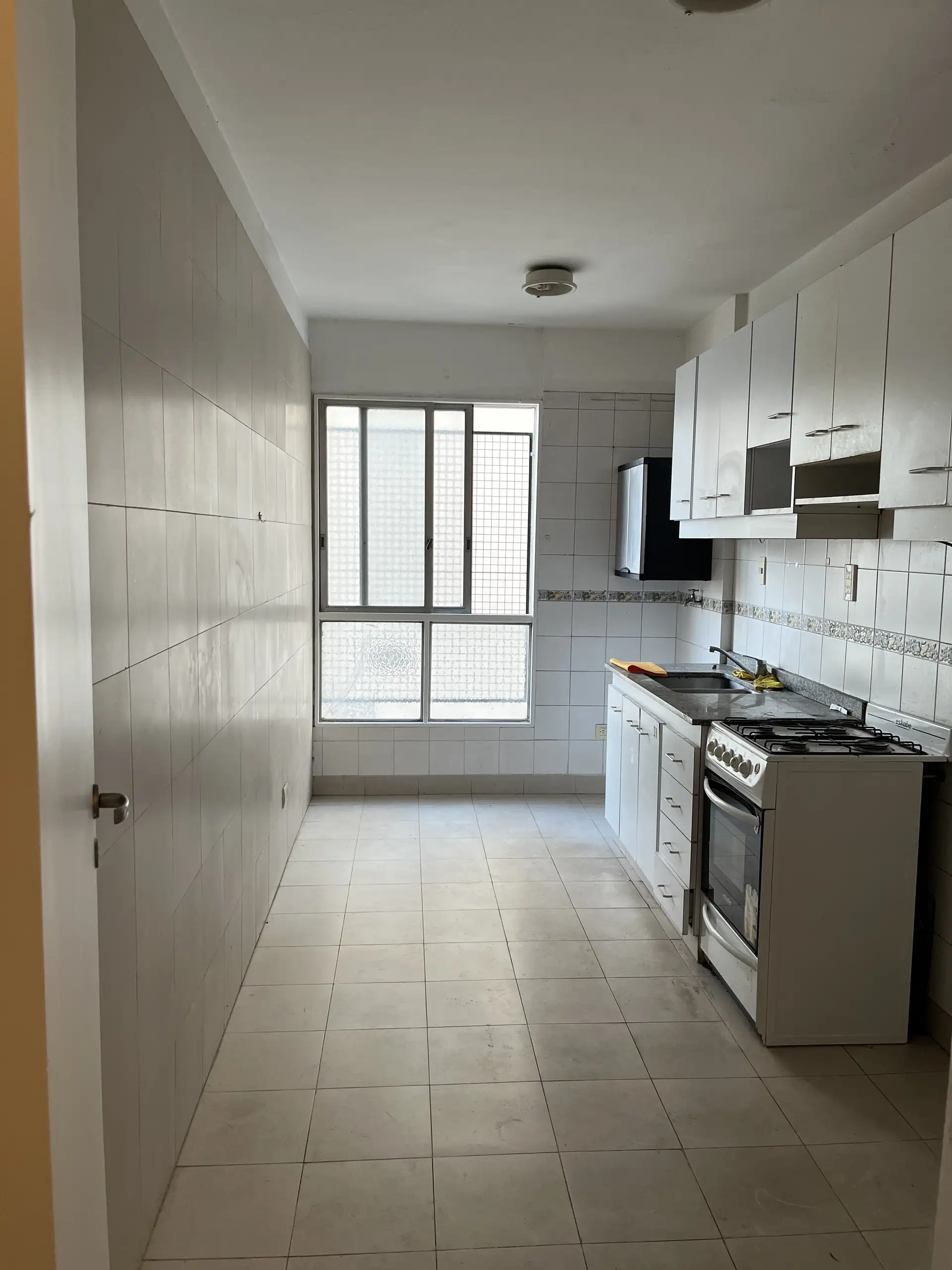 Apartamento no 7º andar com 75 m², orientação lateral e iluminação durante o dia. Conta com segurança 24 horas, 4 elevadores e rampas de acesso. Possui hall de entrada com armário embutido, cozinha de 6 x 2 com área de serviço integrada, sala de jantar e estar de 7 x 4,5 com varanda contínua estreita, dois quartos com armários embutidos (um deles com janela) e banheiro completo com banheira. Há um depósito (baulera) de 3 x 1,5 x 3. O aluguel mensal é de $750.000, com contrato de 24 meses e reaju