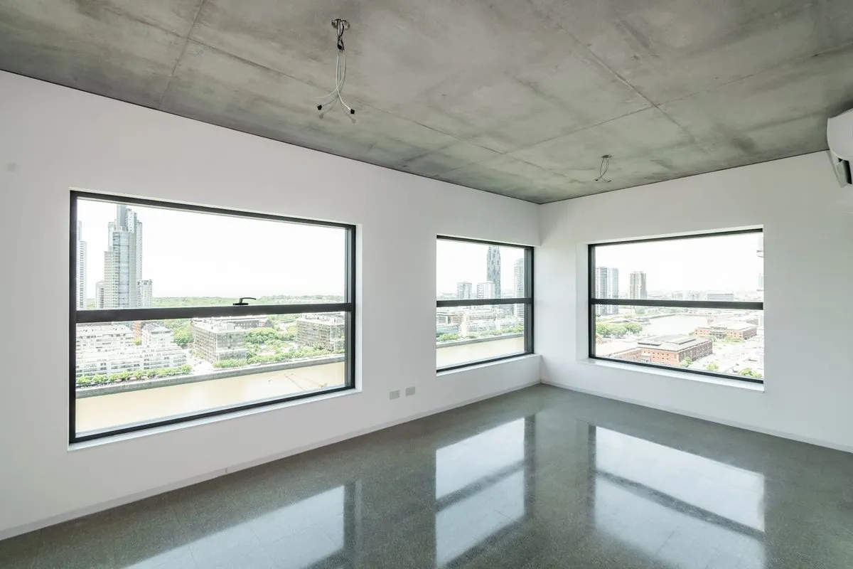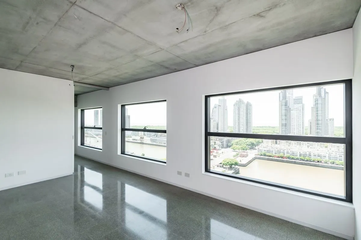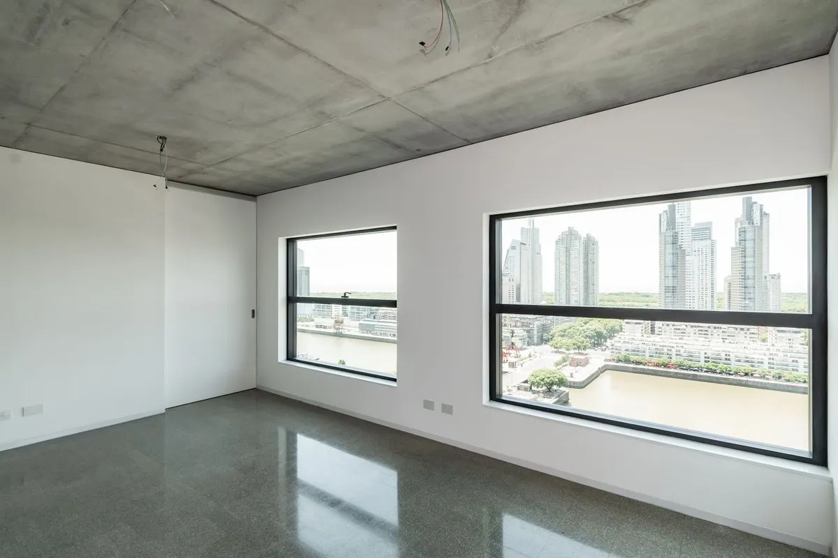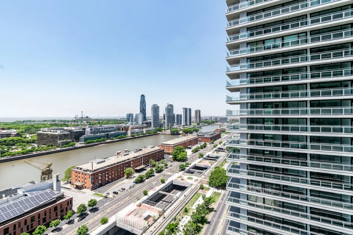Apartamento de 3 ambientes em Puerto Madero, no 21º andar, em esquina, com vista para o rio. Sala de estar e jantar com acesso a varanda contínua. Cozinha integrada com ilha para café da manhã; dormitório principal em suíte com banheiro; segundo dormitório; segundo banheiro completo. O edifício foi inaugurado oficialmente em novembro de 2025, tem 38 andares e 3 níveis de subsolo para vagas de garagem e depósitos, com segurança 24 horas e controle de acesso digital.