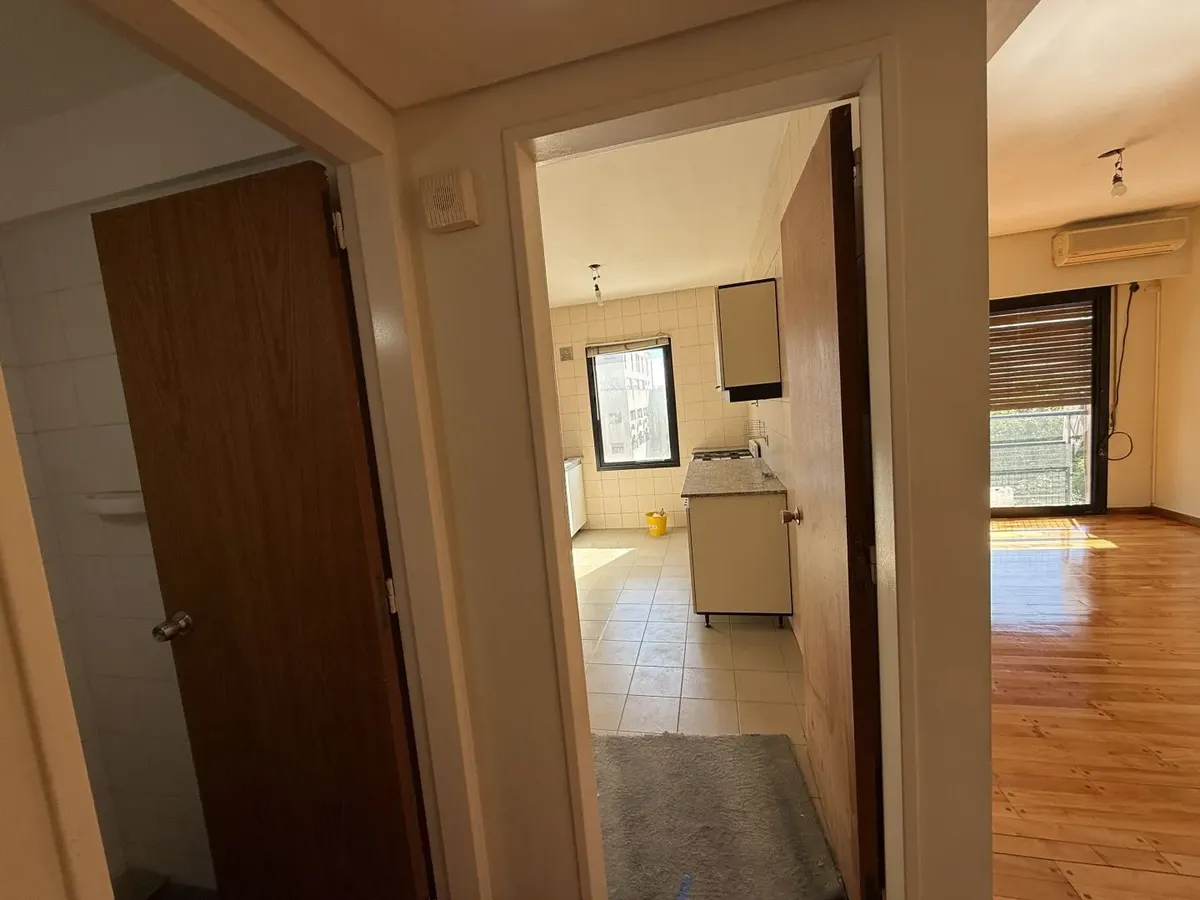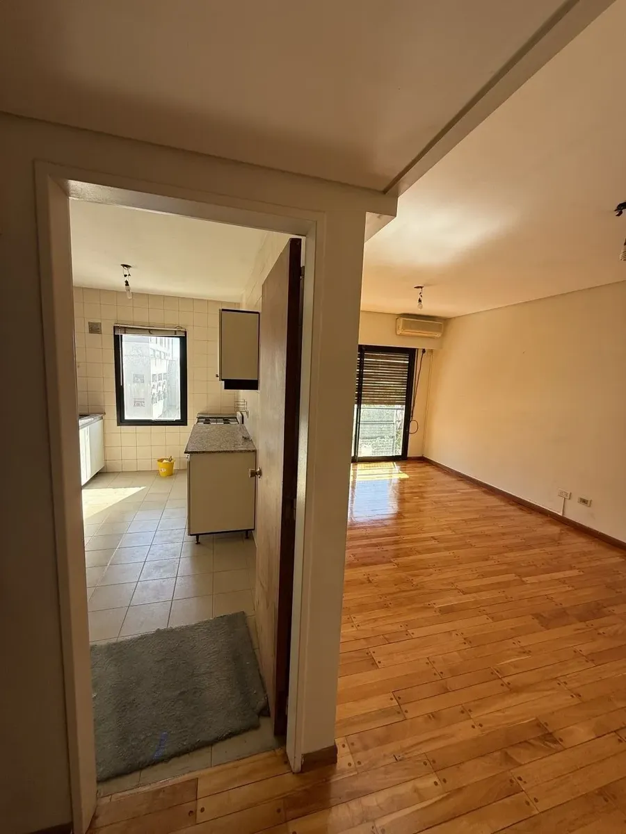 Apartamento de 3 ambientes em Quilmes Centro, com 2 dormitórios e banheiro completo. Fica no térreo? Não; piso não informado. Tem sala integrada com sala de jantar com piso de madeira tarugada, varanda francesa e ar-condicionado (frio) marca Toshiba, além de estufa a tiro balanceado marca EMEGE. A cozinha é mobiliada com fogão de 4 bocas Longvie e possui lavanderia. Há dois dormitórios com varandas francesas (um deles lateral) e varanda corrida no dormitório de frente, além de placards com inter