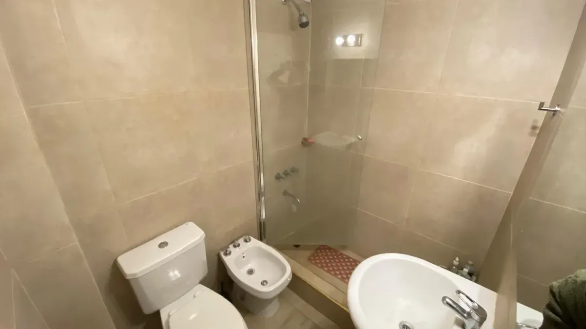 Apartamento residencial de 3 ambientes em Recoleta, com 2 quartos com armários e ventiladores de teto, um deles com ar-condicionado frio e quente. Há 1 banheiro completo renovado com box e sala de estar e jantar com ar-condicionado frio e quente, além de móveis para TV. Cozinha moderna com fogão a gás, forno elétrico embutido e coifa retrátil, com balcão corrido nos fundos, ventilação cruzada e boa entrada de luz natural. O imóvel foi recentemente reformado, com instalações elétrica e hidráulica