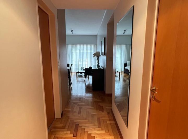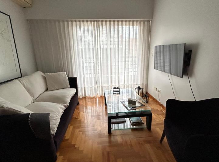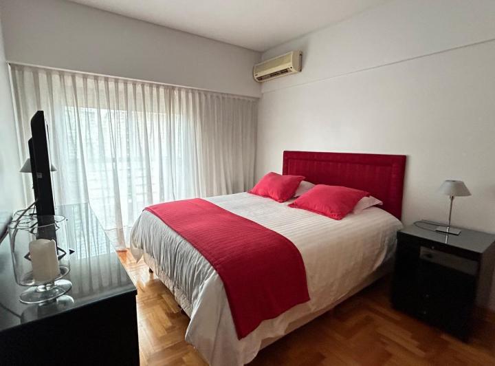 Apartamento de 3 ambientes com 2 dormitórios no piso alto, de frente para a rua, com varanda corrida. Possui living com área de jantar, cozinha, lavadero, banheiro completo e lavabo. Está totalmente mobiliado e equipado, com lava-louças, máquina de lavar roupa, freezer, geladeira com freezer, micro-ondas e TVs nos dormitórios e na sala. Conta com ar-condicionado frio/quente e pisos de parquet. O prédio tem elevador e segurança com câmeras na entrada e portaria com circuito interno.