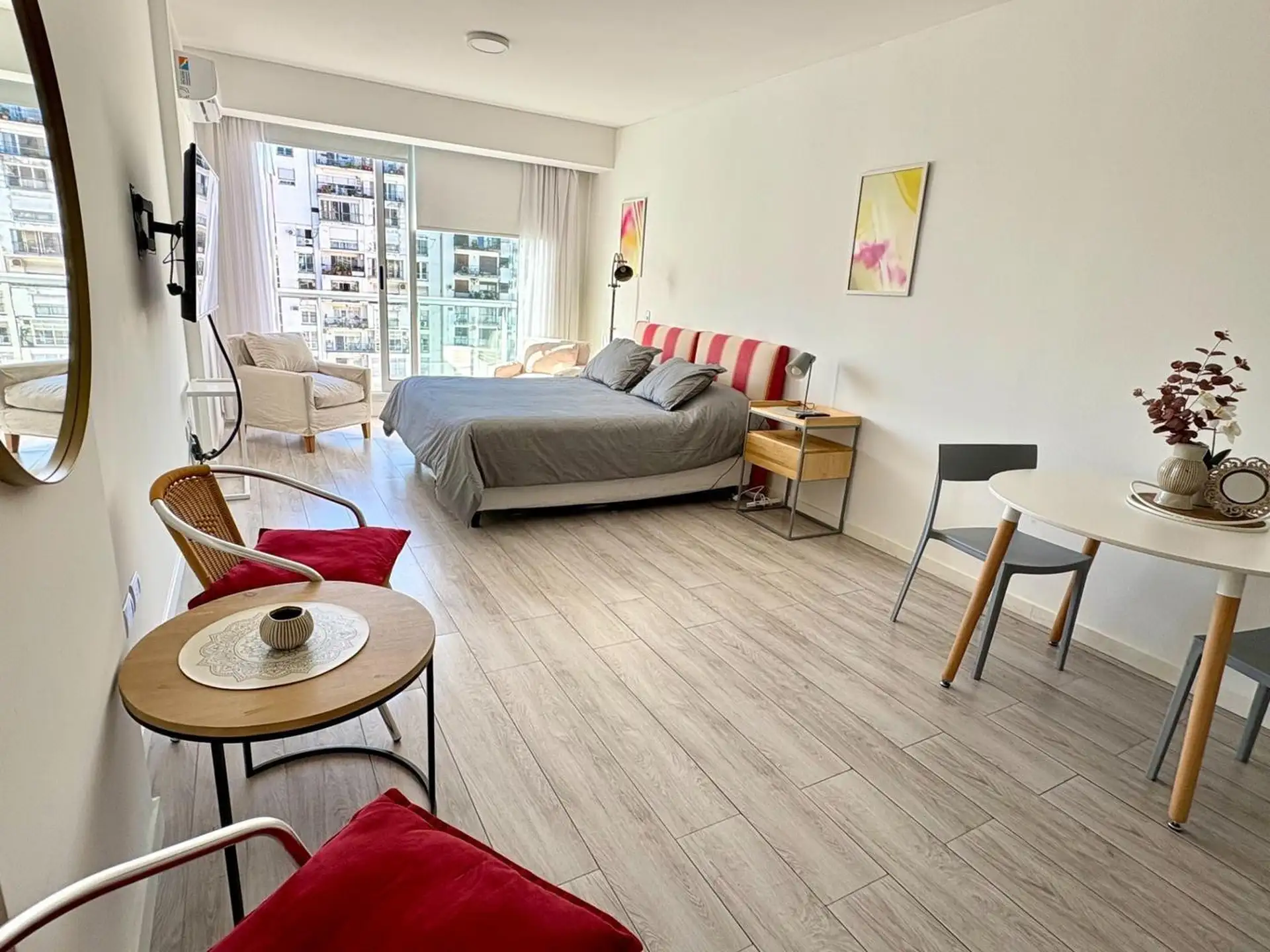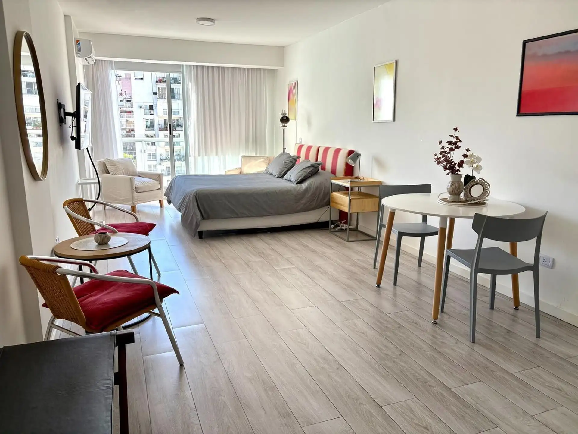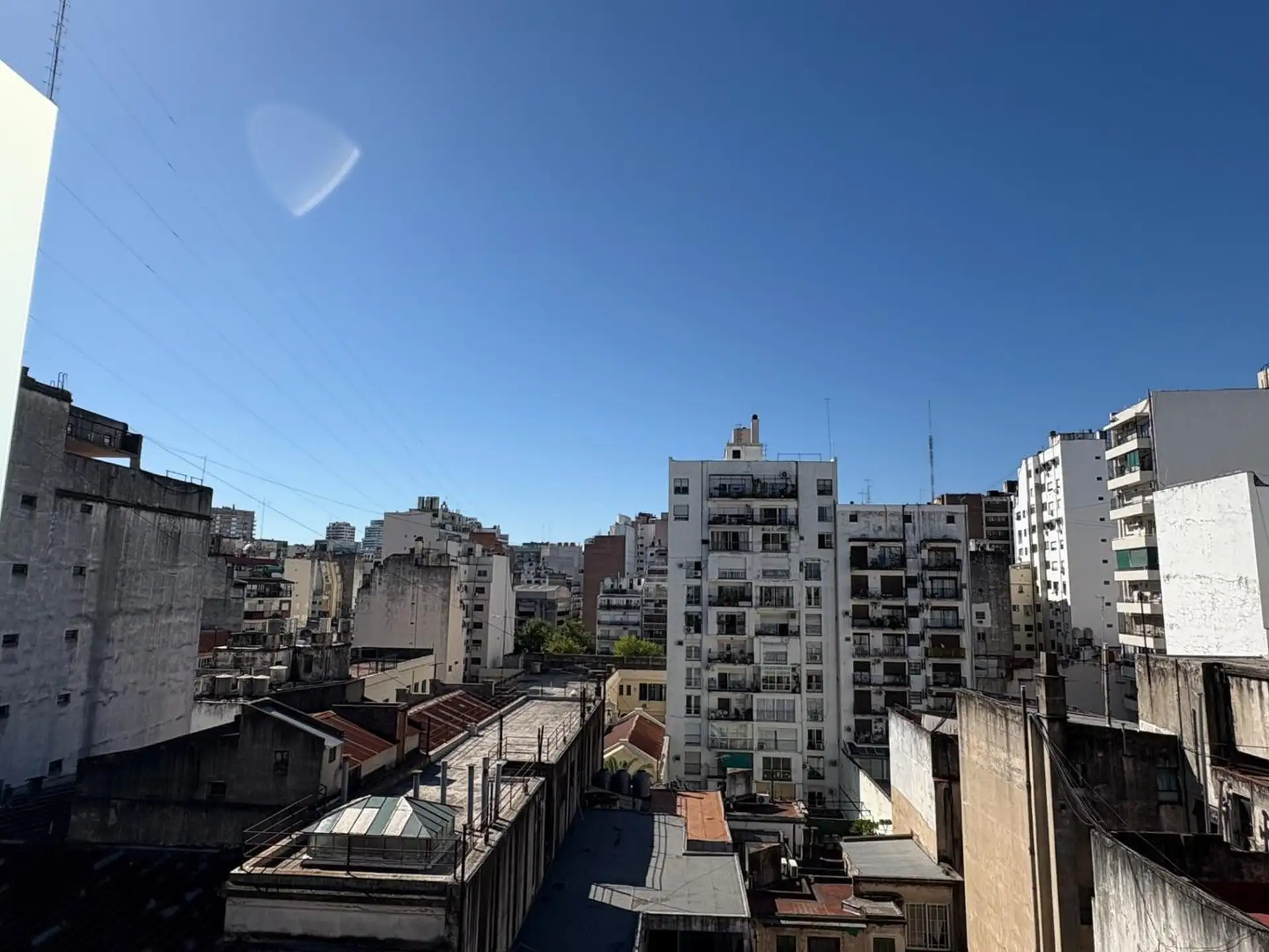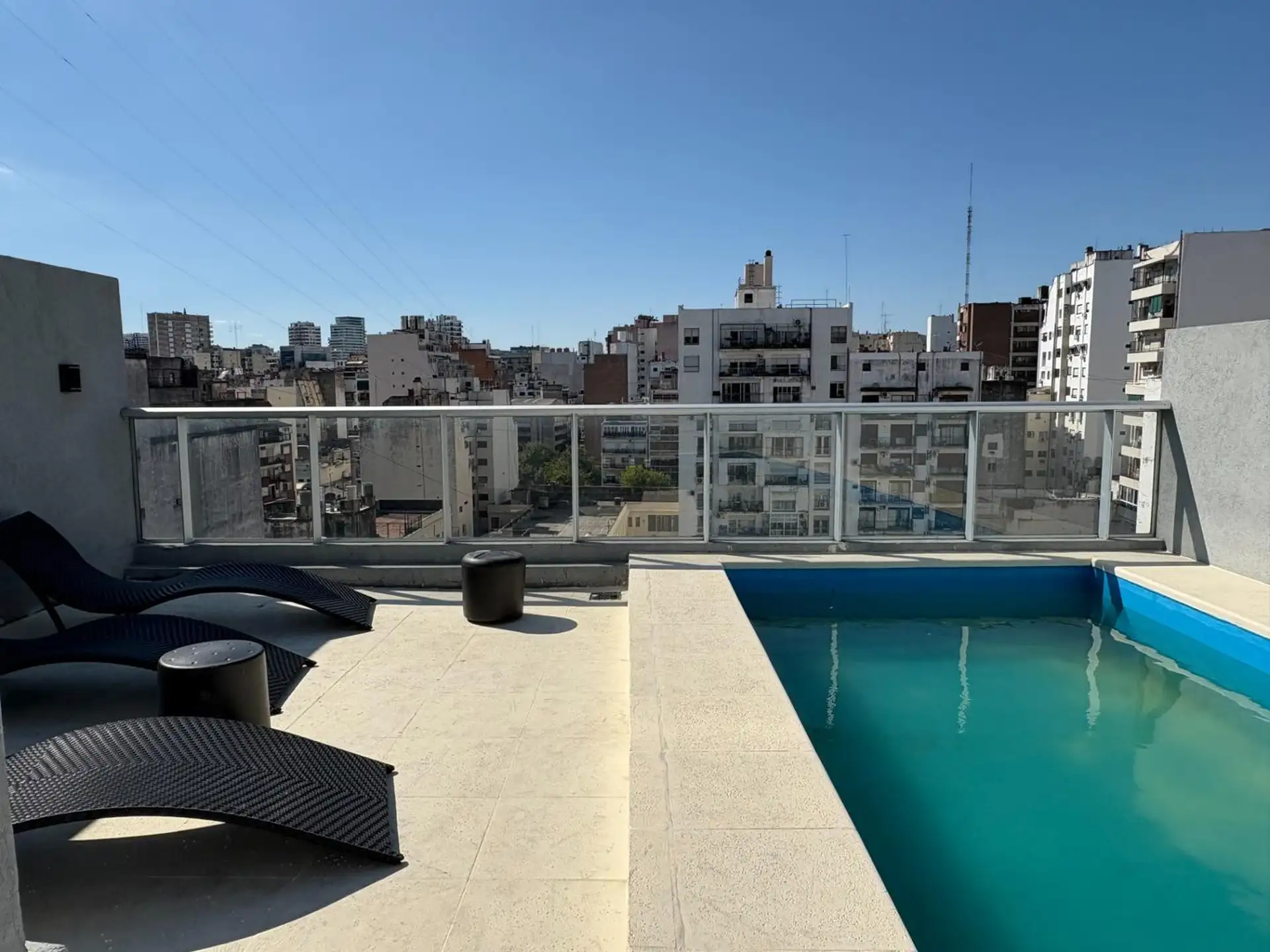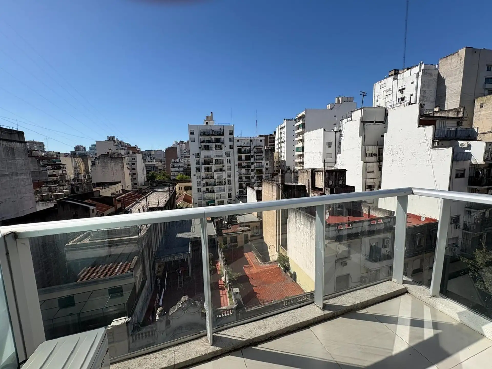 Studio mobiliado em Recoleta, no alto andar, com balcão e vista aberta. Área principal de 7,20 x 4 m, com cozinha integrada e dupla cuba em aço inox, além de bancada de granito. Conta com ar-condicionado frio e quente e água quente central; banheiro com bancada de mármore e cuba cerâmica, além de armário. O prédio tem lavanderia, terraço com área de churrasco, solarium e piscina de 20 m x 2,5 m. A localização fica na rua Paraguay entre Av Pueyrredón e Ecuador.