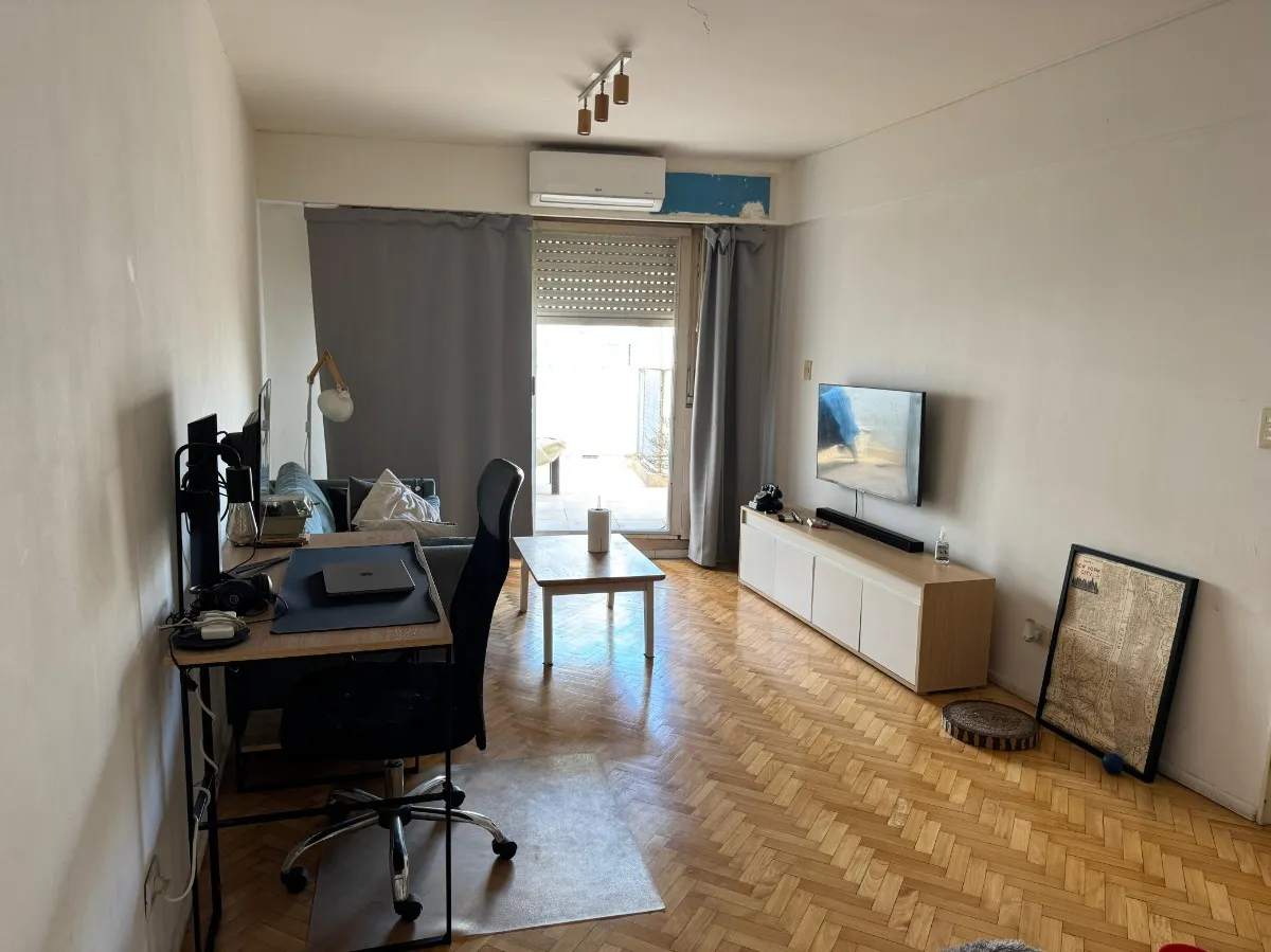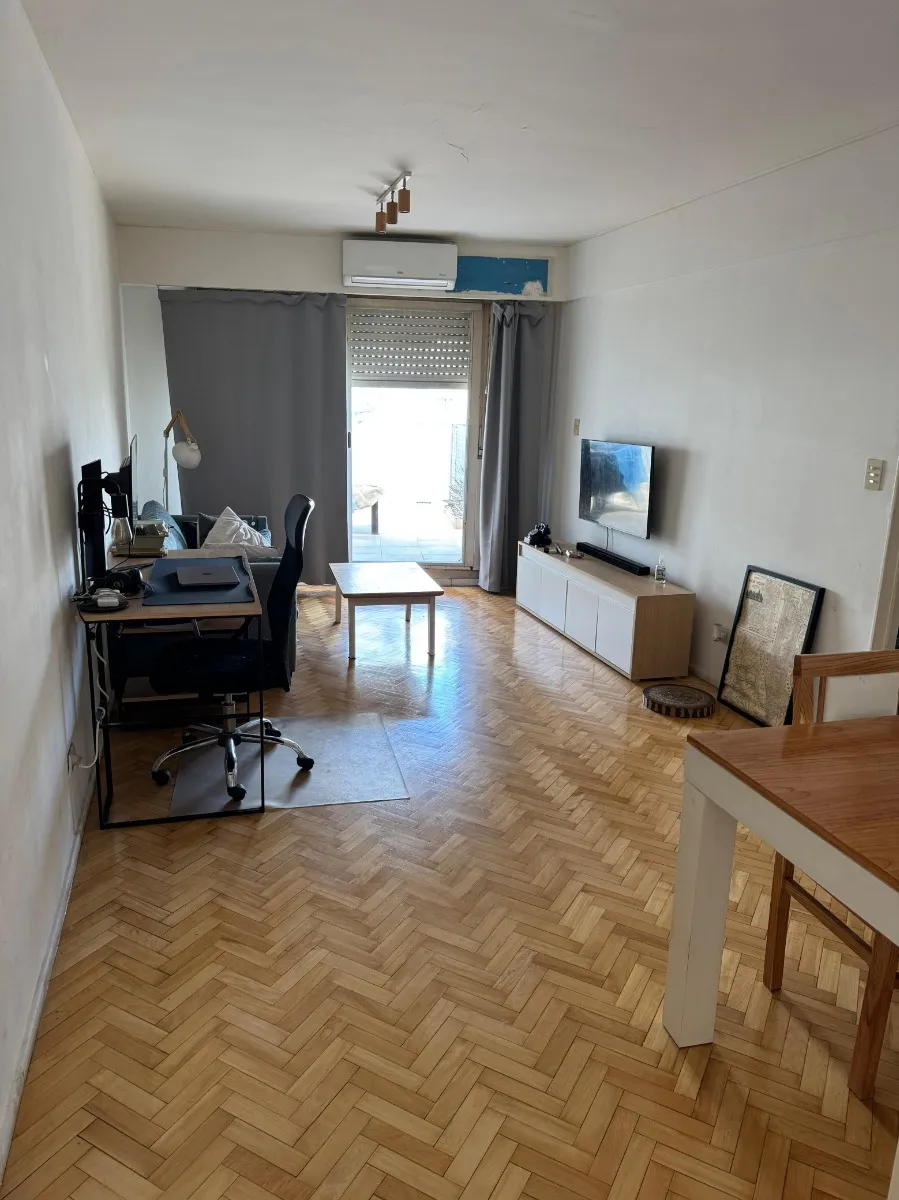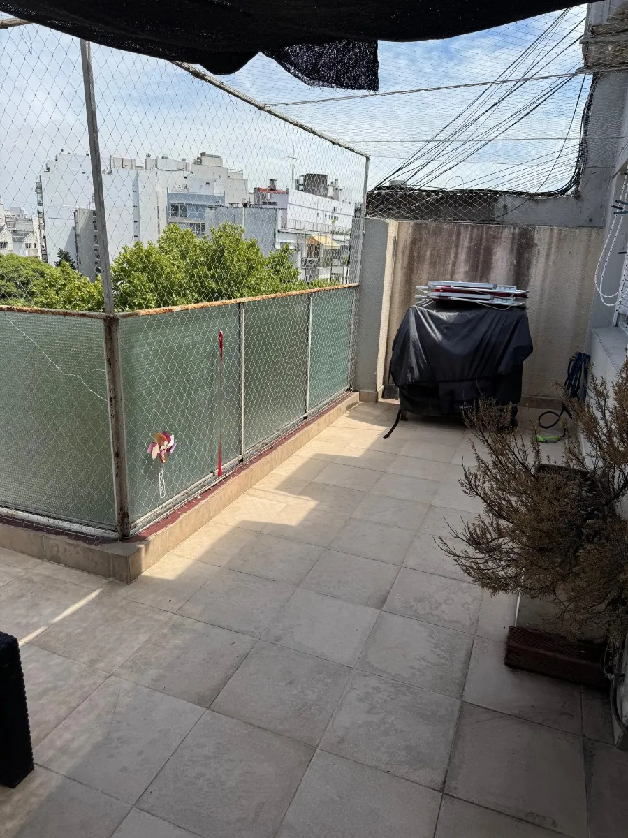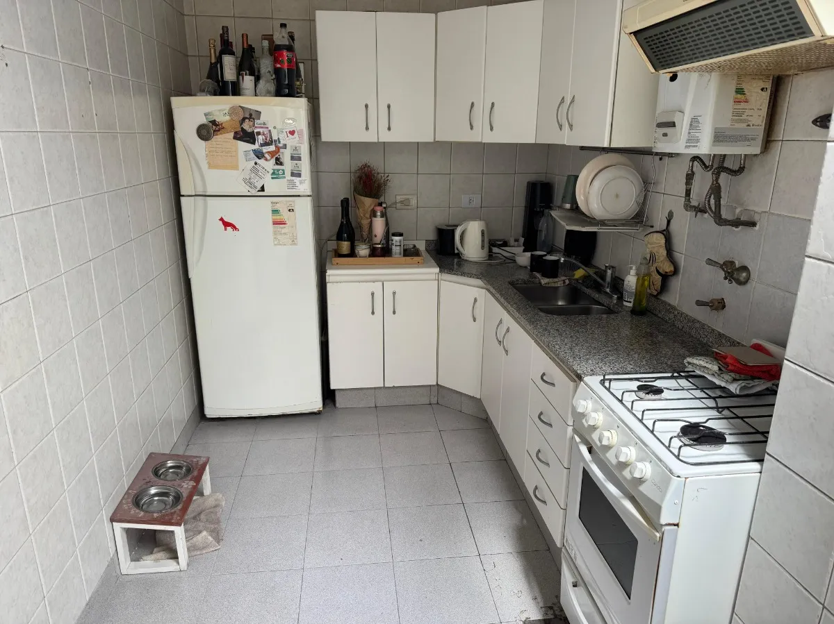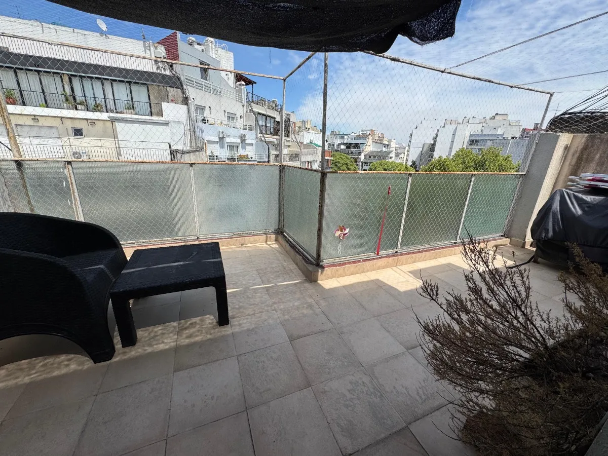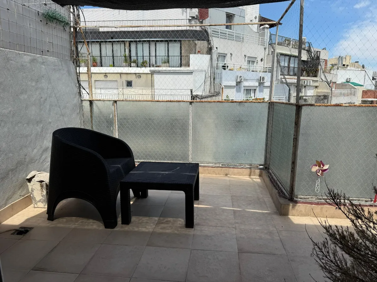 Apartamento de 2 quartos com terraço e área de churrasco, no 8º andar, de frente para a rua, em Recoleta. O living e a área de jantar têm acesso ao terraço com plantas e churrasqueira; há 2 dormitórios com armários. Piso em parquet plastificado, pintura em bom estado e banheiro completo reformado. Cozinha ampla com espaço para geladeira grande e fogão a gás de 4 bocas, com muitas alacenas e espaço para mesa de café da manhã. Aquecimento por piso radiante e água quente por aquecedor (calefón). In