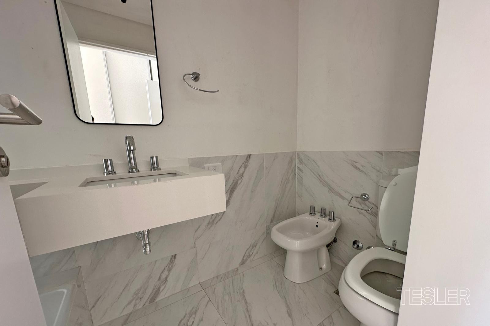 Apartamento com sala de estar e jantar, 2 dormitórios em suíte, sendo a suíte principal com closet, além de 2 banheiros completos e lavabo. Cozinha integrada e área de serviço, com vaga de garagem fixa. O prédio oferece segurança 24 horas, piscina, salão de festas com área de churrasco, academia e cowork; aluguel mais despesas.