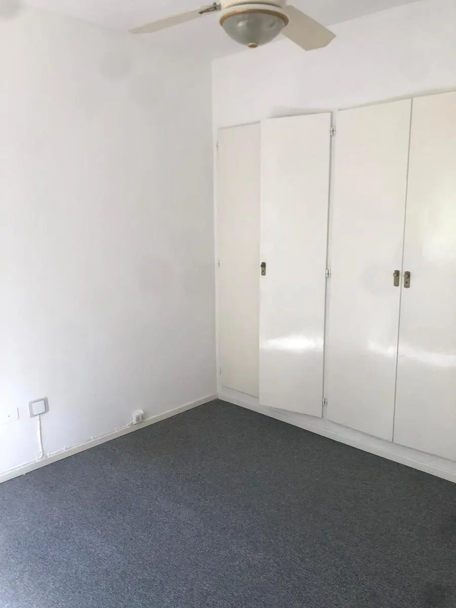 Apartamento de 3 ambientes com 2 dormitórios, varanda e pisos de carpete. Os dormitórios têm armários embutidos. O banheiro é completo, com box e ventilação própria; a cozinha tem armários inferiores e superiores. Inclui vaga de garagem coberta e fixa. Não aceita animais.